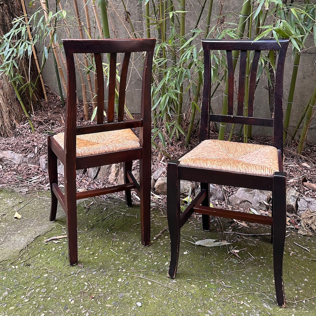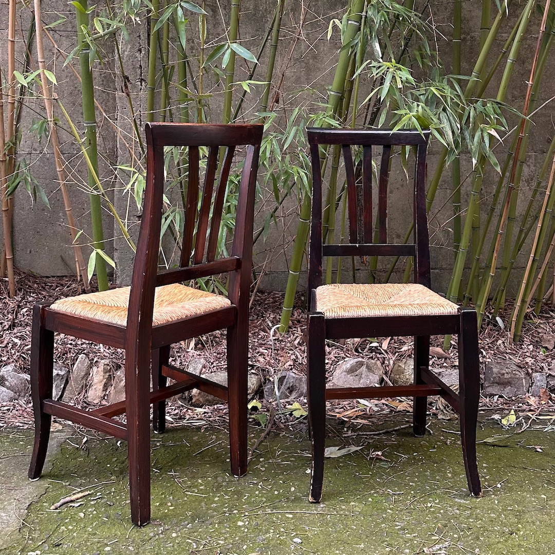 Coppia di sedie a stecche in noce a patina bruna seduta in vimini. Toscana 1940 circa