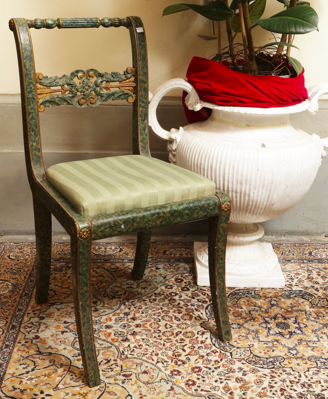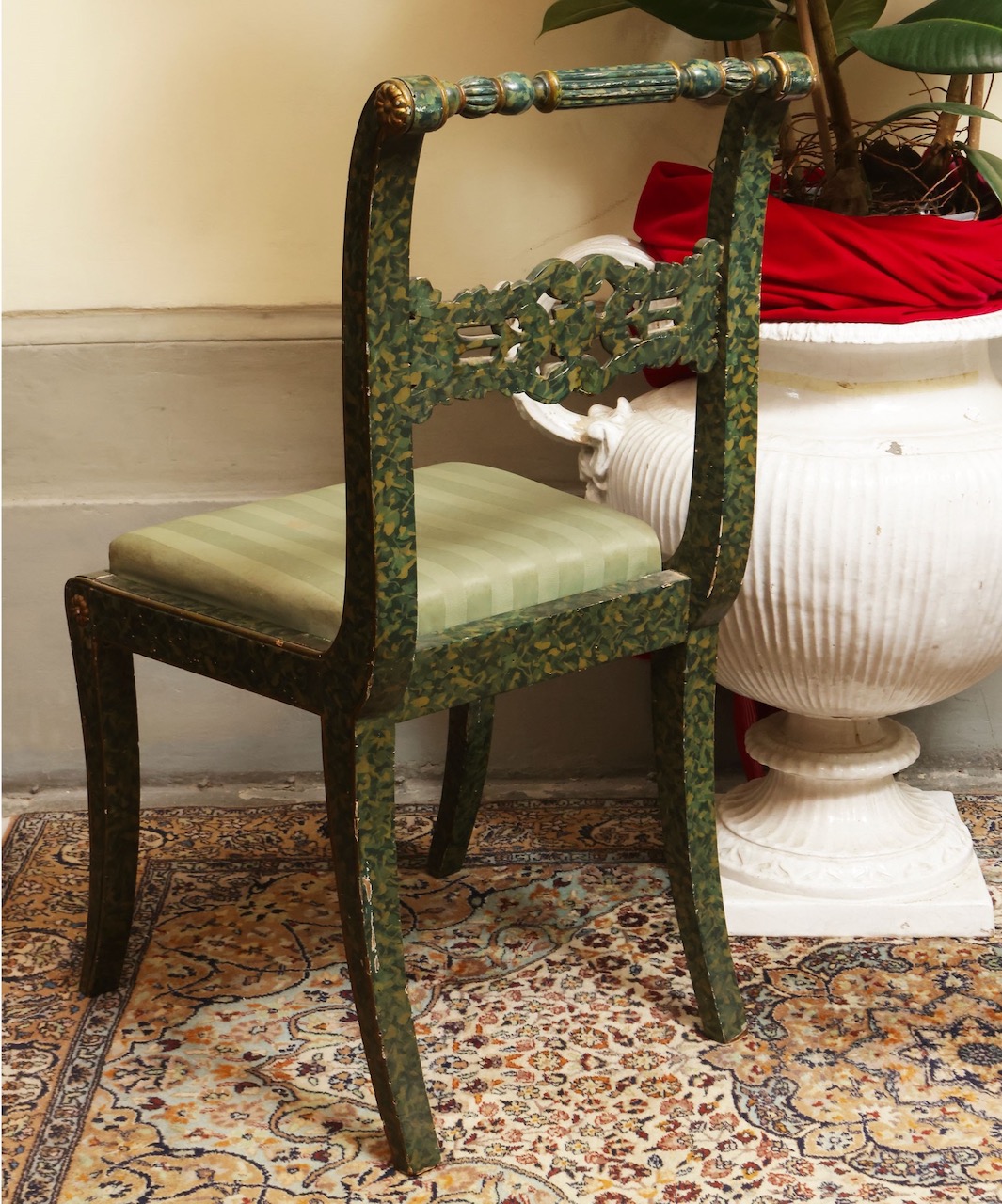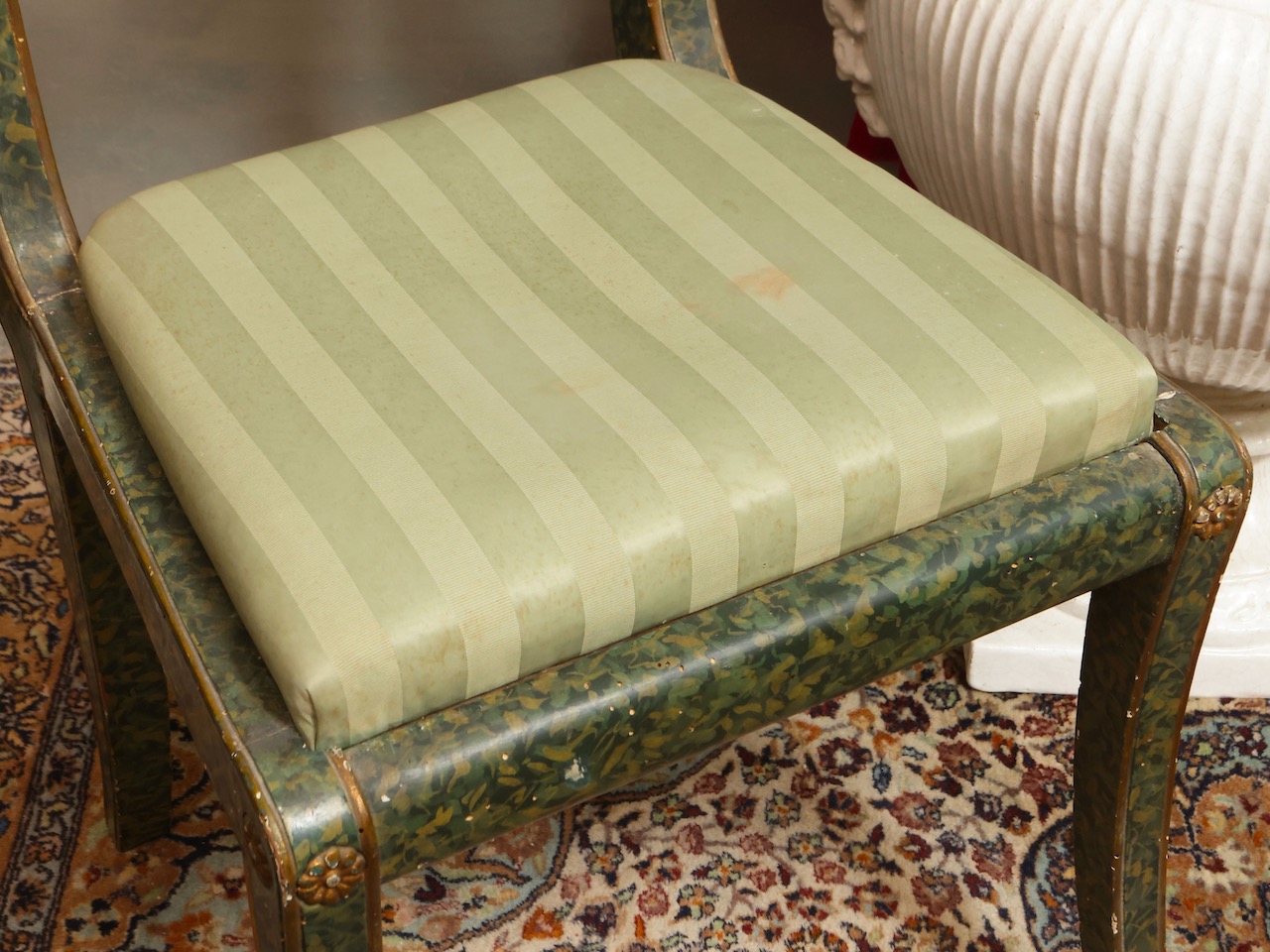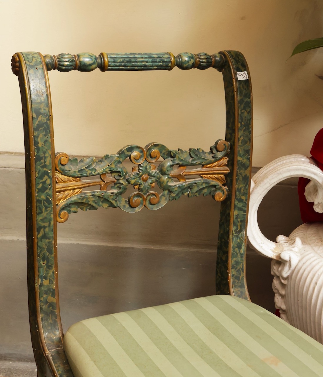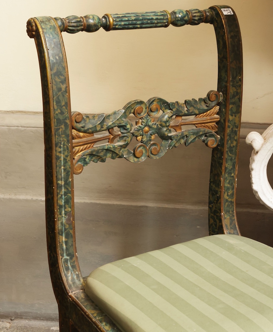 Coppia sedie in legno laccato malachite, schienale traforato con rosone floreale centrale tra volute e foglie d'acanto, seduta rivestita in seta rigata nei toni del verde chiaro, gambe lievemente a sciabola. Italia, sec. XX