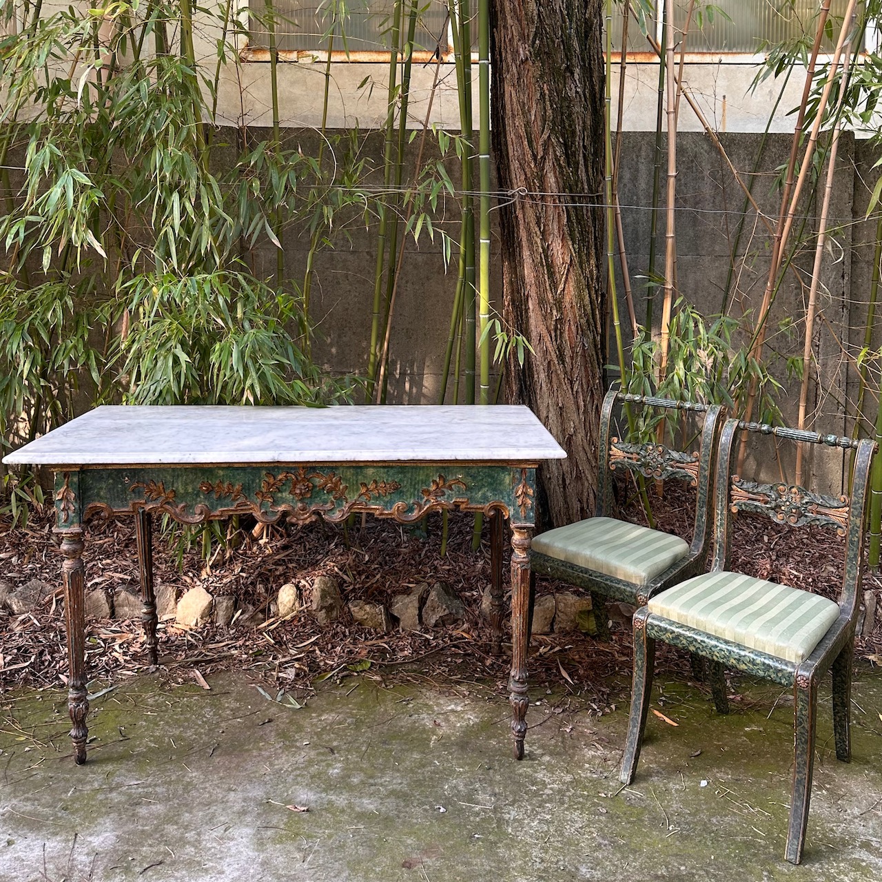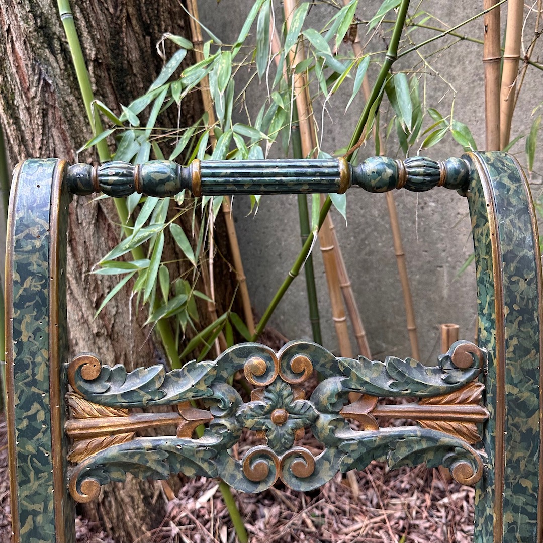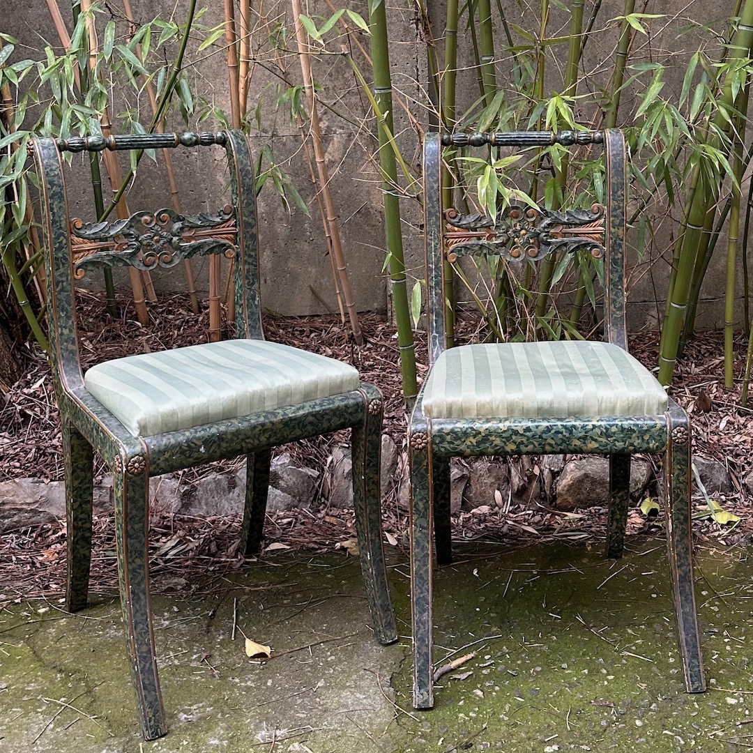 Coppia sedie neoclassiche in legno laccato malachite, schienale traforato con rosone floreale centrale tra volute e foglie d'acanto, seduta rivestita in seta rigata nei toni del verde chiaro, gambe lievemente a sciabola. Italia, sec. XIX