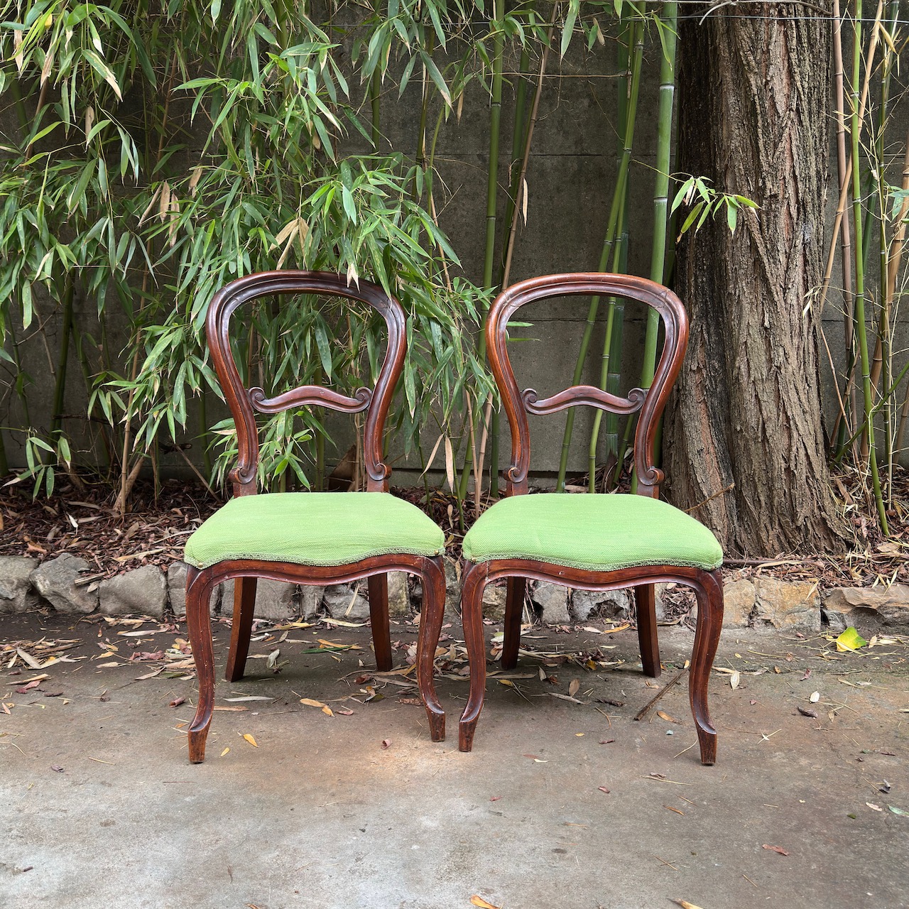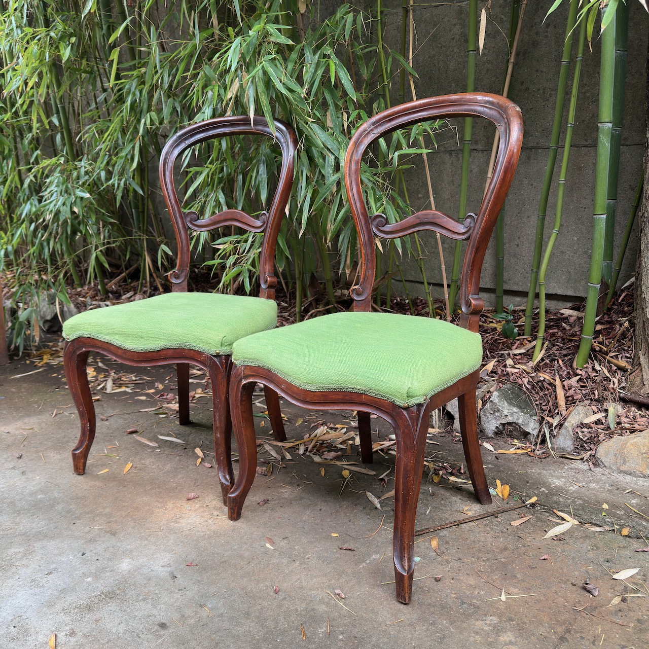 Coppia sedie Luigi Filippo in noce, gambe a capriolo, seduta in tela di cotone verde mela e bordino gros-grain. Italia, sec. XX