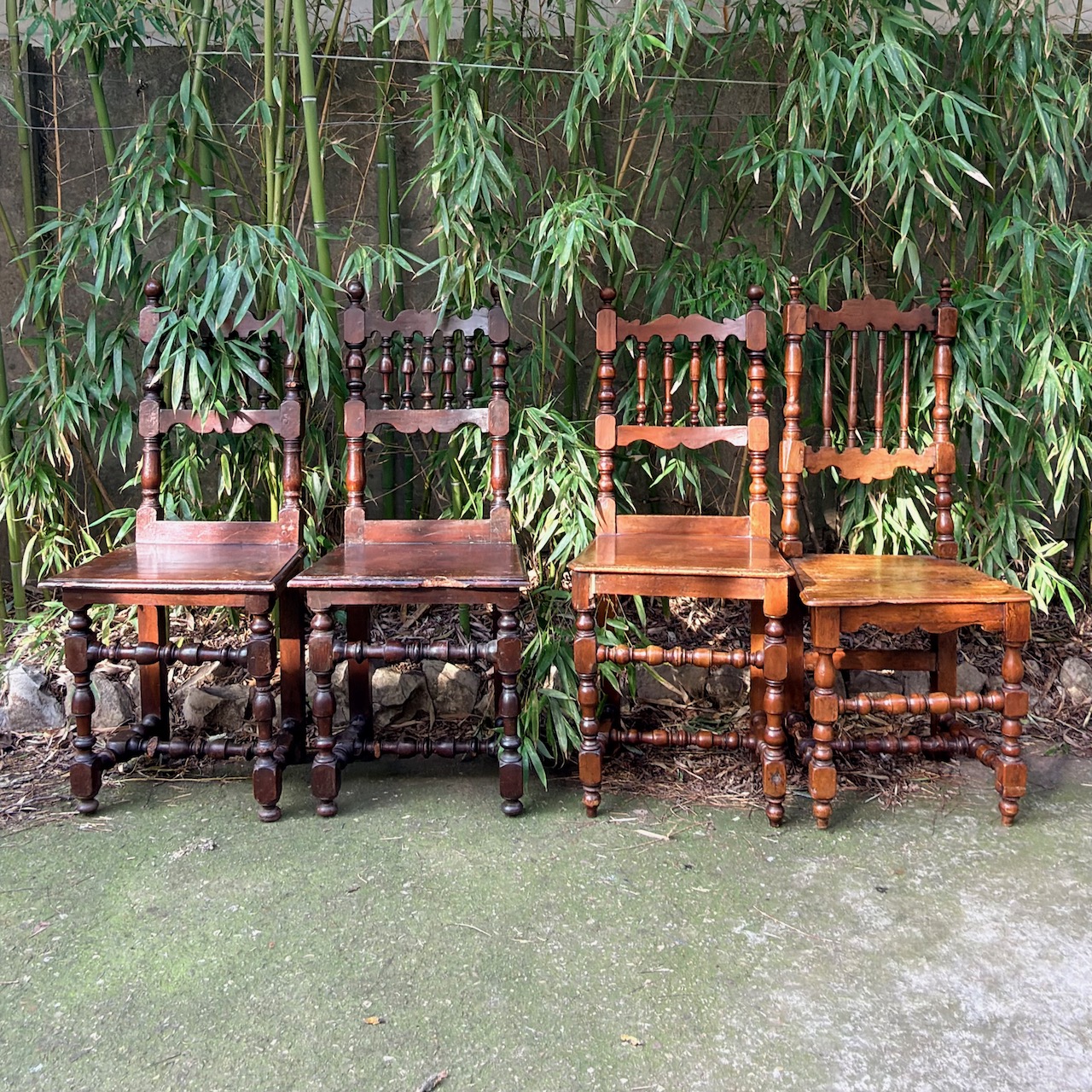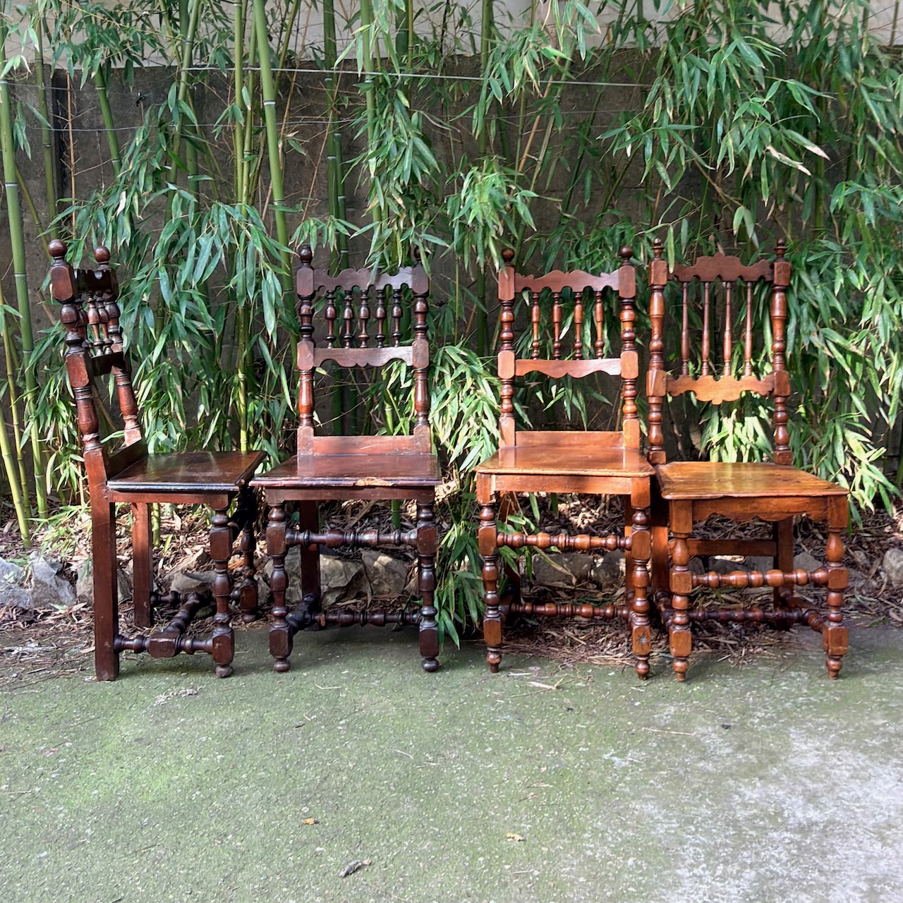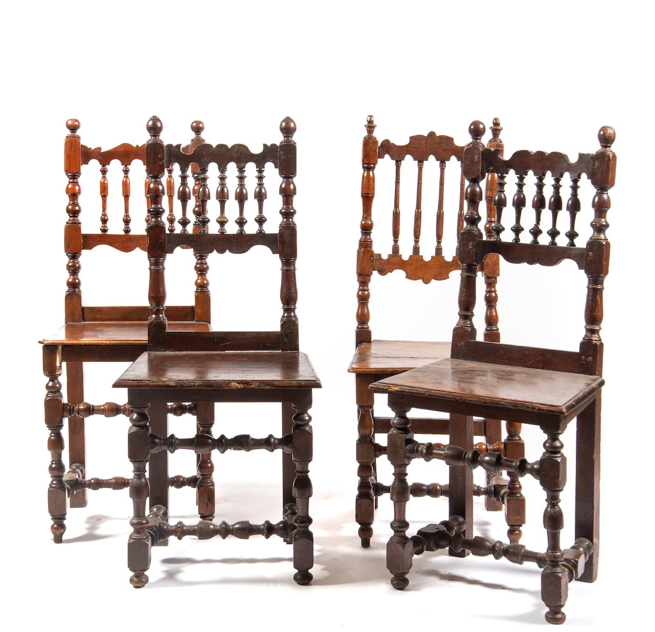 Quattro sedie senesi a rocchetto in noce, spalliera a birilli. Italia, sec. XVIII