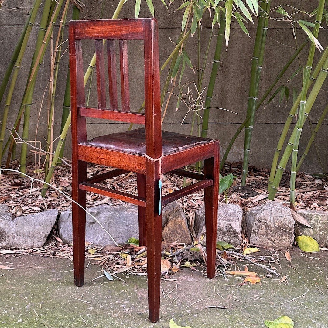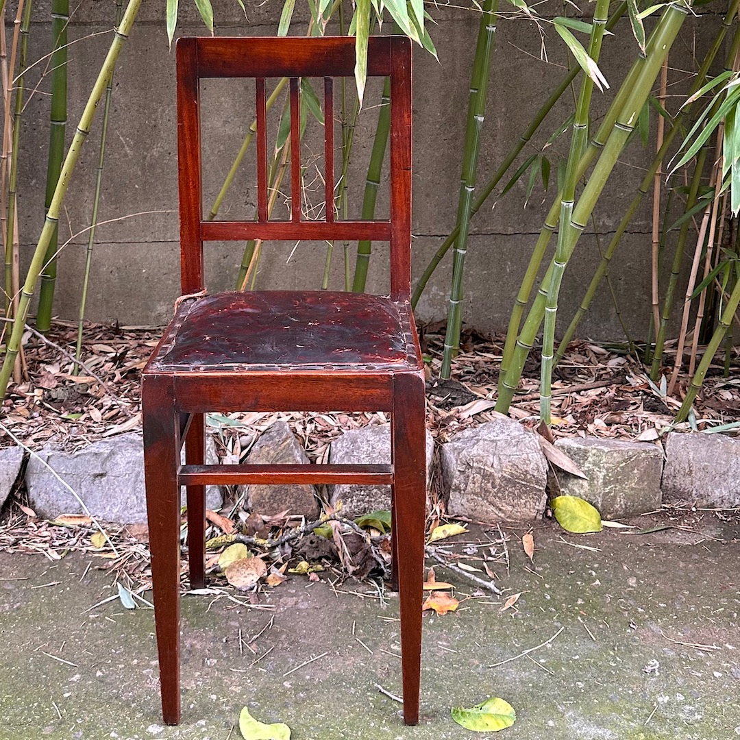Sedia a stecche in legno di mogano a patina bruna con seduta in pelle con guarnizione chiodata. Italia, 1910