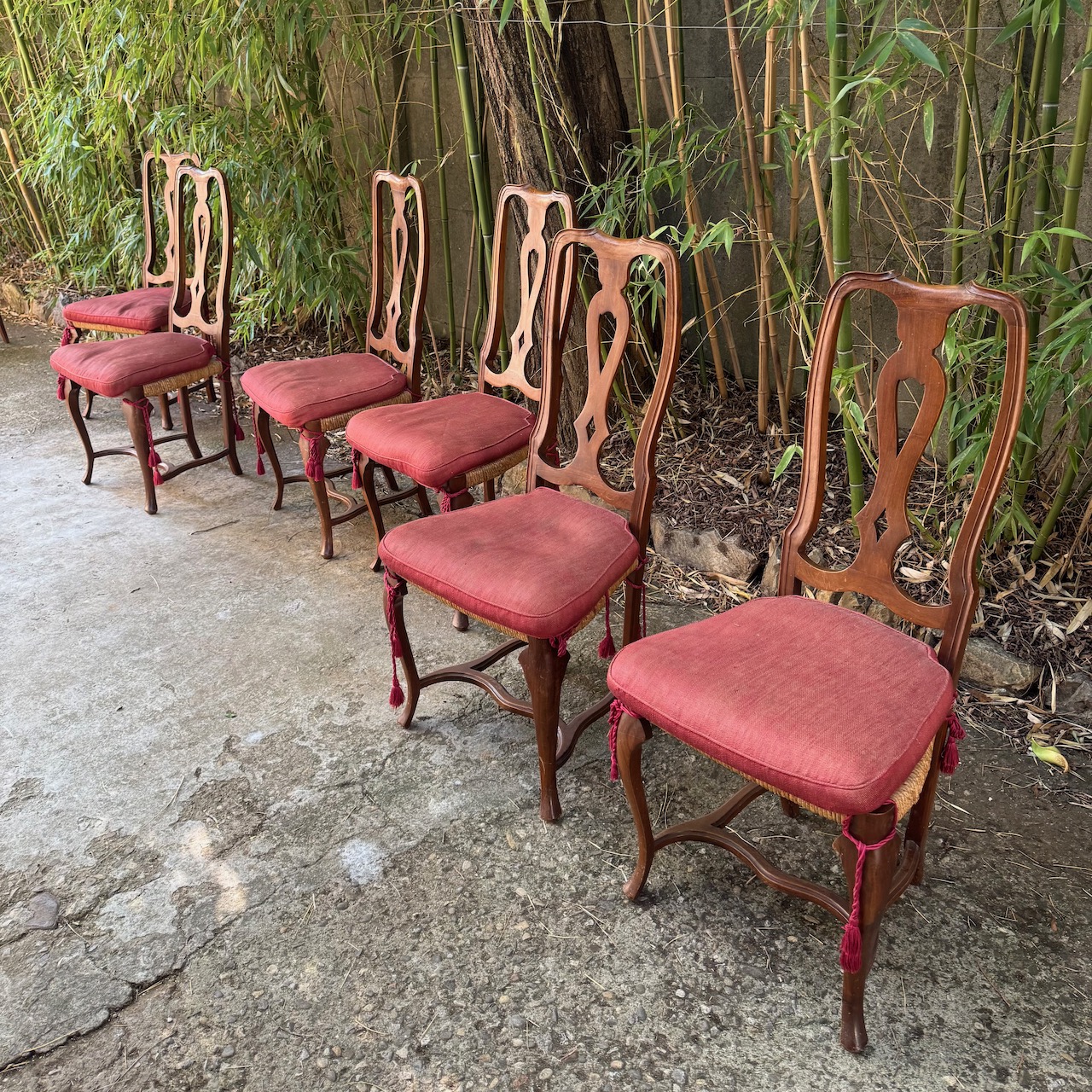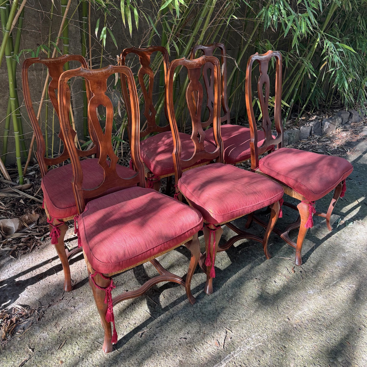 Sei sedie Queen Anne in noce, seduta impagliata, cuscino in lino lampone con nappe. Italia, sec. XX