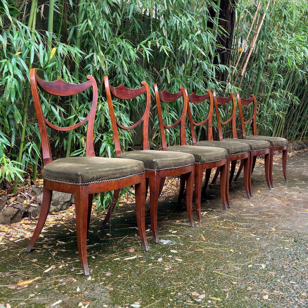 Sei sedie periodo Direttorio, in noce, gambe anteriori dritte e posteriori a sciabola, seduta in velluto oliva. Italia, fine sec. XVIII