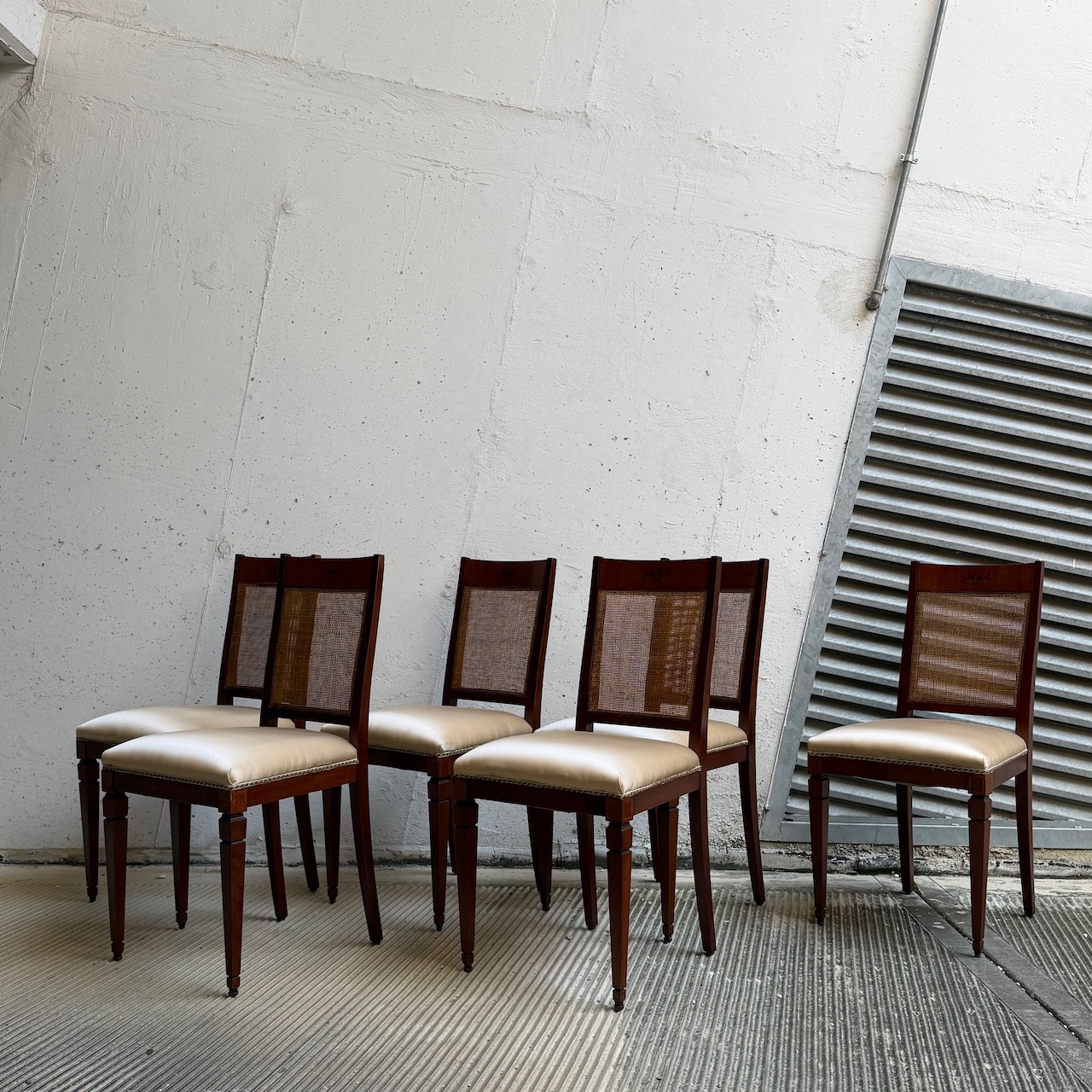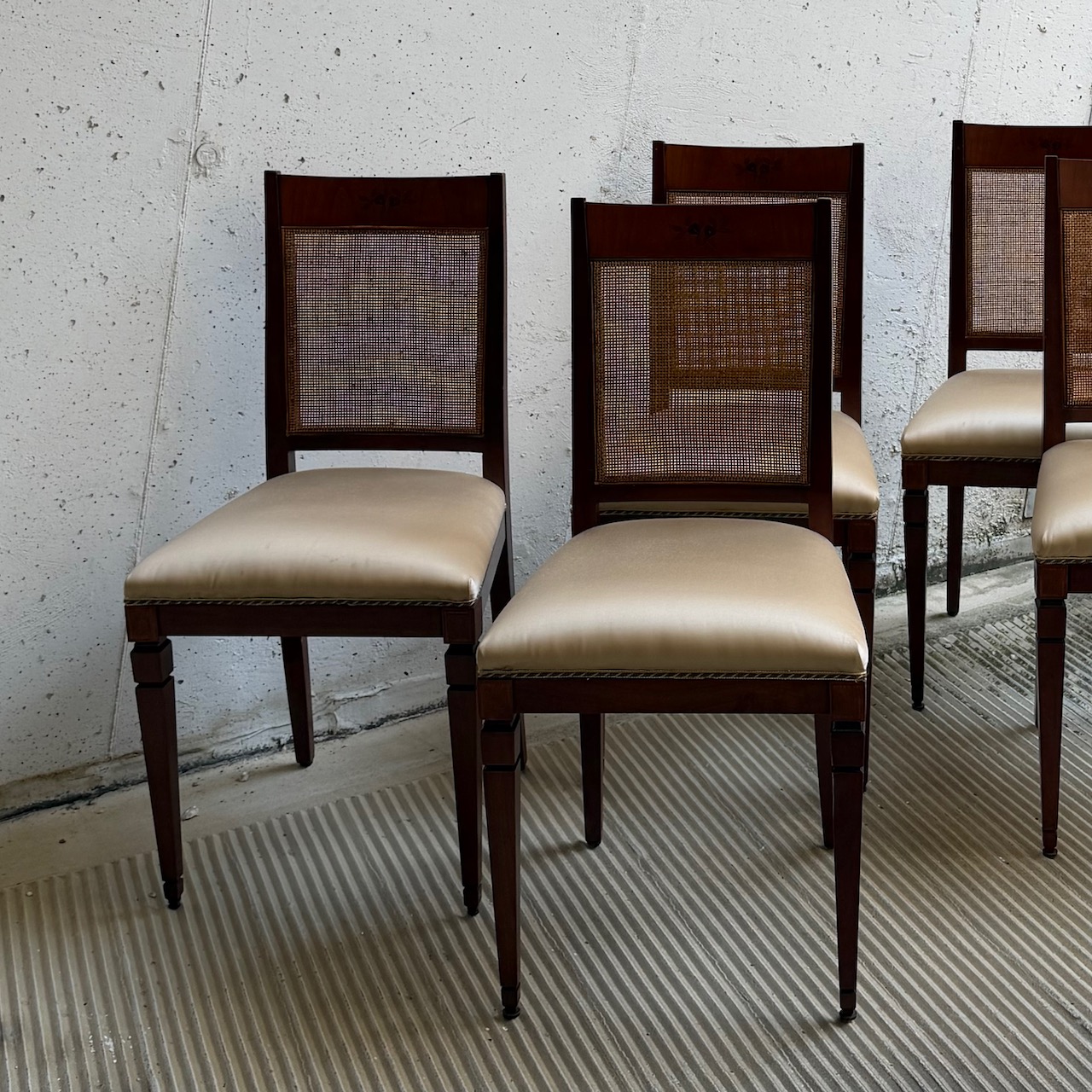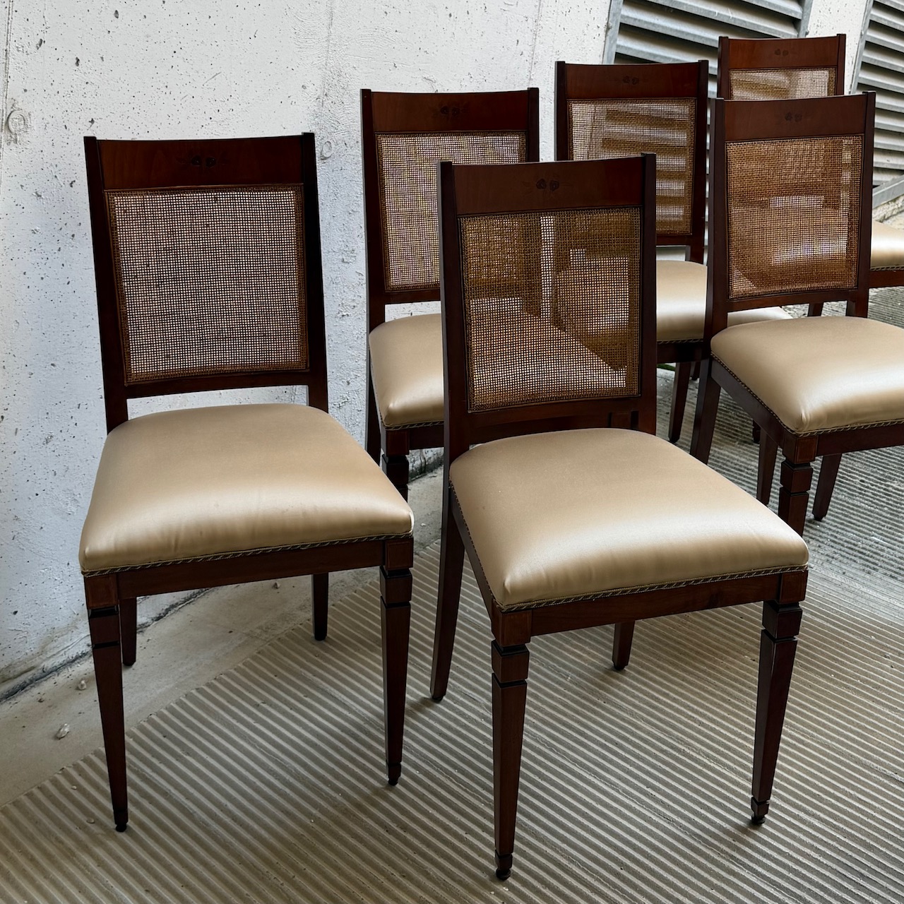 Sei sedie Luigi XVI, in mogano, seduta rivestita in raso di eta champagne e schienale in vimini intrecciato, gambe troncopiramidali. Italia, sec. XIX