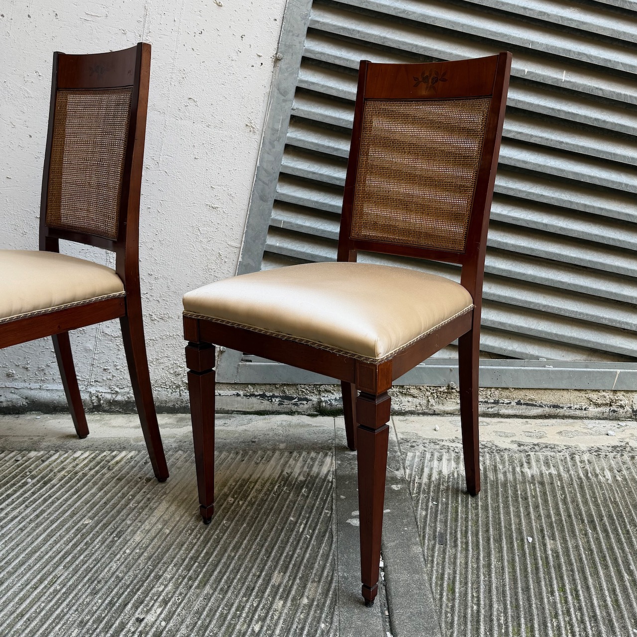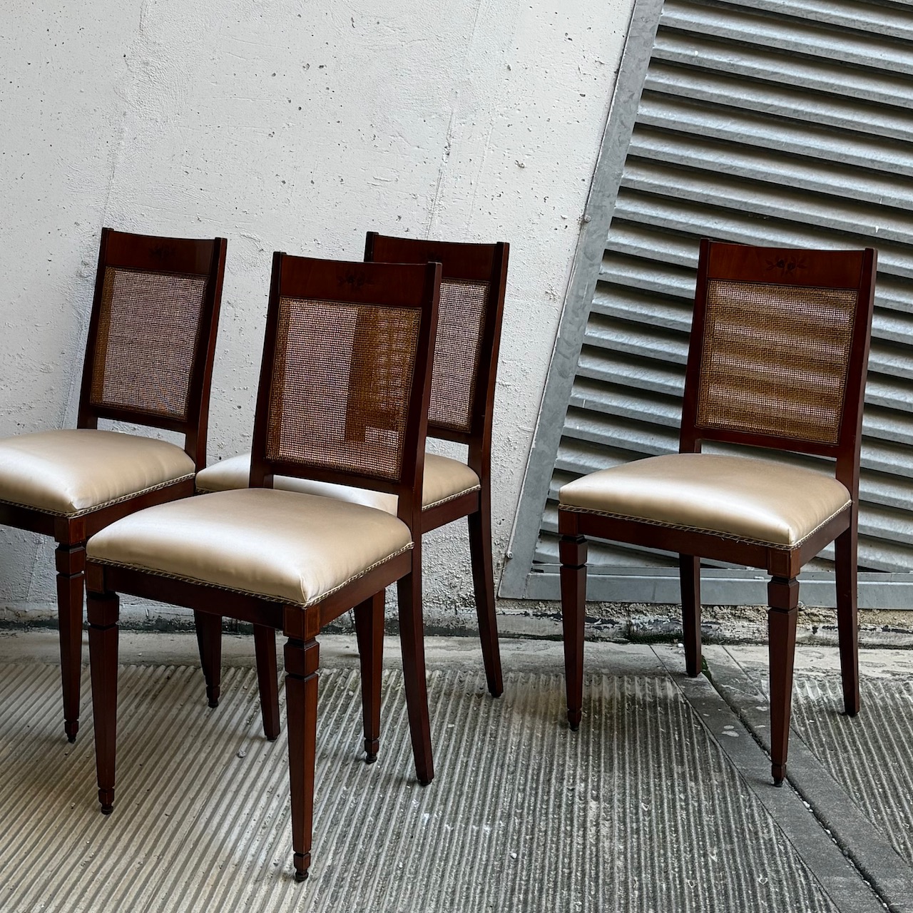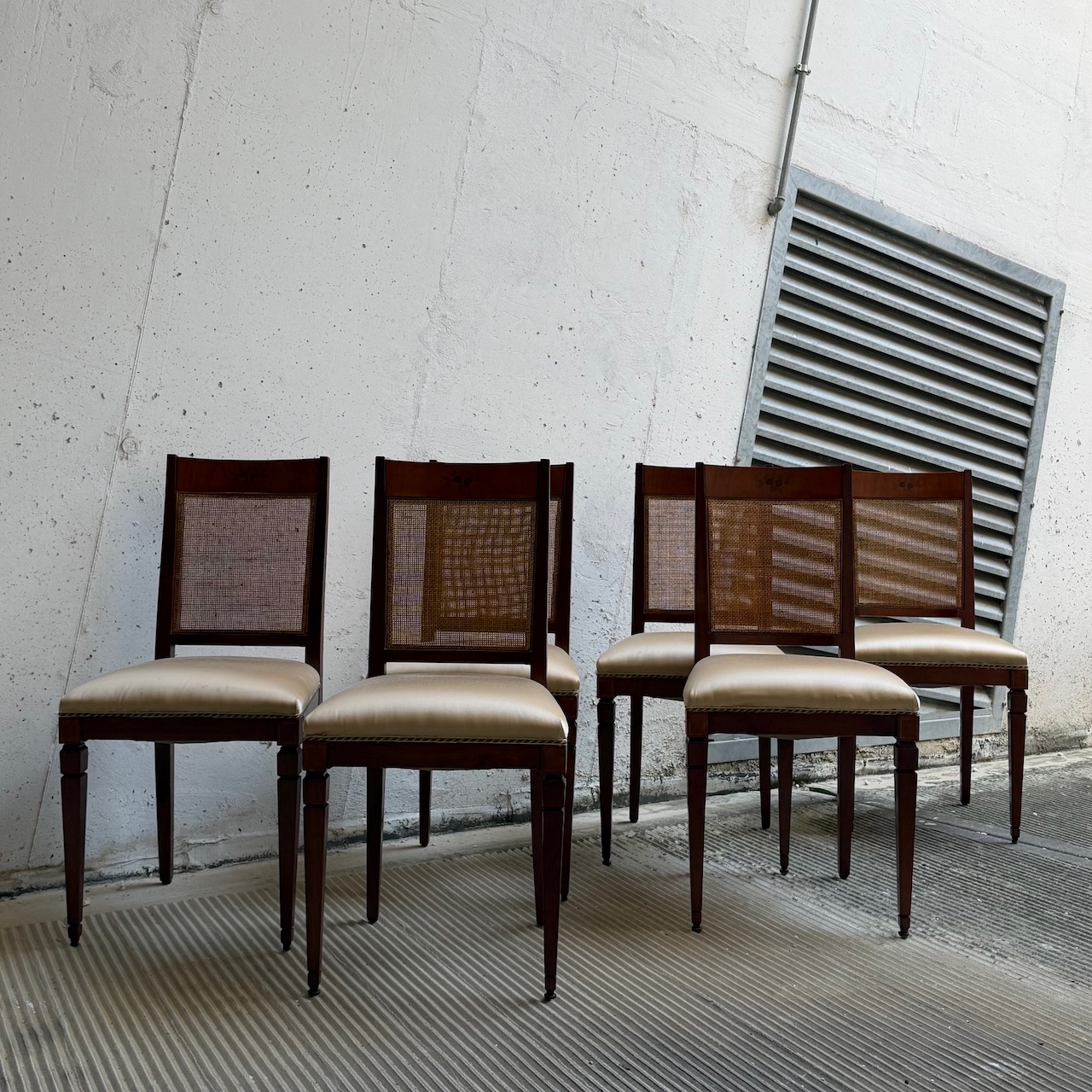 Sei sedie Luigi XVI, in mogano, seduta rivestita in raso di eta champagne e schienale in vimini intrecciato, gambe troncopiramidali. Italia, sec. XIX