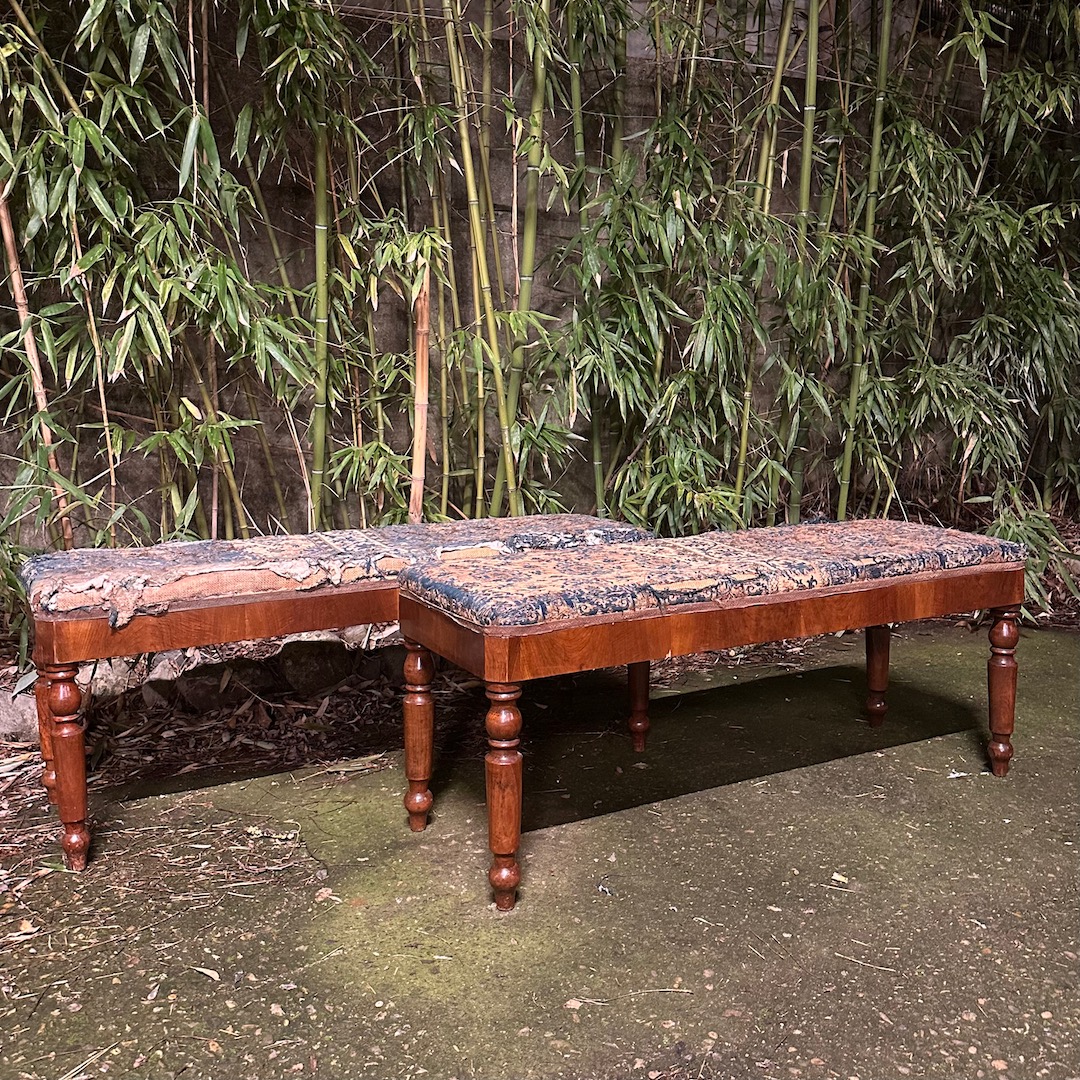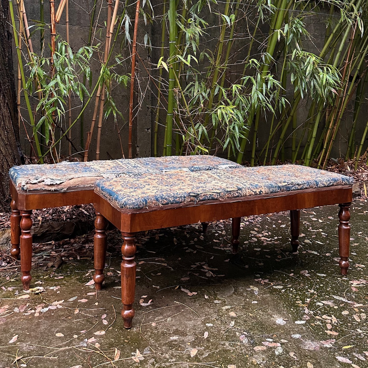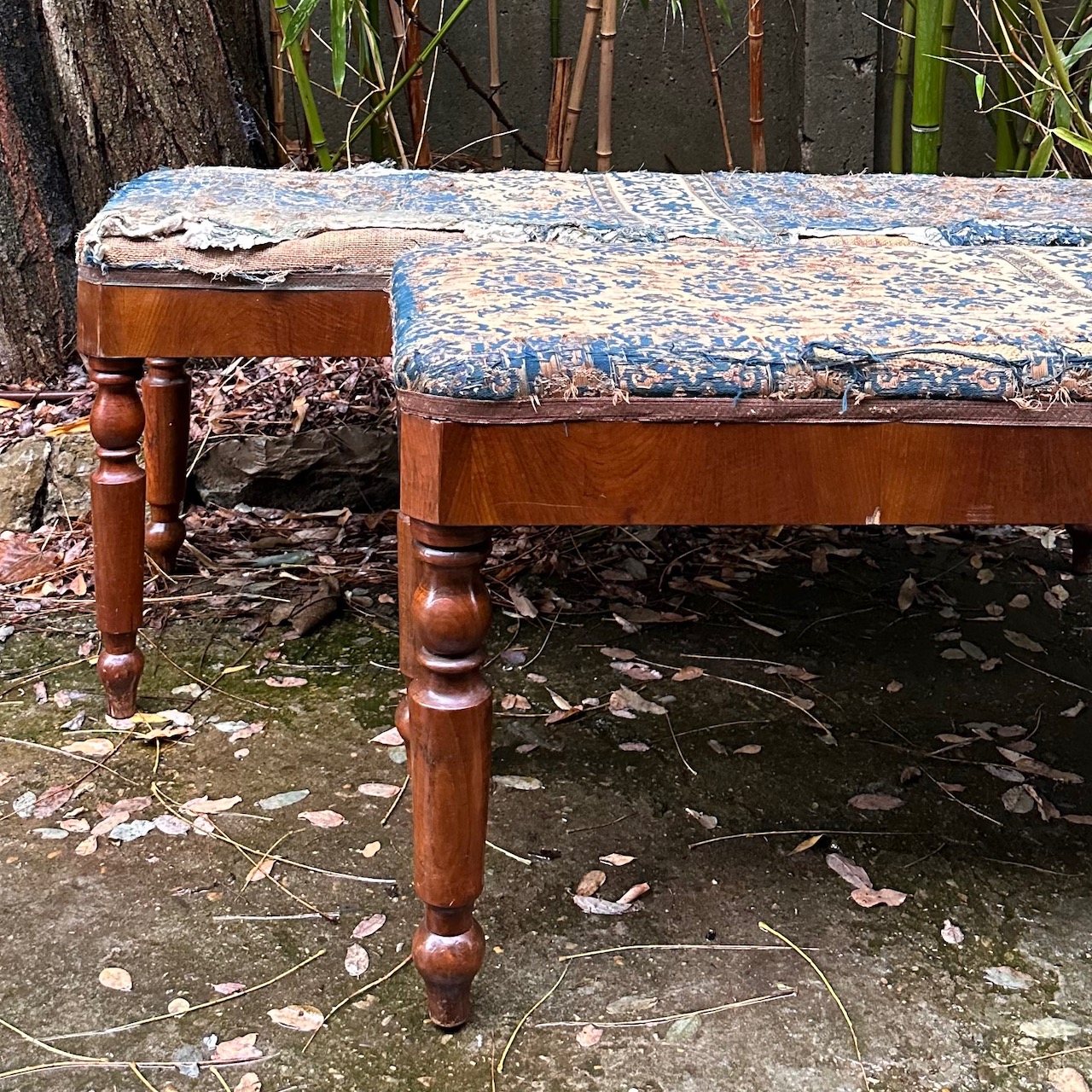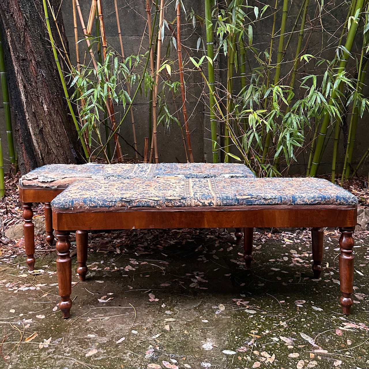 Coppia panche in piuma di noce, sedute imbottite, rivestite in tessuto a fondo crema e decoro blu, gambe tornite. Italia, sec. XIX