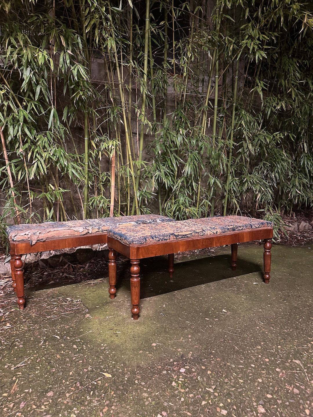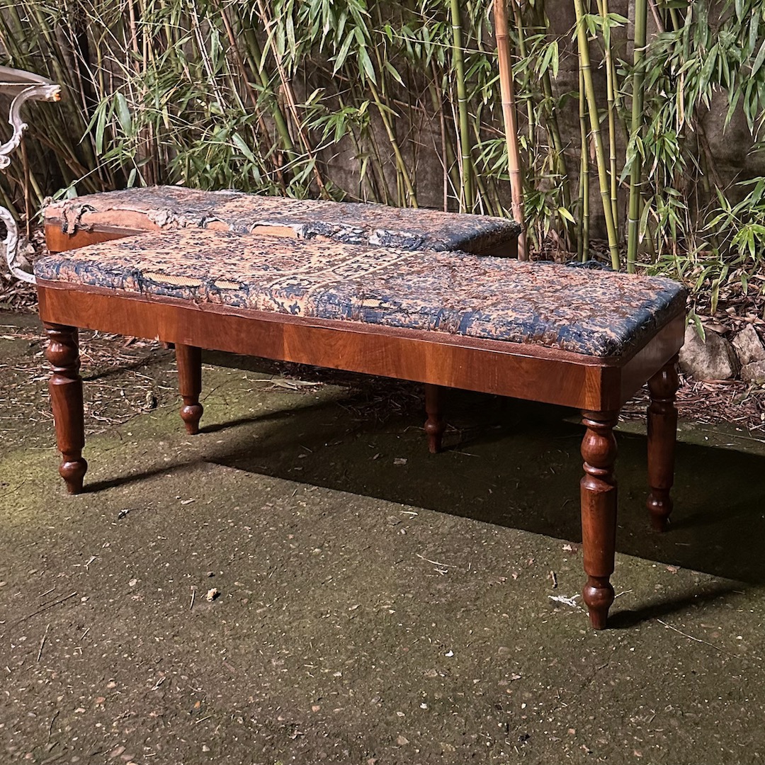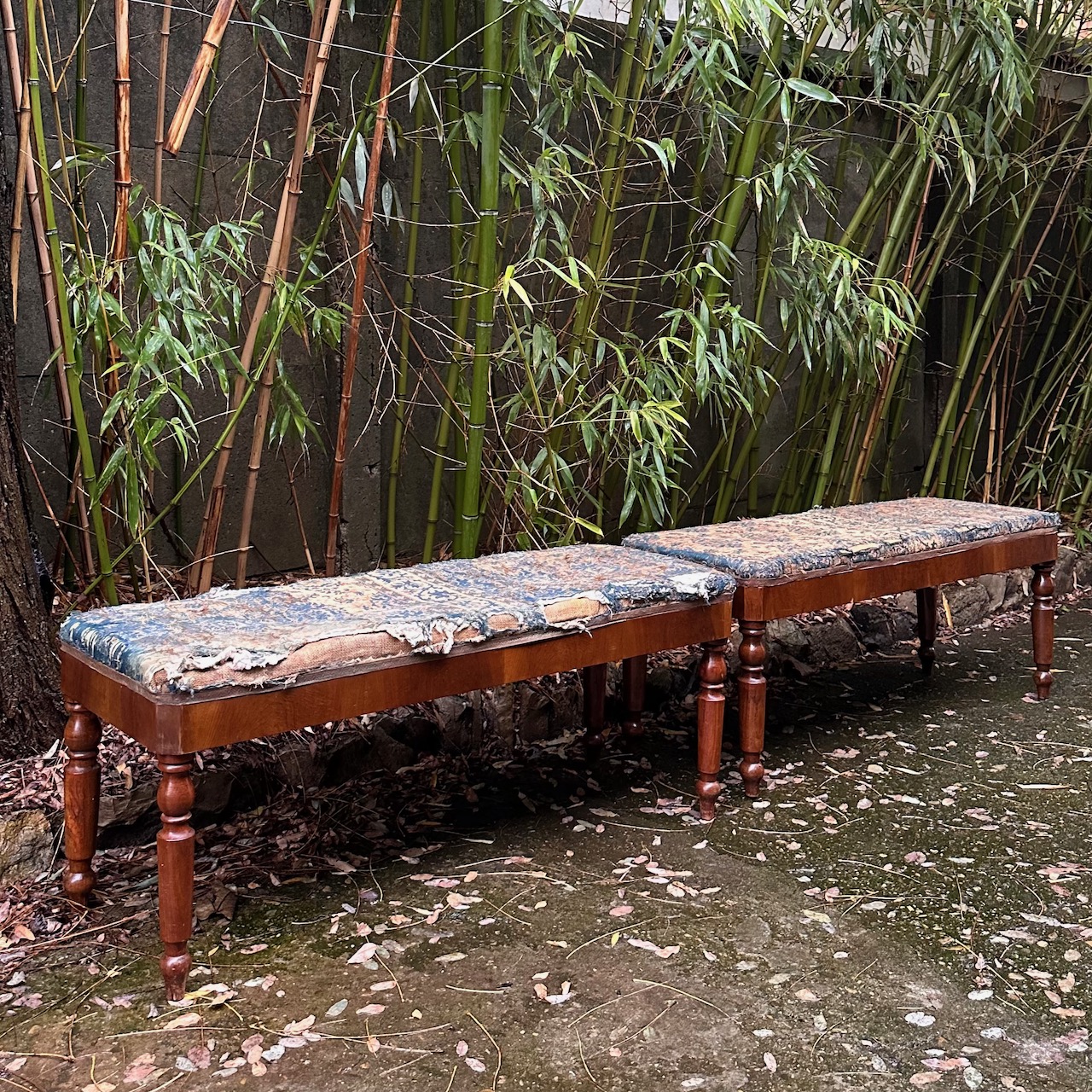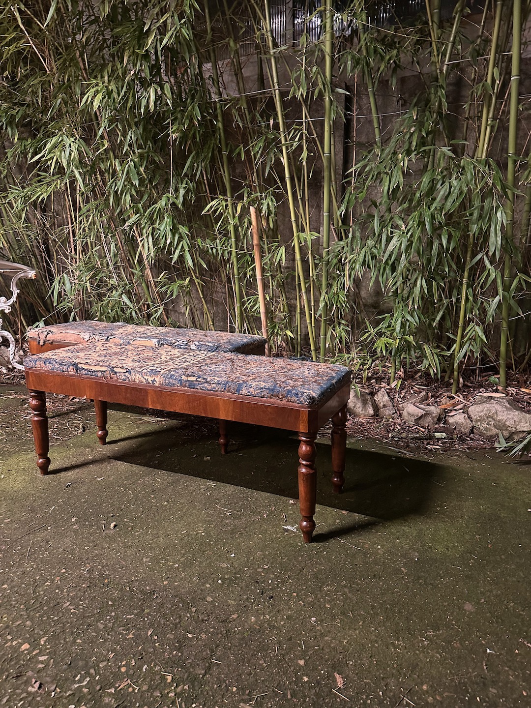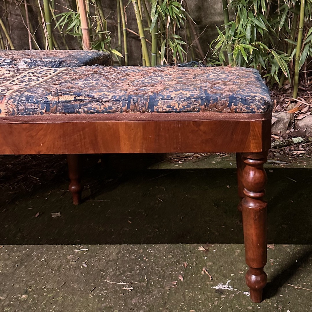 Coppia panche in piuma di noce, sedute imbottite, rivestite in tessuto a fondo crema e decoro blu, gambe tornite. Italia, sec. XIX