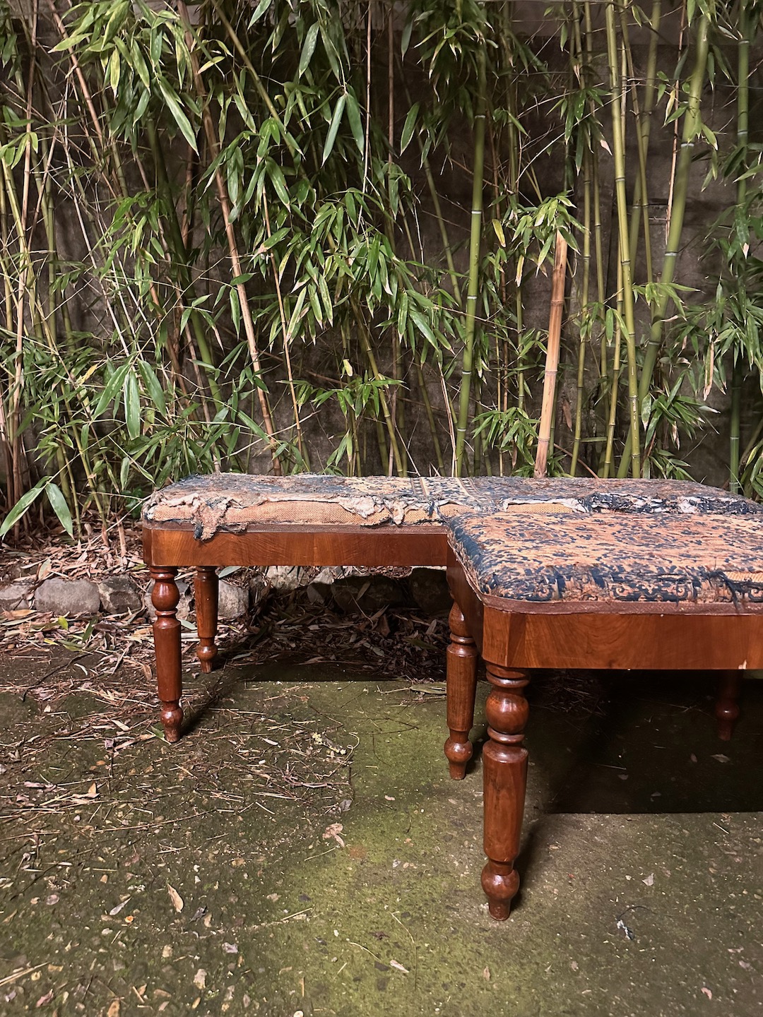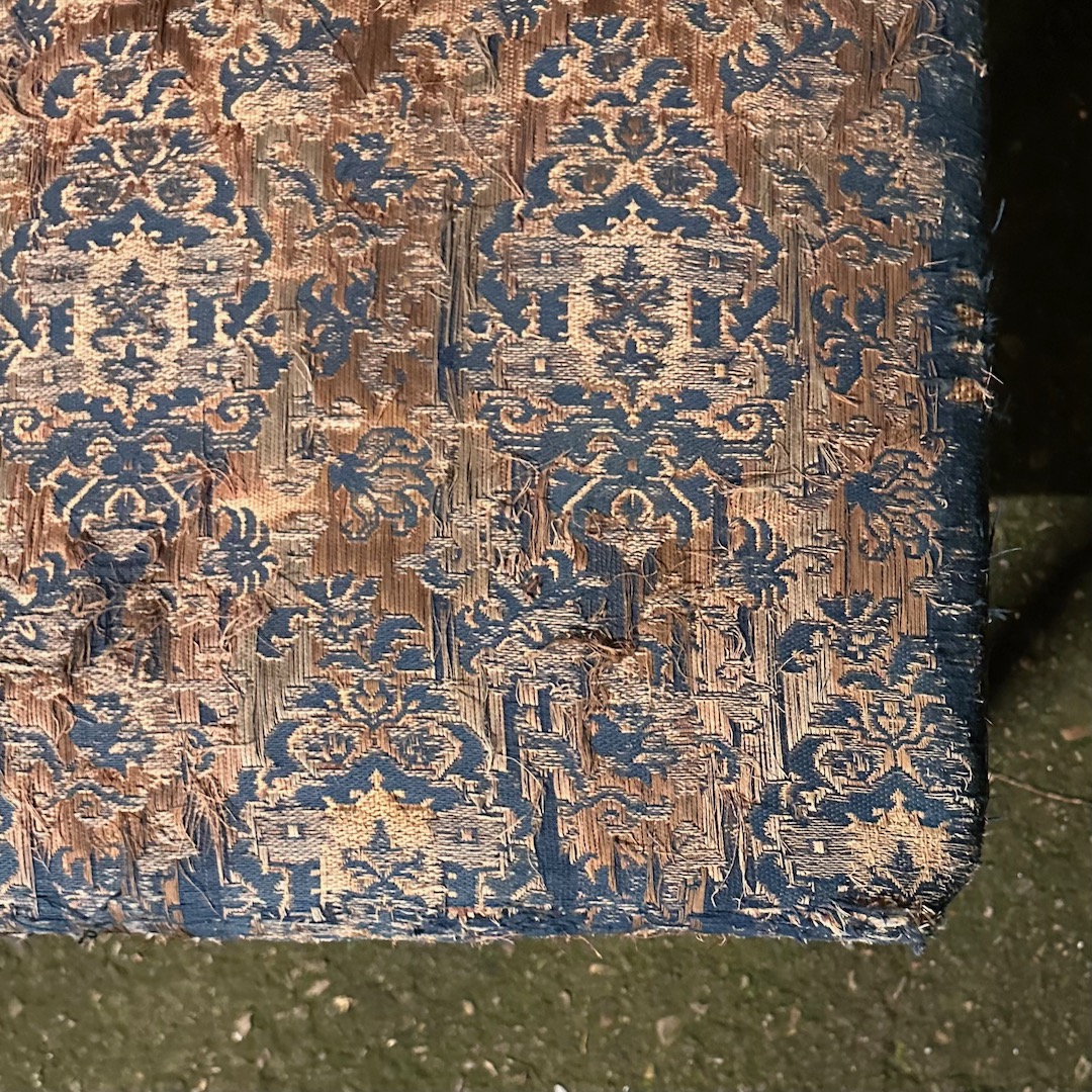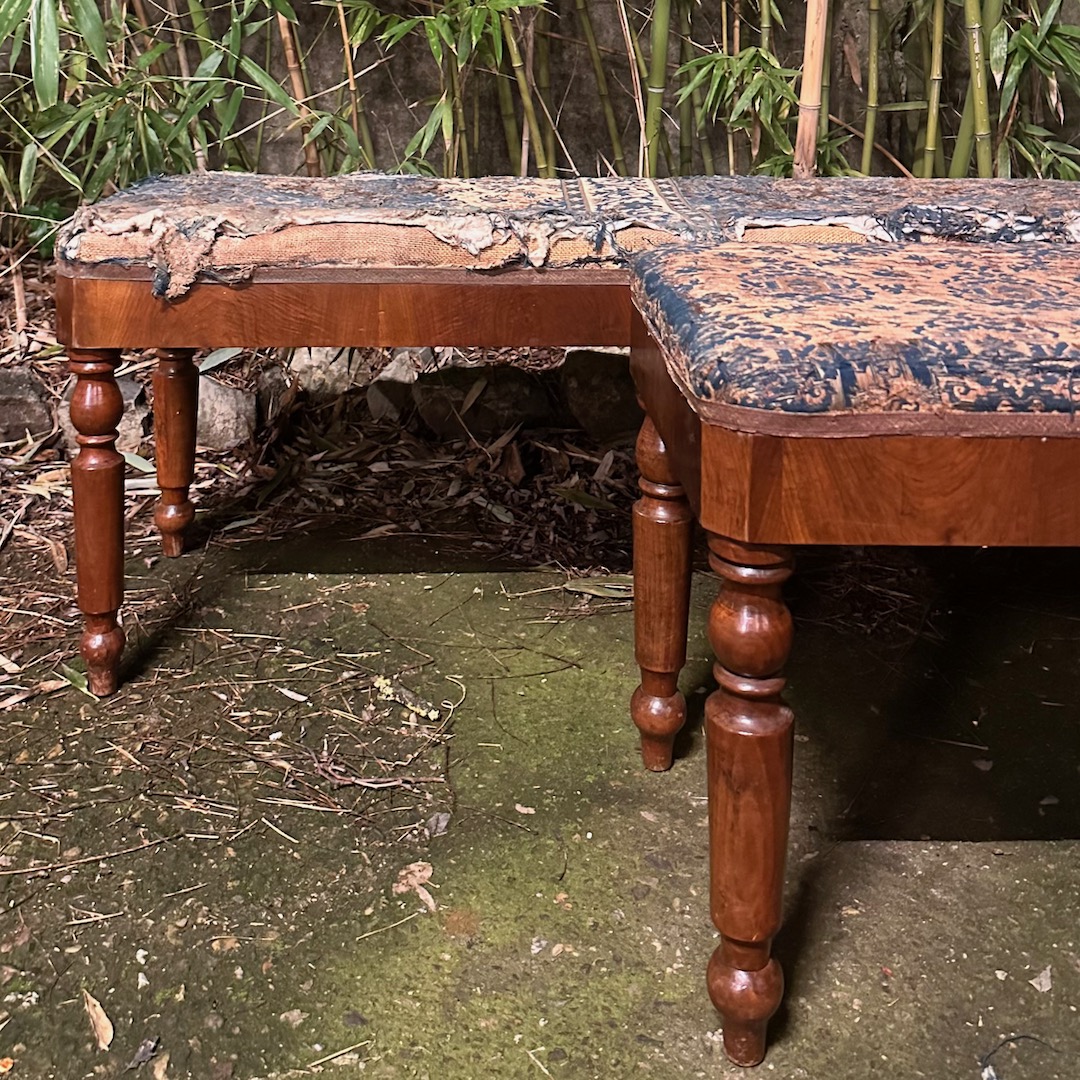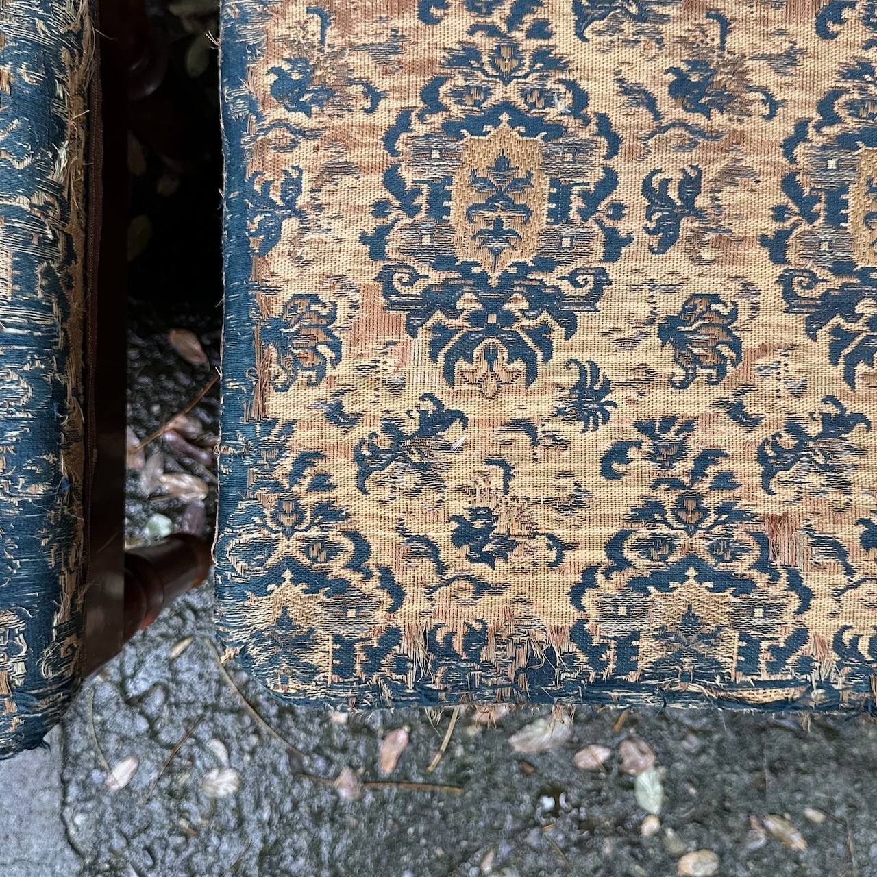 Coppia panche in piuma di noce, sedute imbottite, rivestite in tessuto a fondo crema e decoro blu, gambe tornite. Italia, sec. XIX
