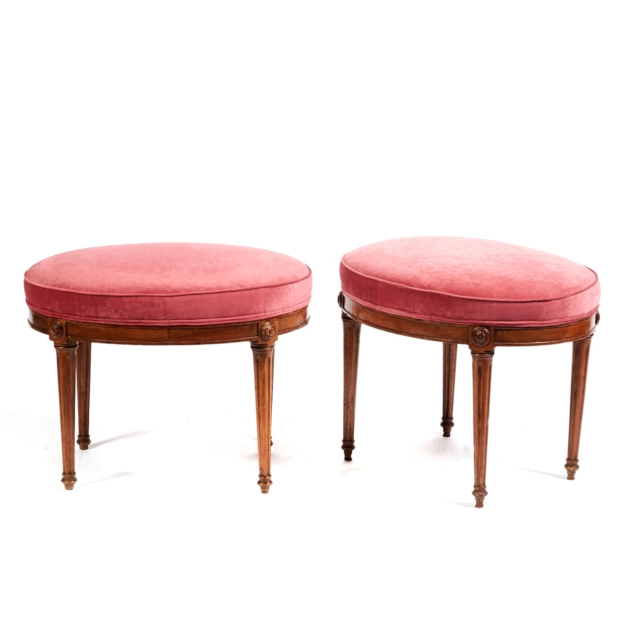 Coppia di panchetti Luigi XVI, in noce, seduta velluto rosa. Italia, sec. XX