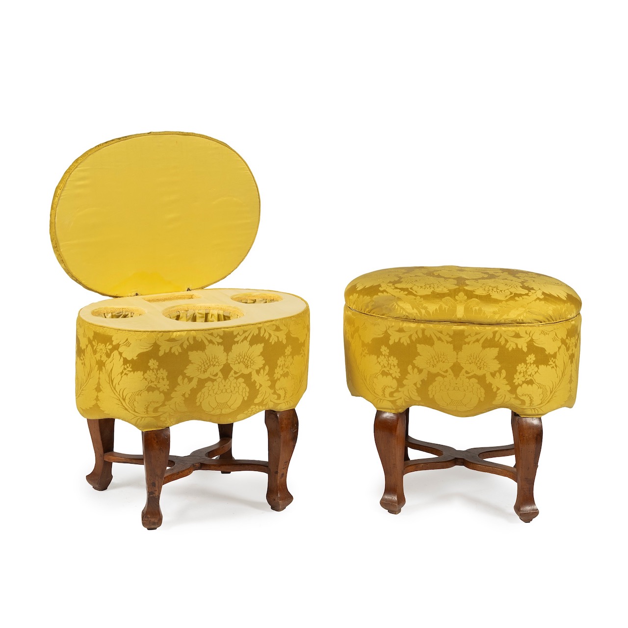 Coppia sgabelli Luigi XV, gambe mosse unite da traverse, seduta imbottita e rivestita in tela damasco oro, piano ad alzarsi con all'interno porta oggetti. Italia, sec. XVIII