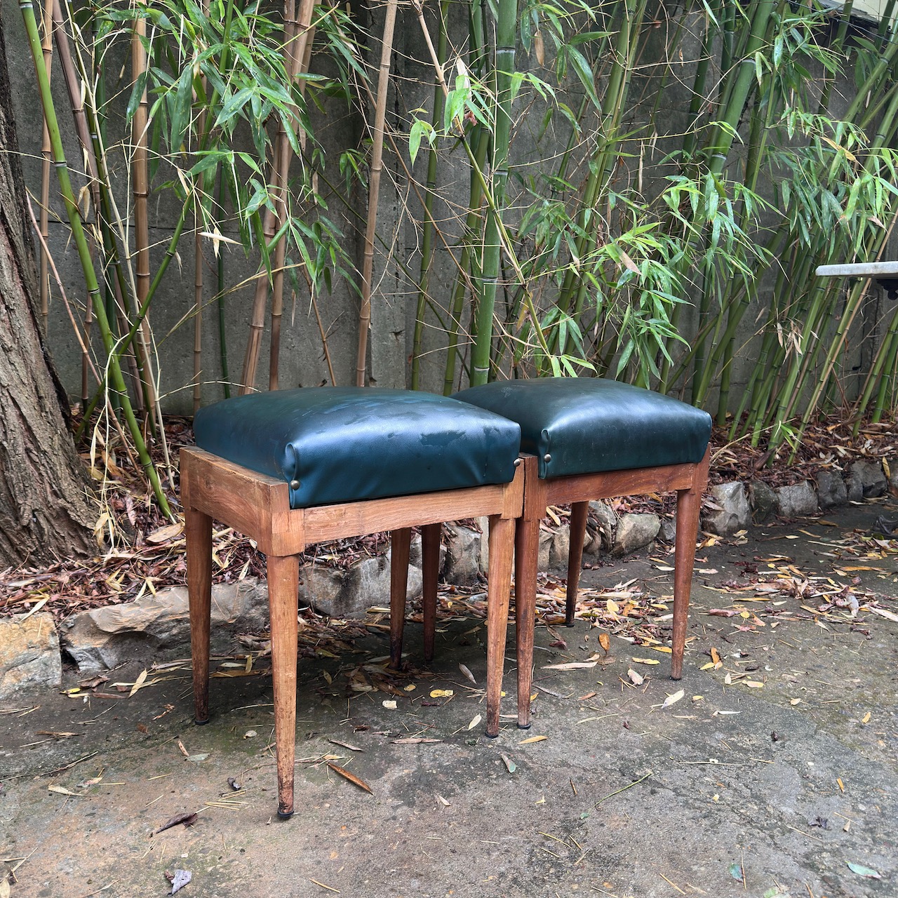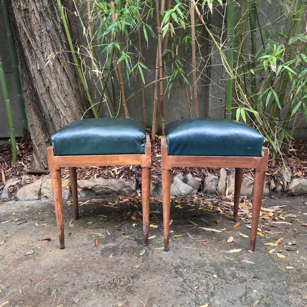 Coppia di sgabelli Midcenturi, gambe dritte e seduta in pelle ottanio. Italia, sec. XX