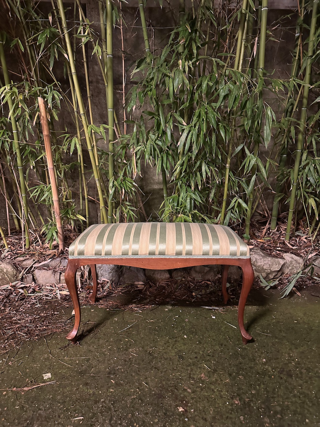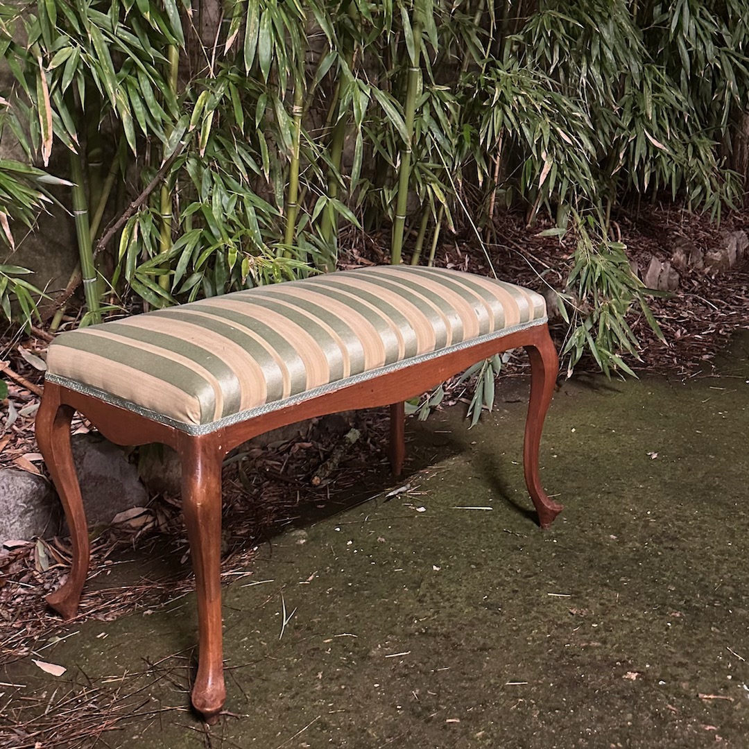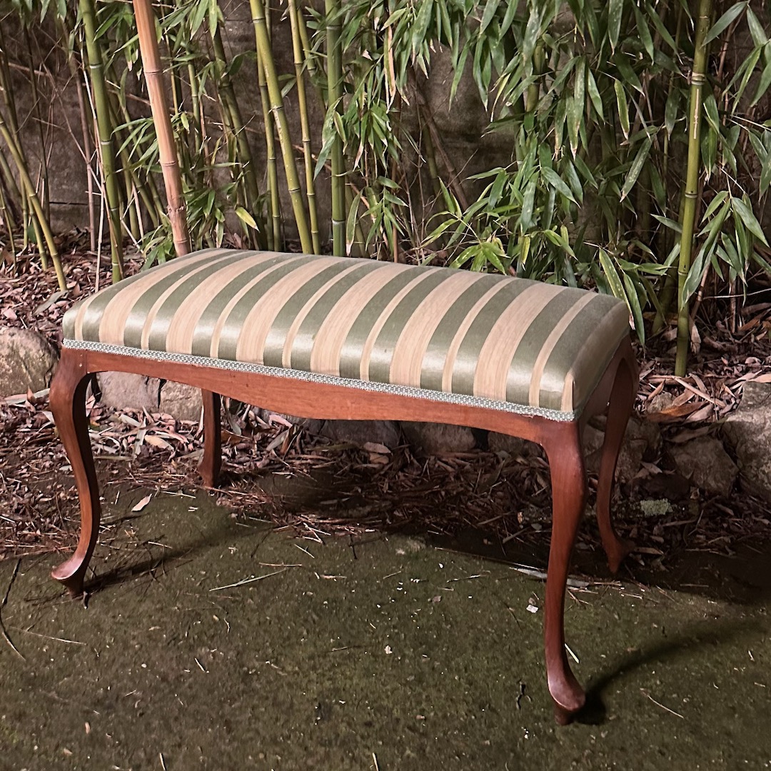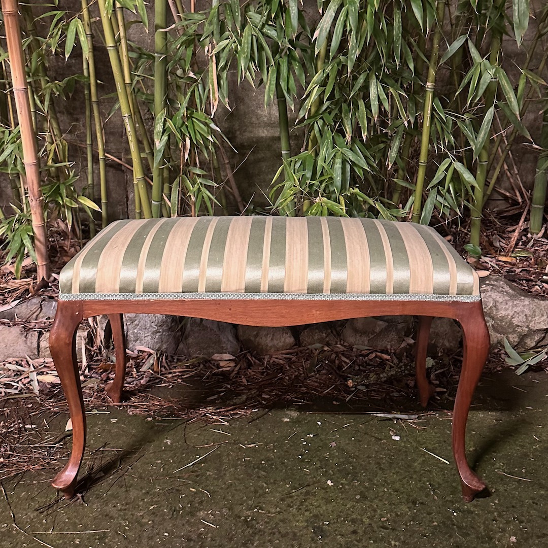 Grande sgabello doppio in legno di ciliegio, seduta rivestita in seta a righe verde giada, gambe cabriole. Italia, sec. XIX