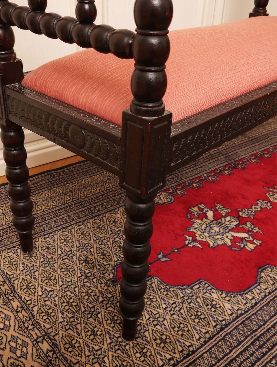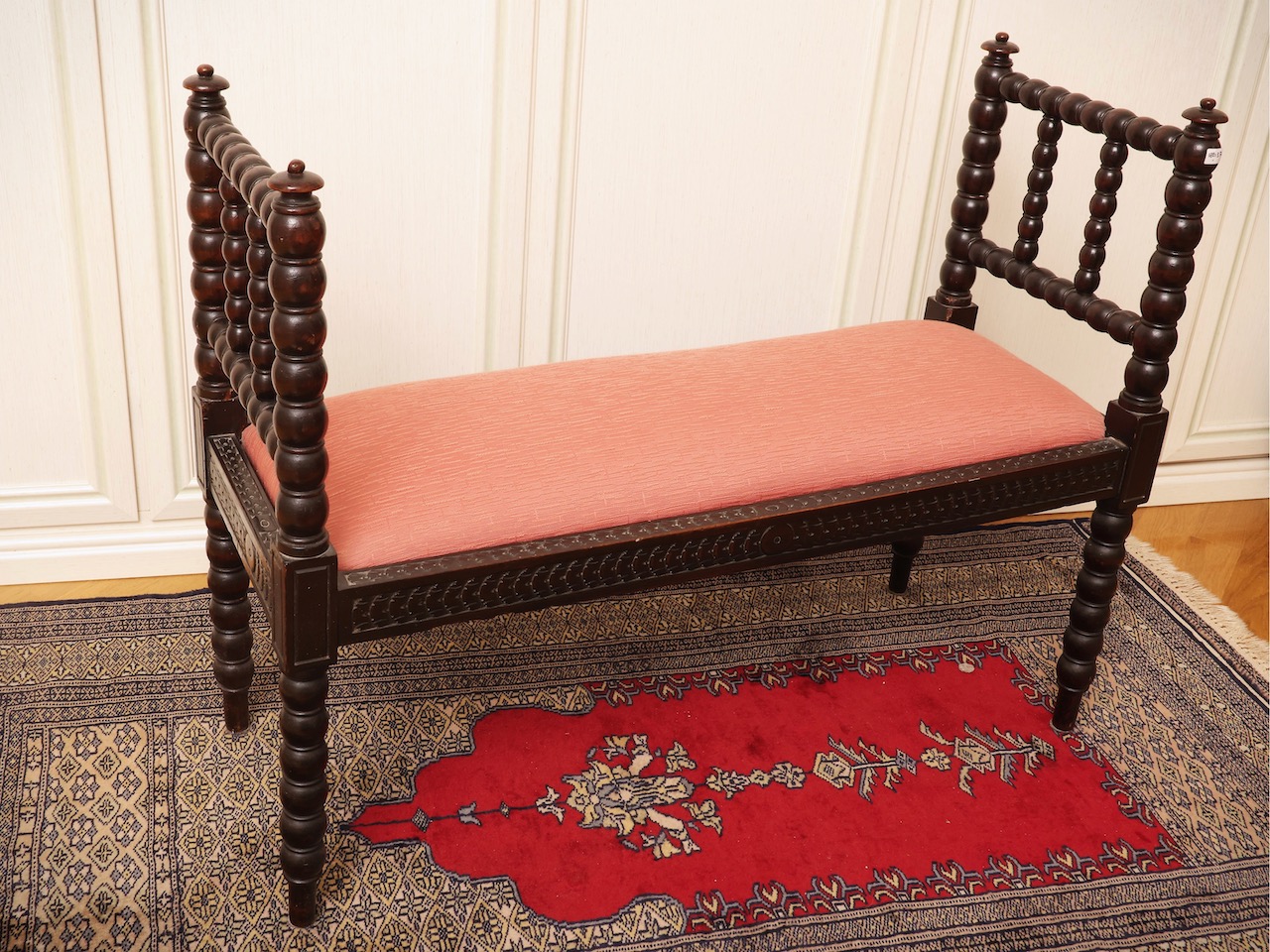 Panca in legno ebanizzato, sostegni torniti, seduta imbottita e rivestita in tela rosa salmone, pendaglio intagliata. Italia, sec. XX