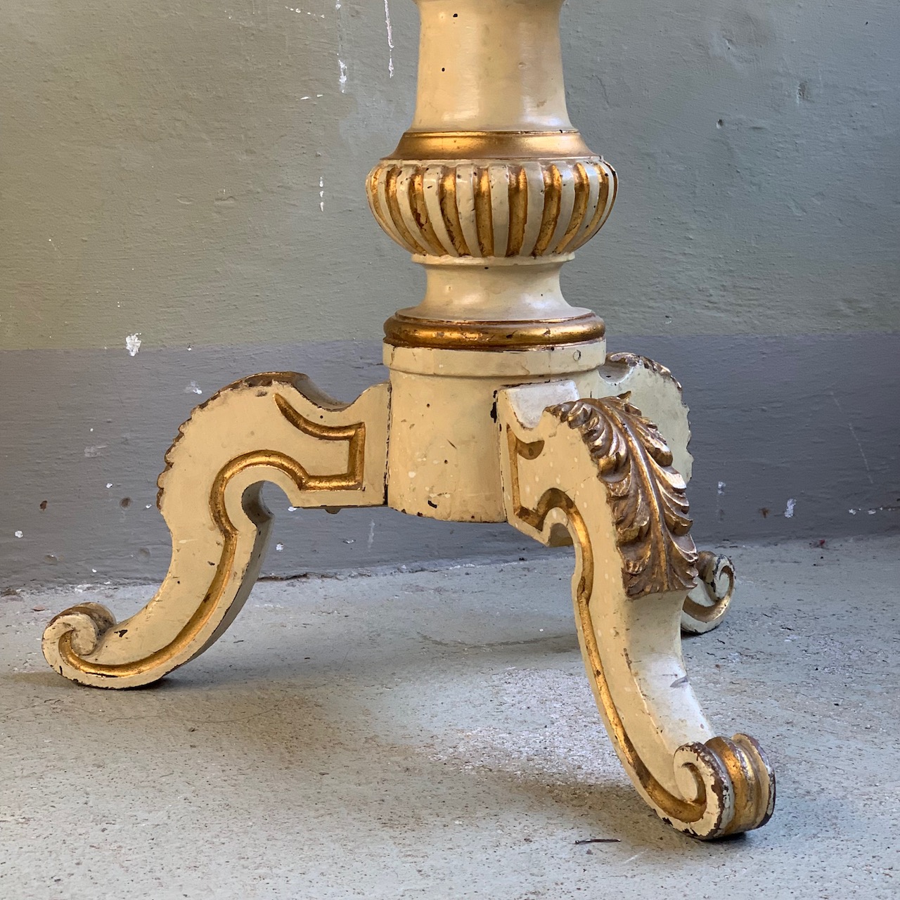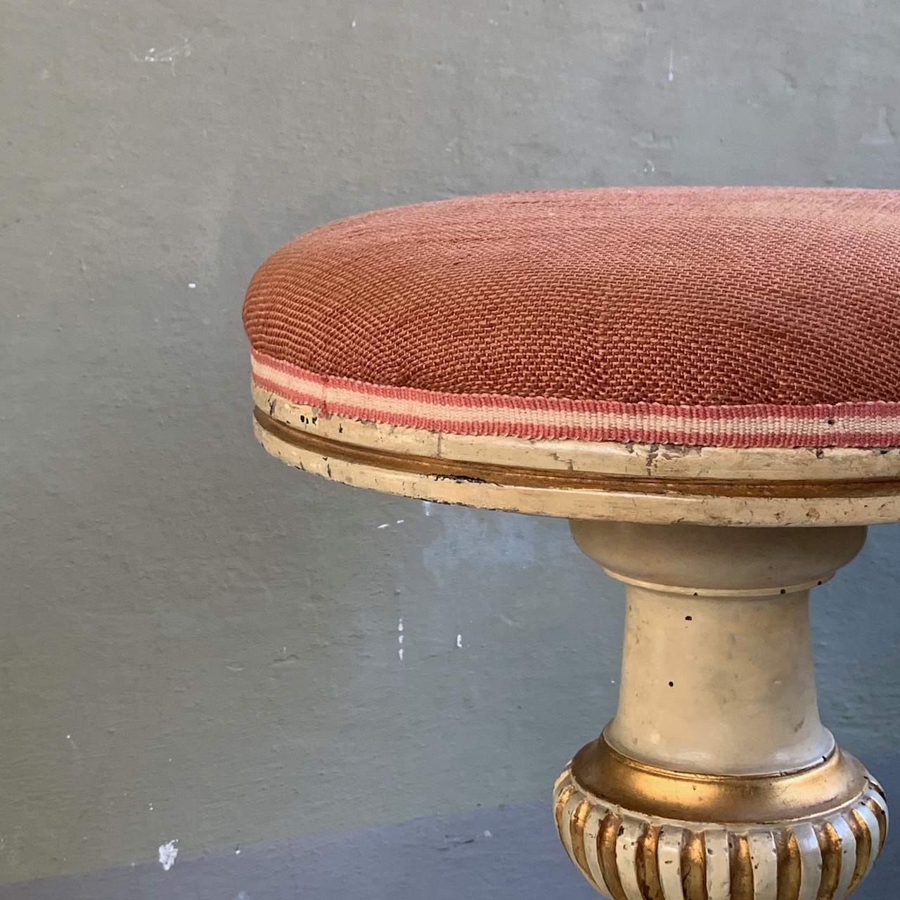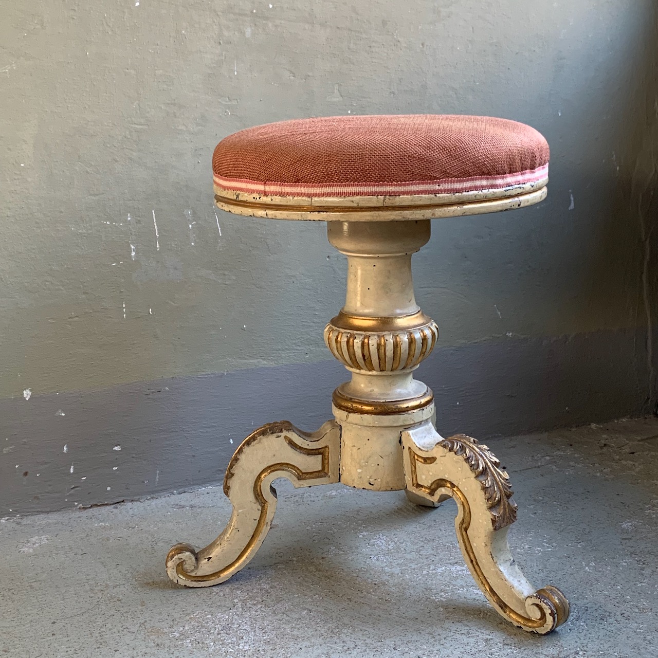 Panchetto rotondo da pianoforte, in legno laccato avorio con lumeggiature oro su tripode, seduta in tela rosa antico. Italia, sec. XIX