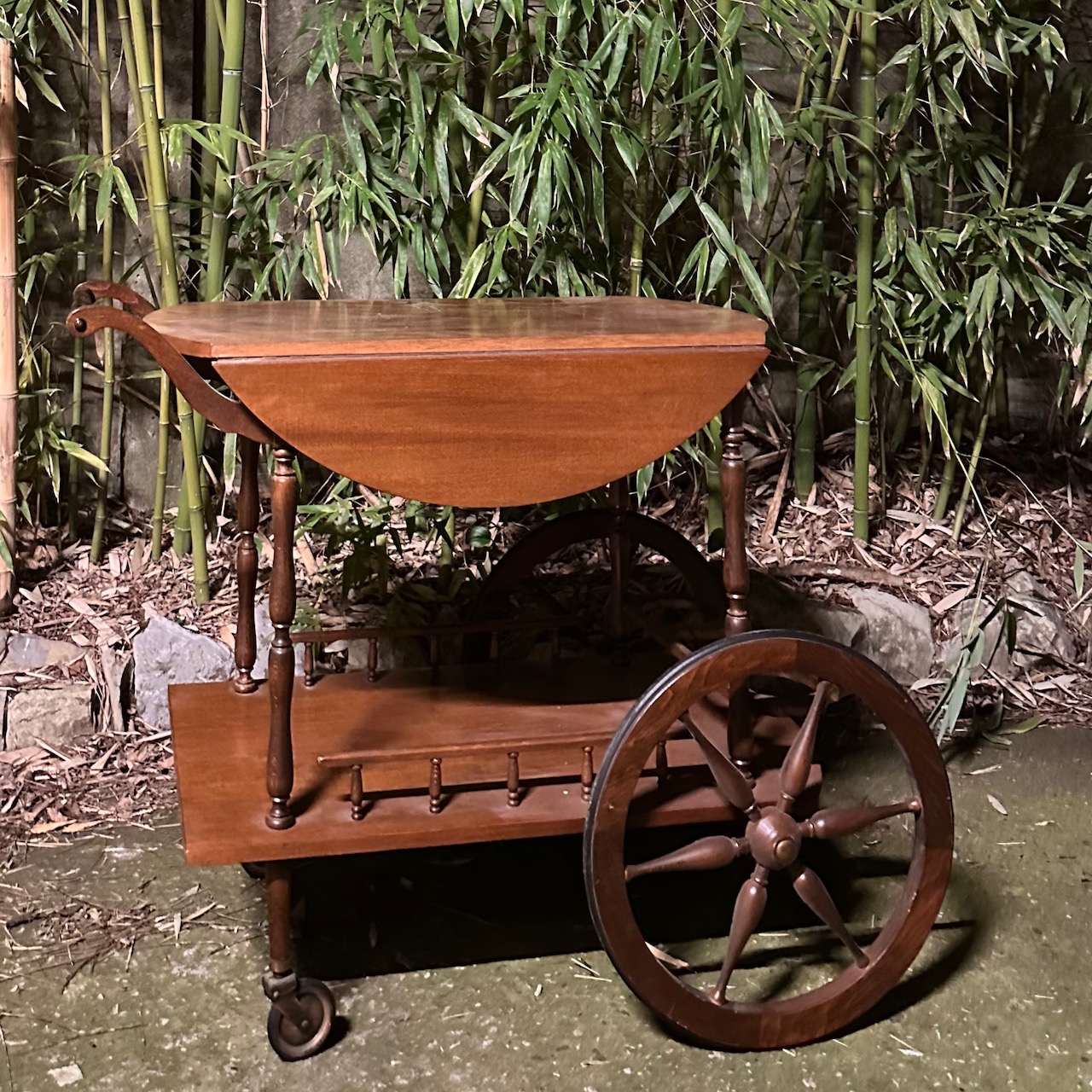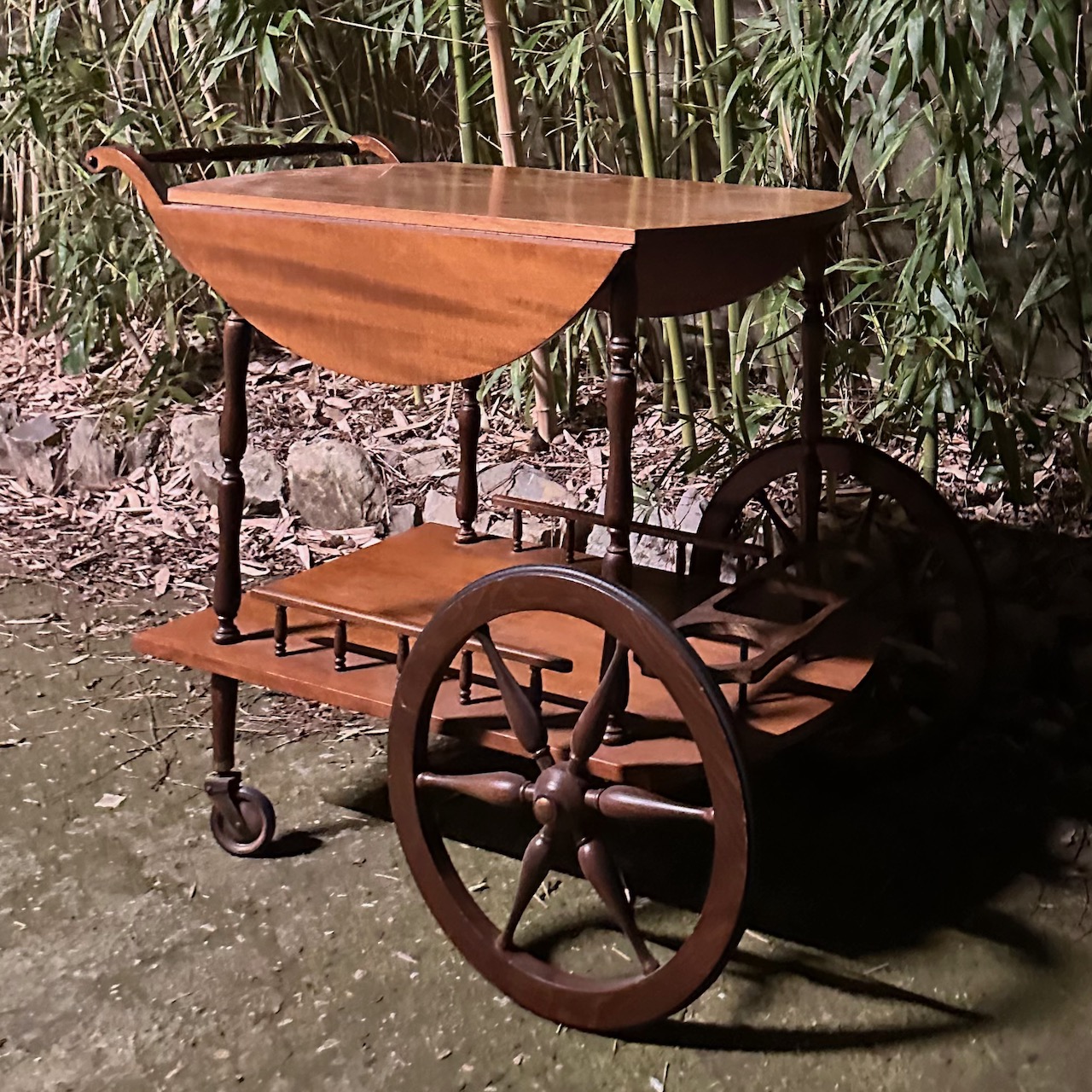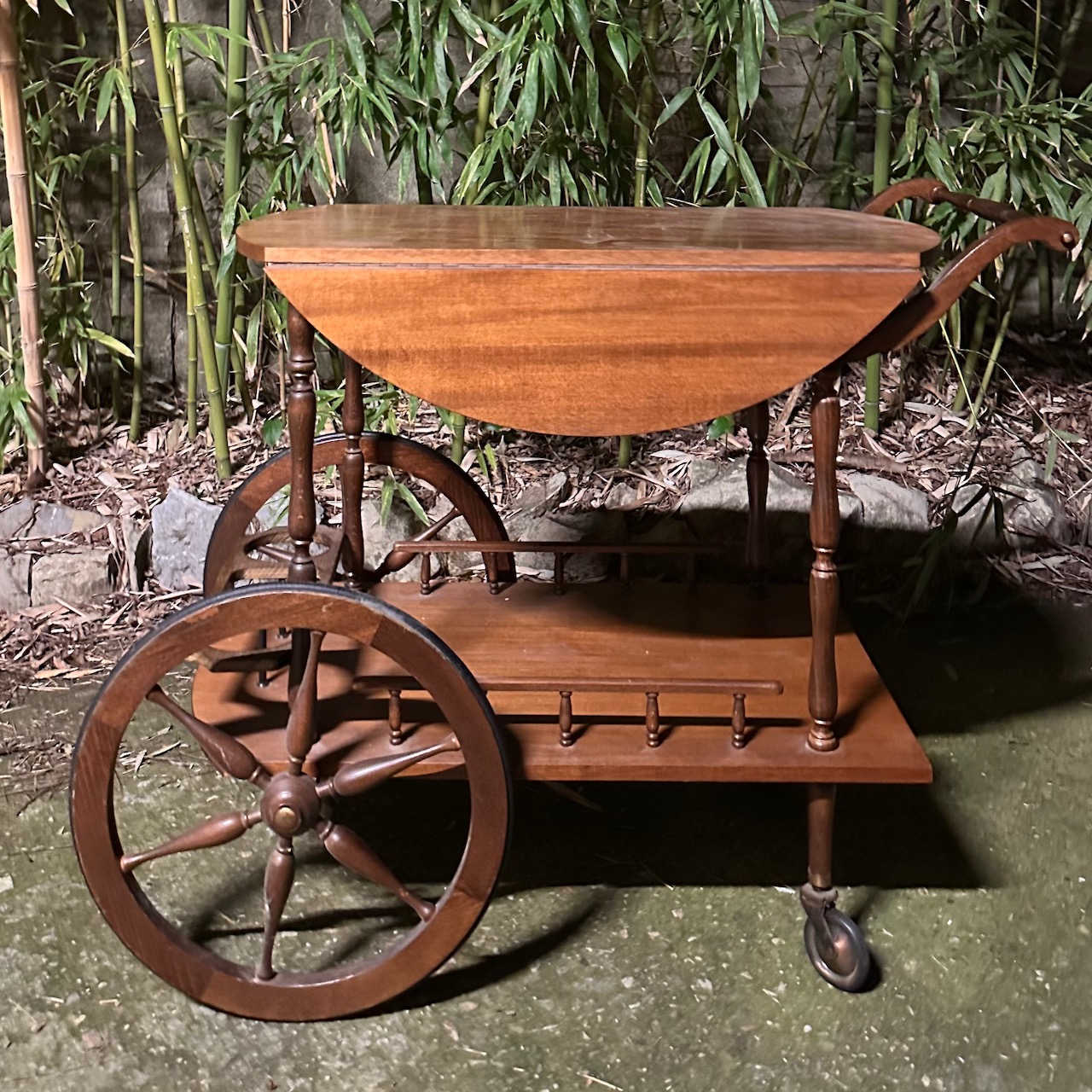 Carrello in legno di noce a patina bionda, con alette apribili sul piano e ringhiera portabottiglie. Italia, inizio sec. XX
