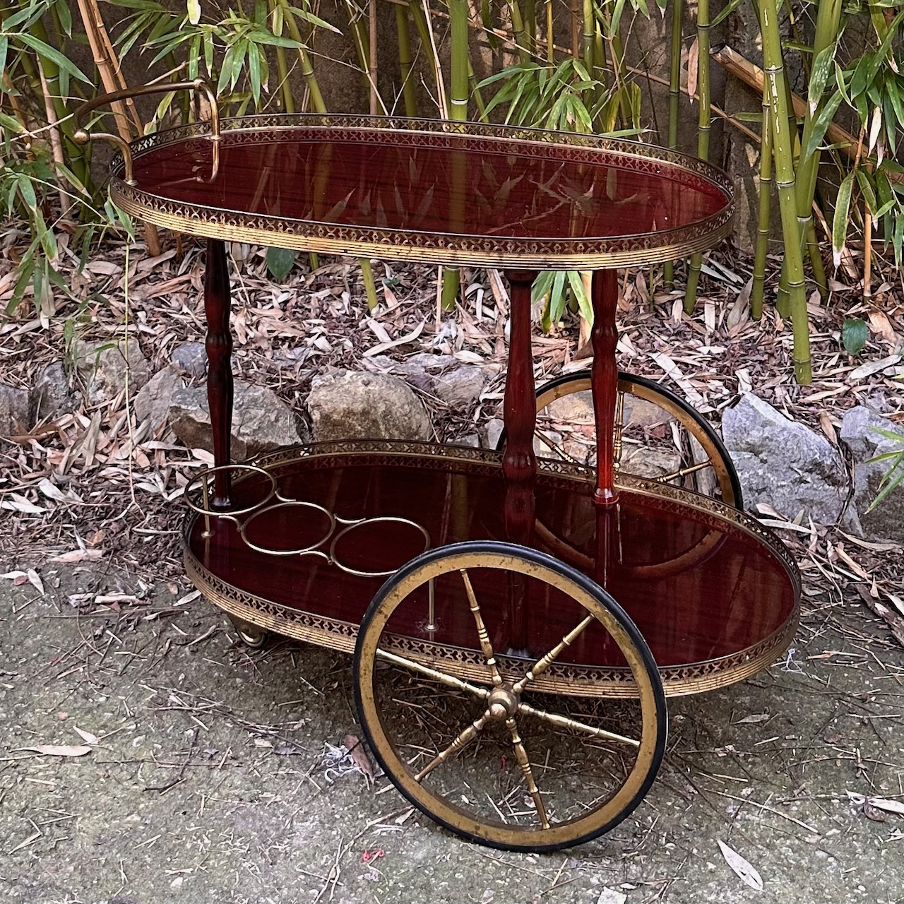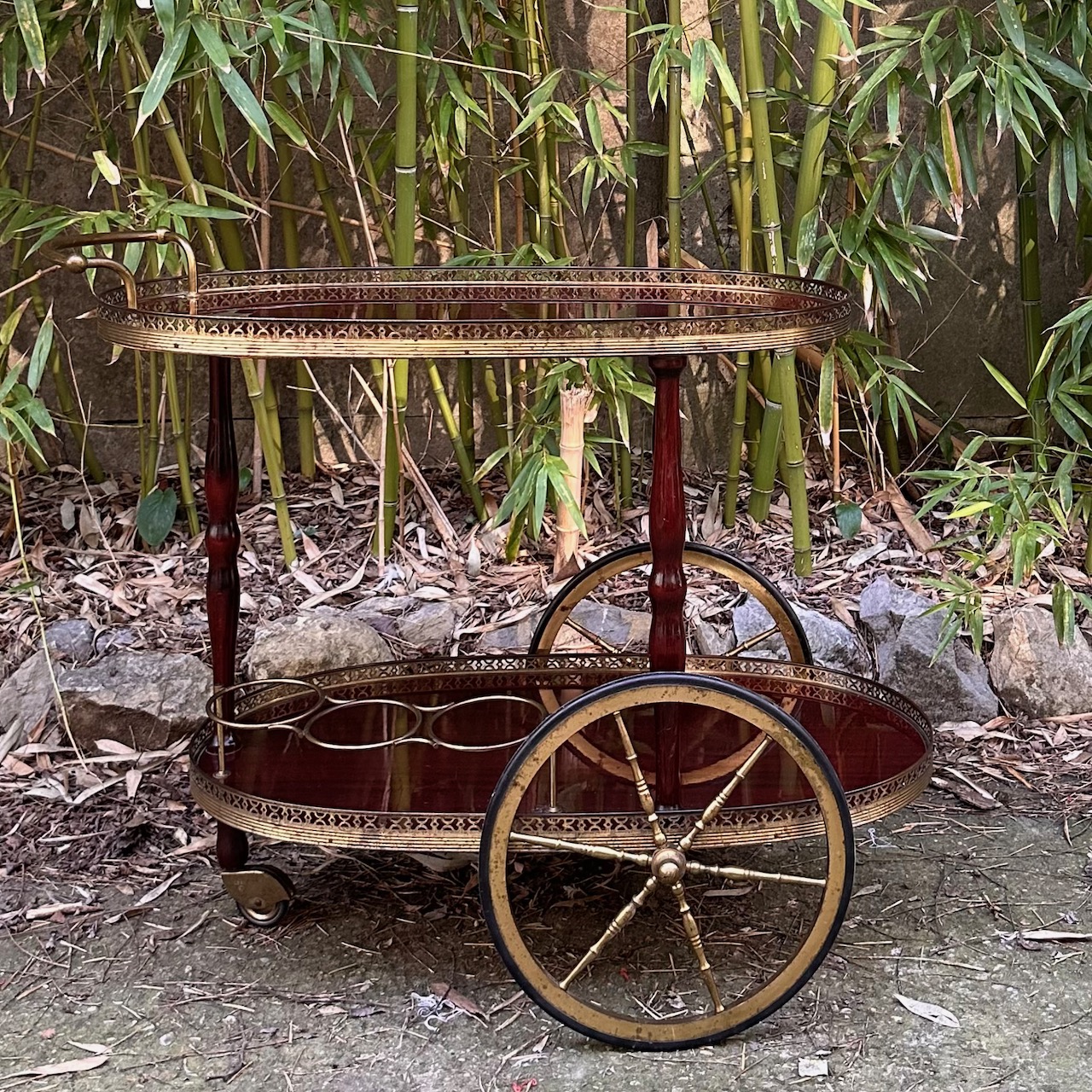 Carrello portavivande ovale in mogano con ringhiera in ottone dorato. Italia, Inizio sec. XX