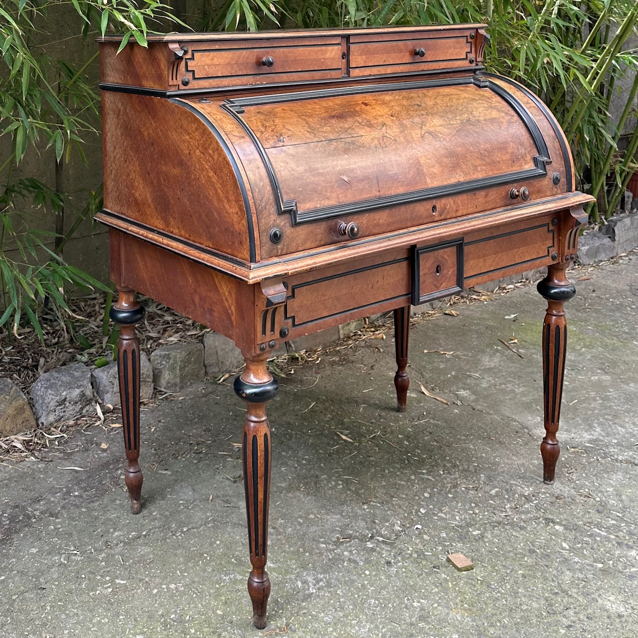 Scrittoio Luigi XVI a cilindro, piano a ribalta , tre cassetti e tre scomparti interni in acero, due cassetti esterni sul piano superiore e uno inferiore, gambe tornite, dettagli e cornici ebanizzati, fodere in rovere. Italia, sec. XIX