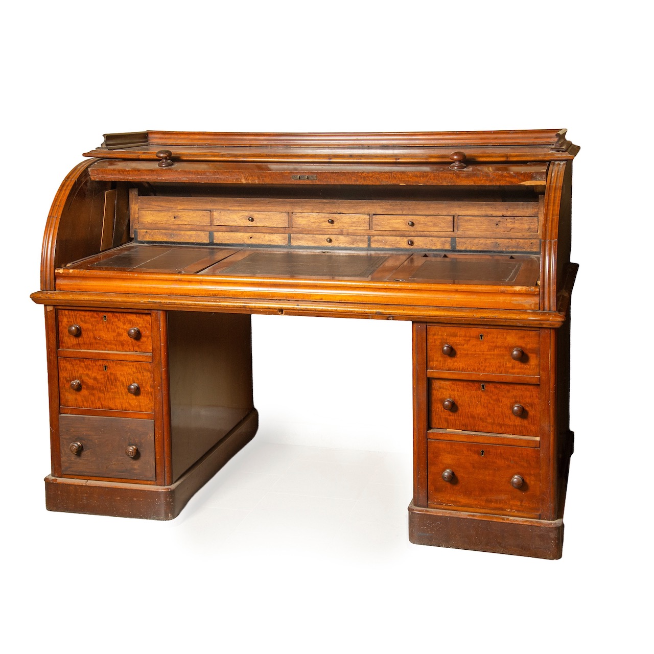 Scrivania a cilindro in mogano, piano scorrevole, dieci piccoli cassetti interni allo scomparto, sostegni a plinto con sei cassetti a doppia presa. Italia, sec. XIX