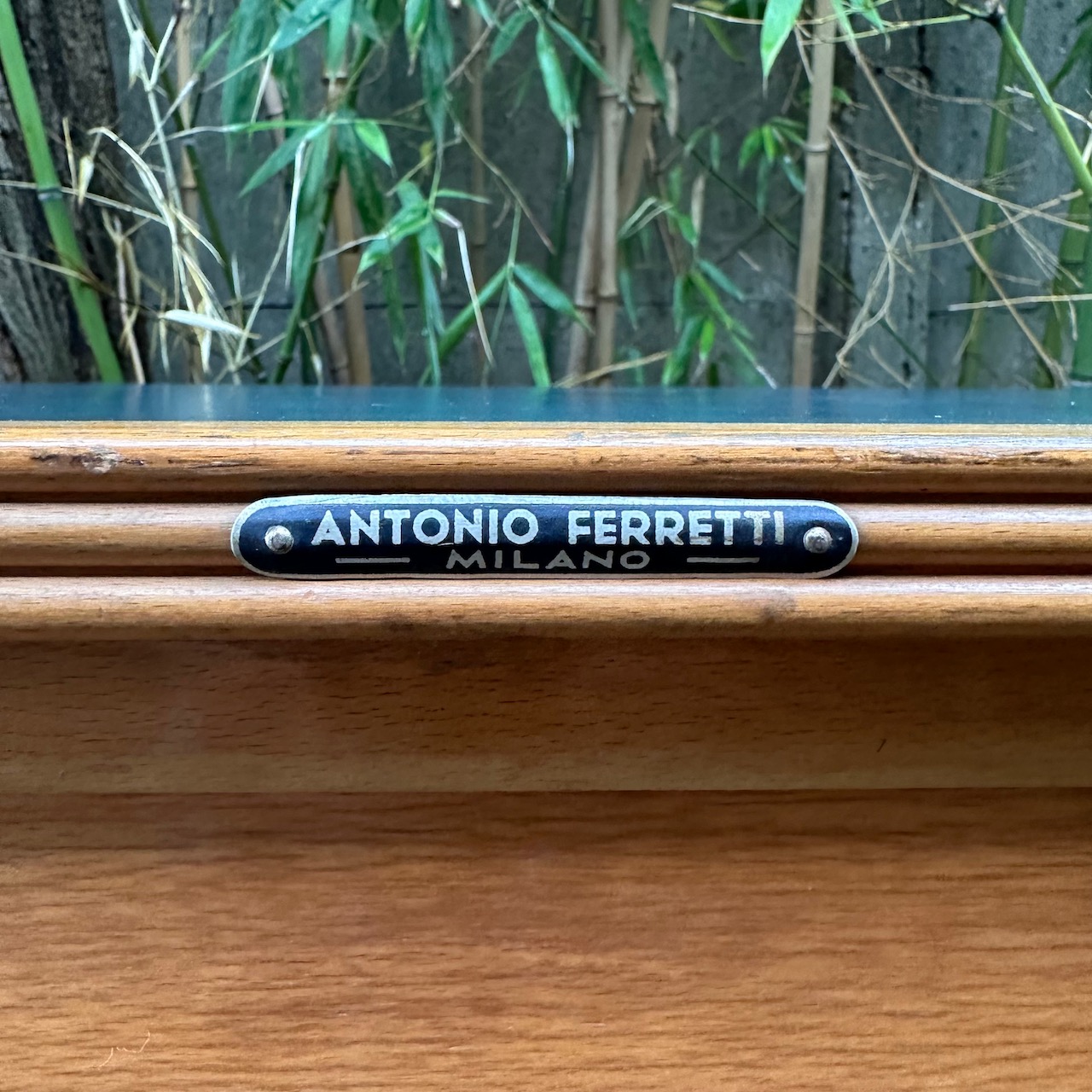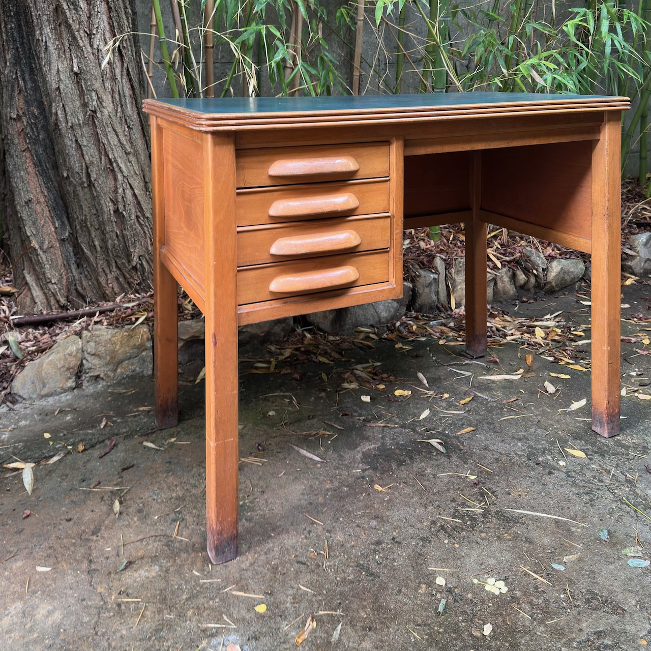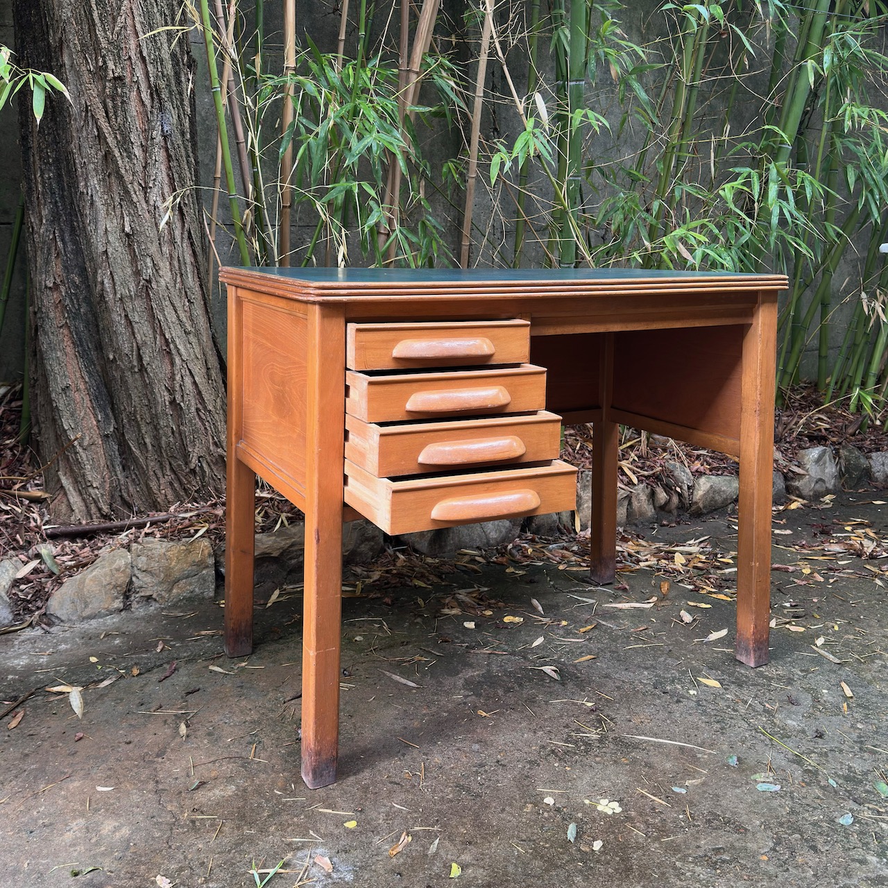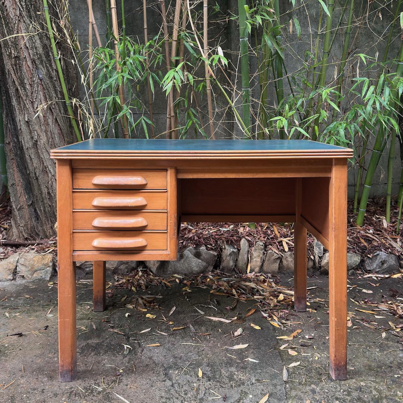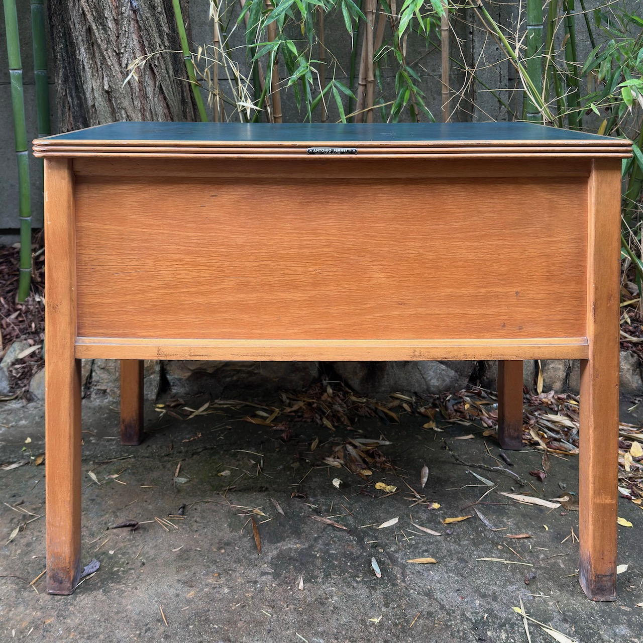 Scrivania da maestro, in noce biondo e piano verde, quattro cassetti frontali su un lato Antonio Ferretti. Italia, sec. XX