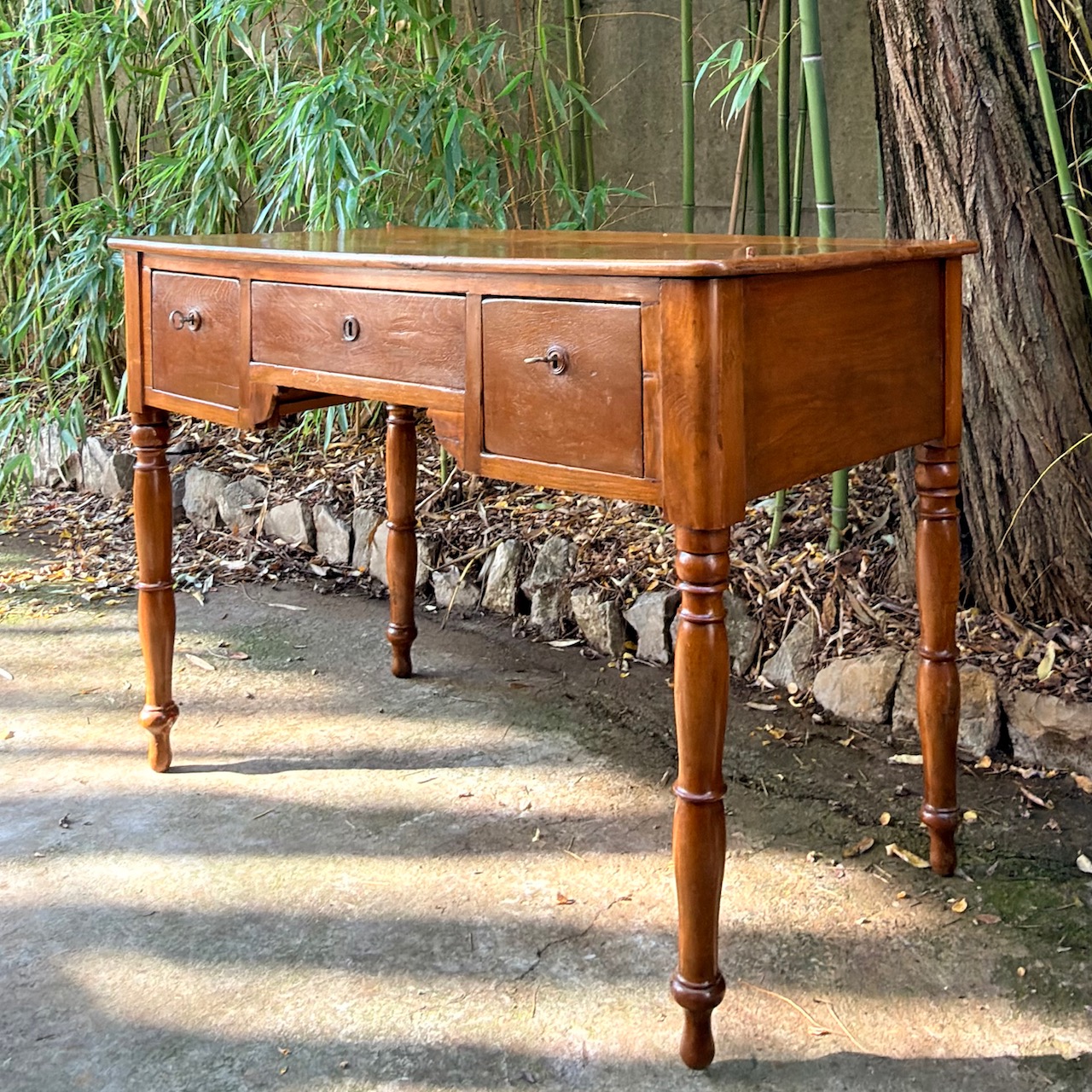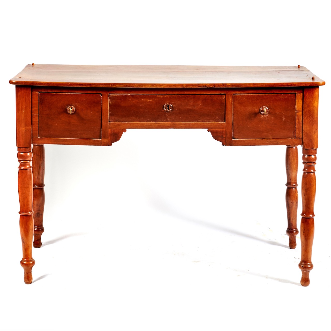 Scrivania in noce a tre cassetti, gambe tornite, piano con perni per alzata. Italia, sec. XIX