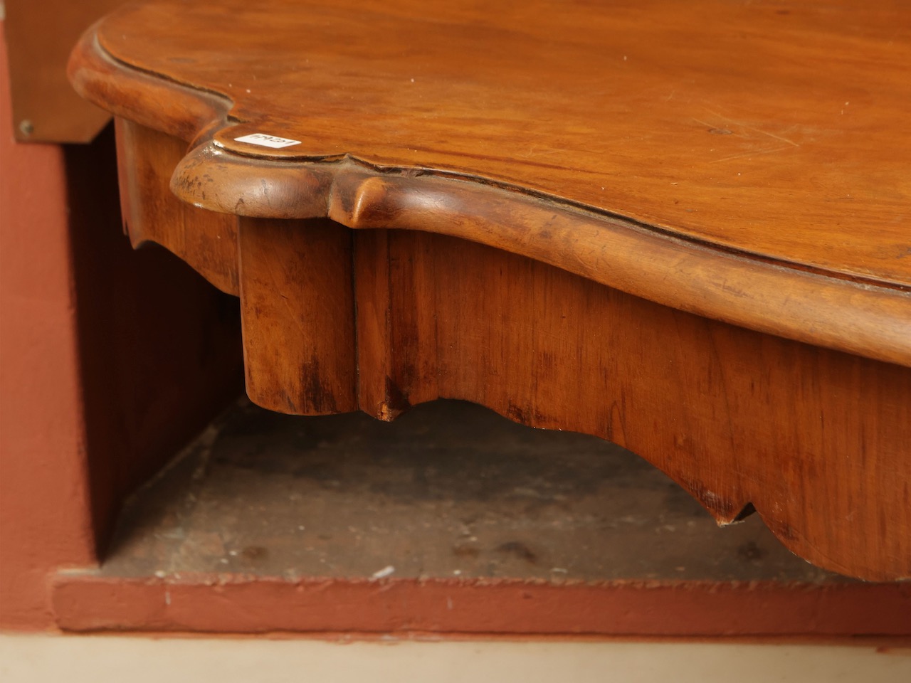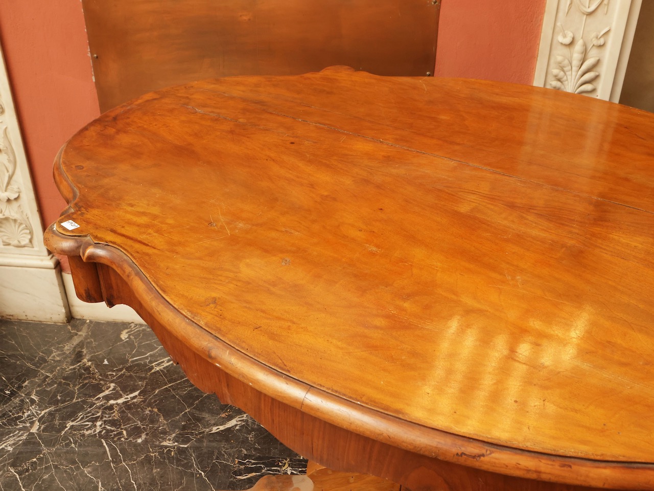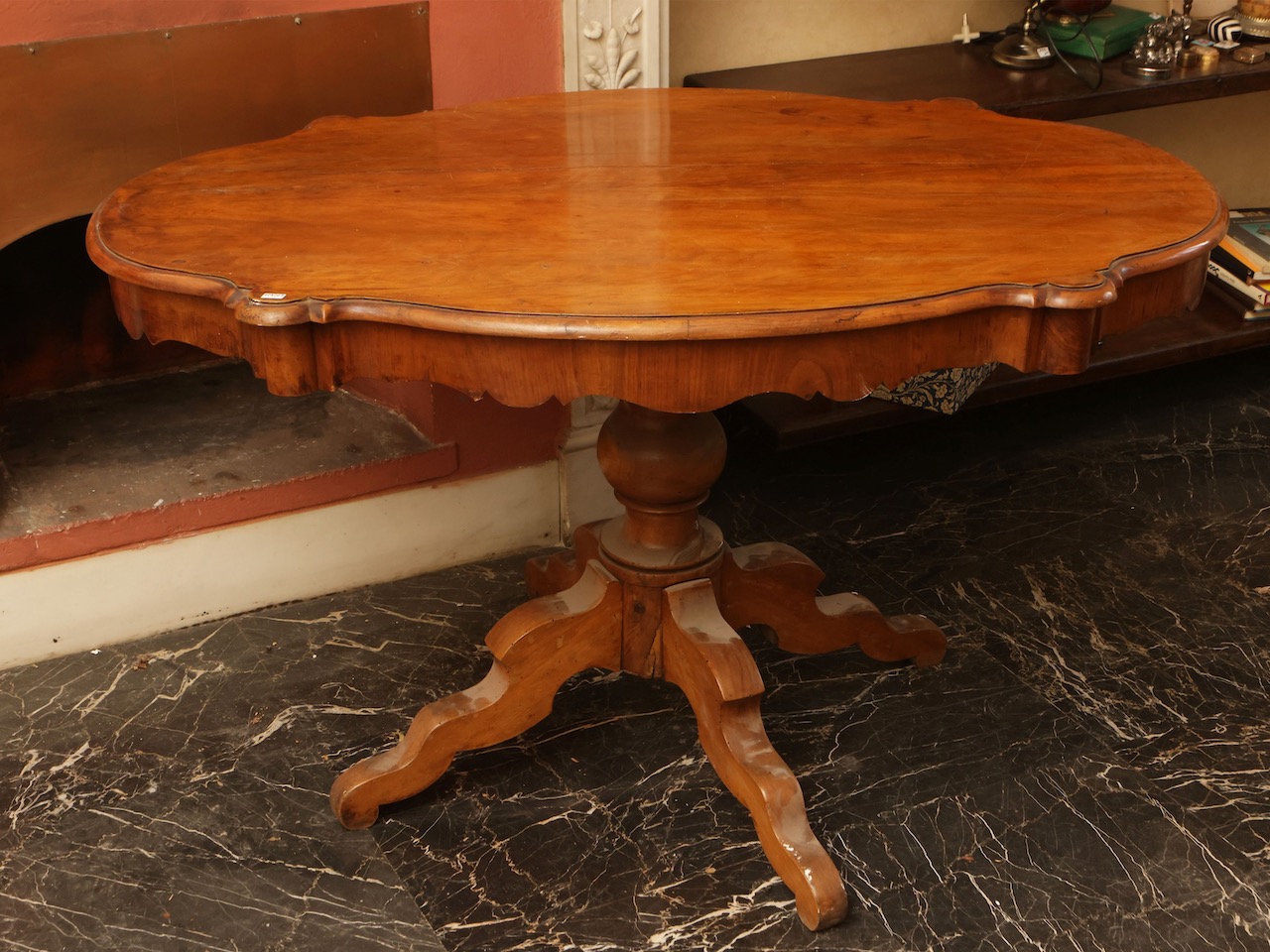 Tavolino da Centro, piano sagomato a biscotto con pendaglio rossa, sostegno centrale tornito su quattro piedi a doppia voluta. Italia, sec. XIX