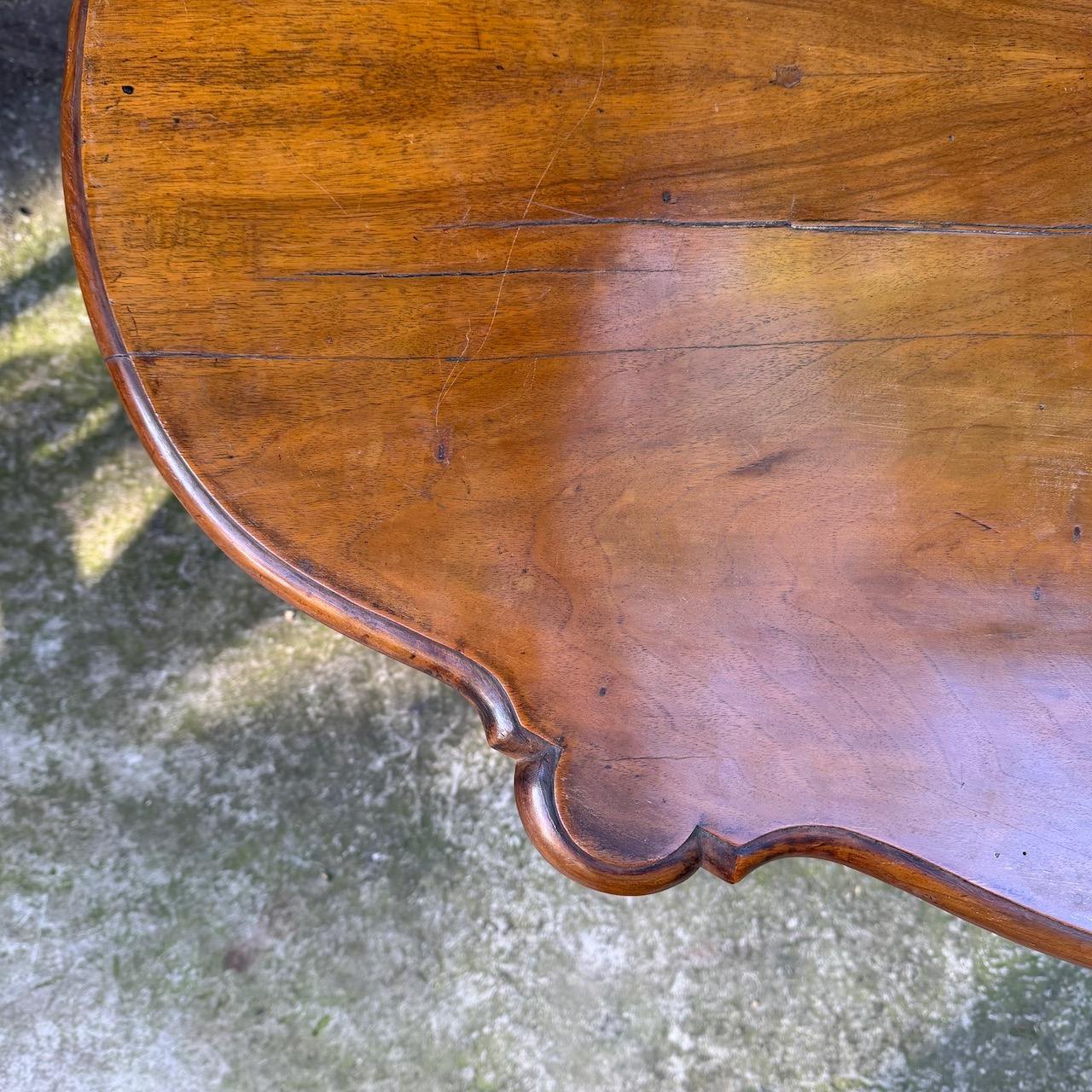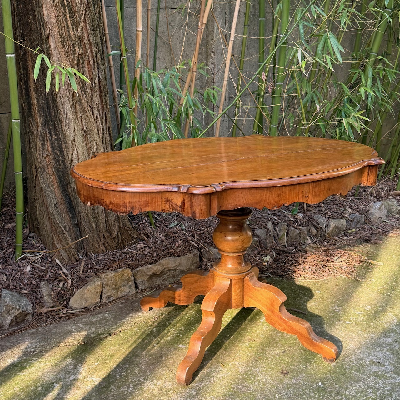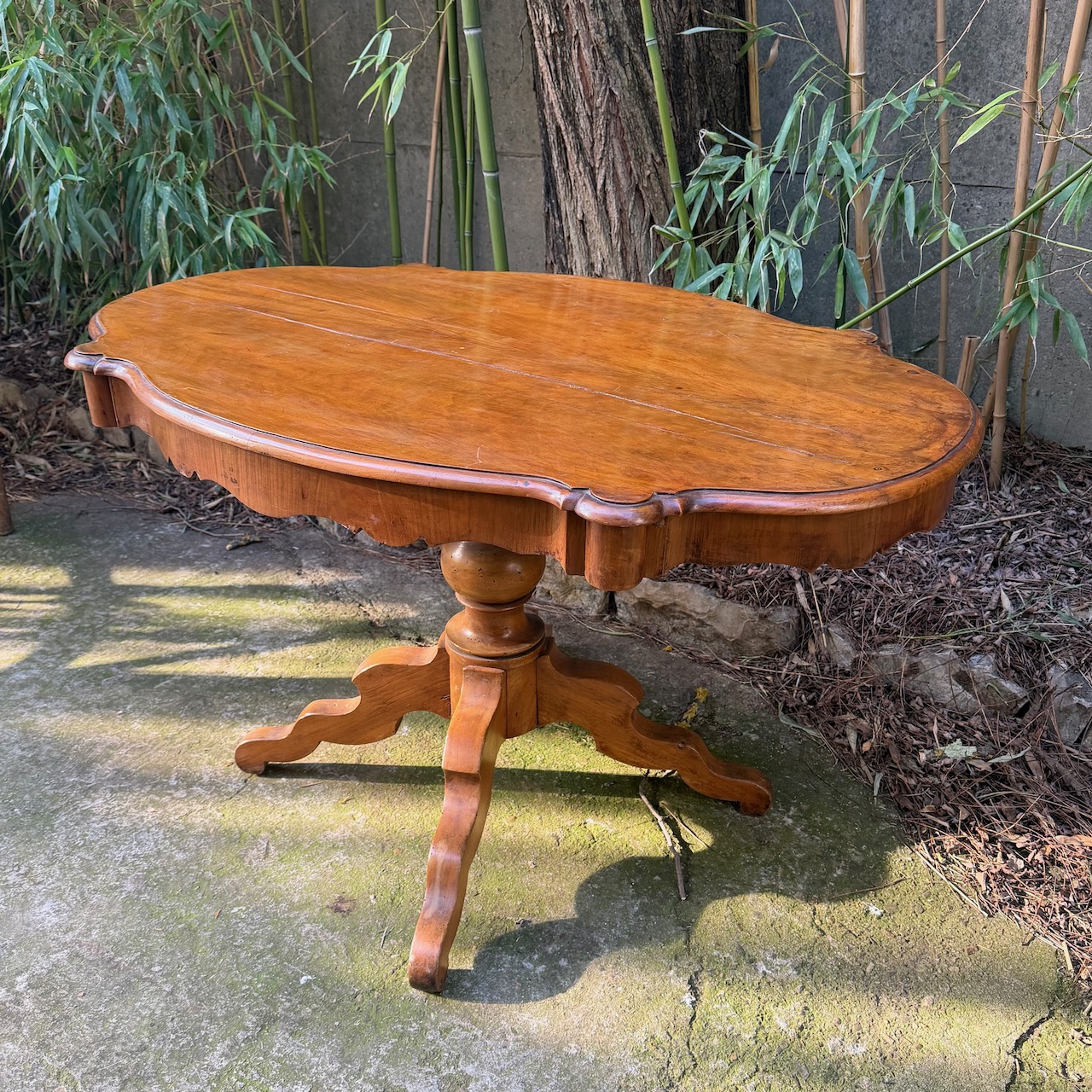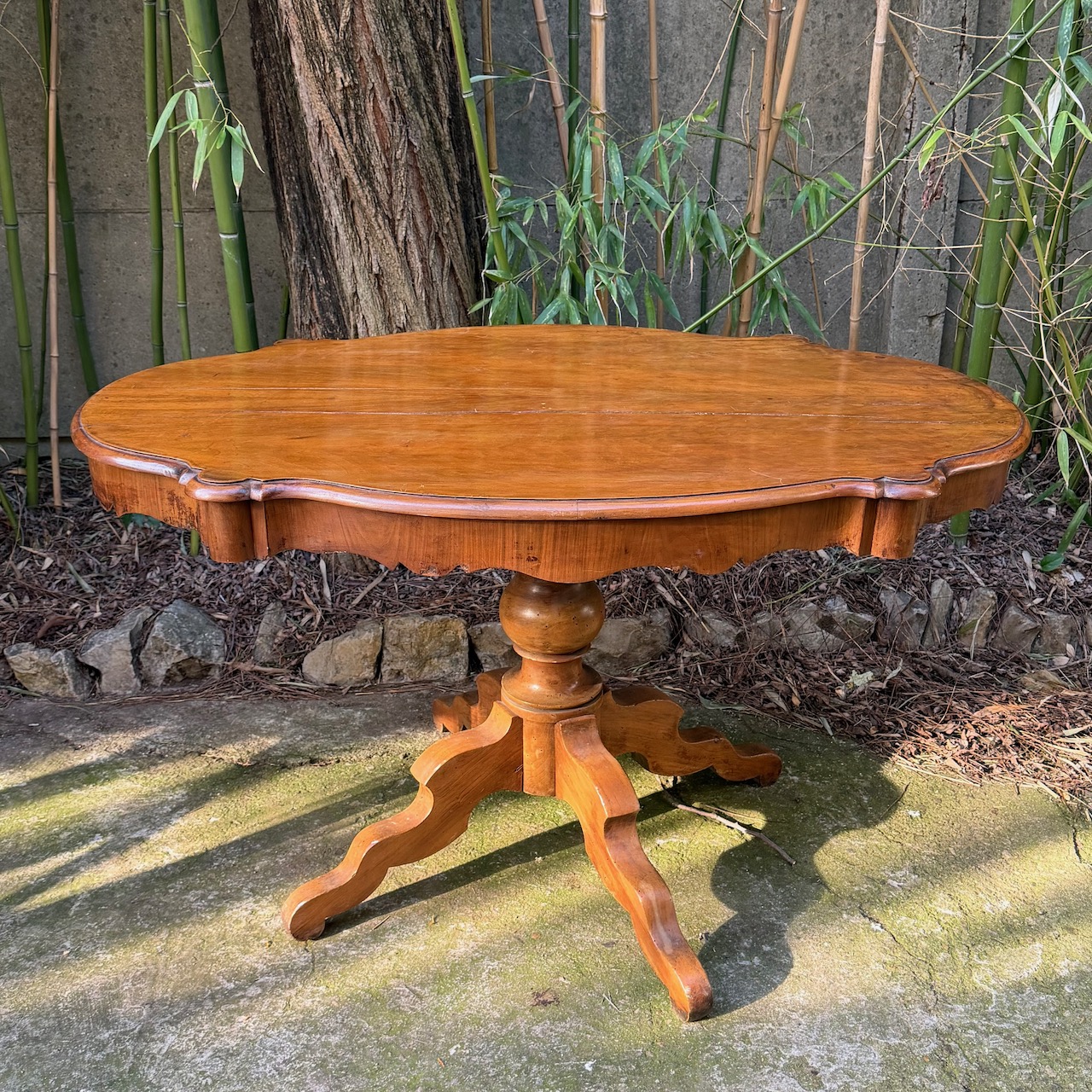 Tavolo da Centro in legno di ciliegio, piano sagomato a biscotto, sostegno centrale tornito su quattro piedi a doppia voluta. Elefante & Lattes. Italia, metà sec. XIX
