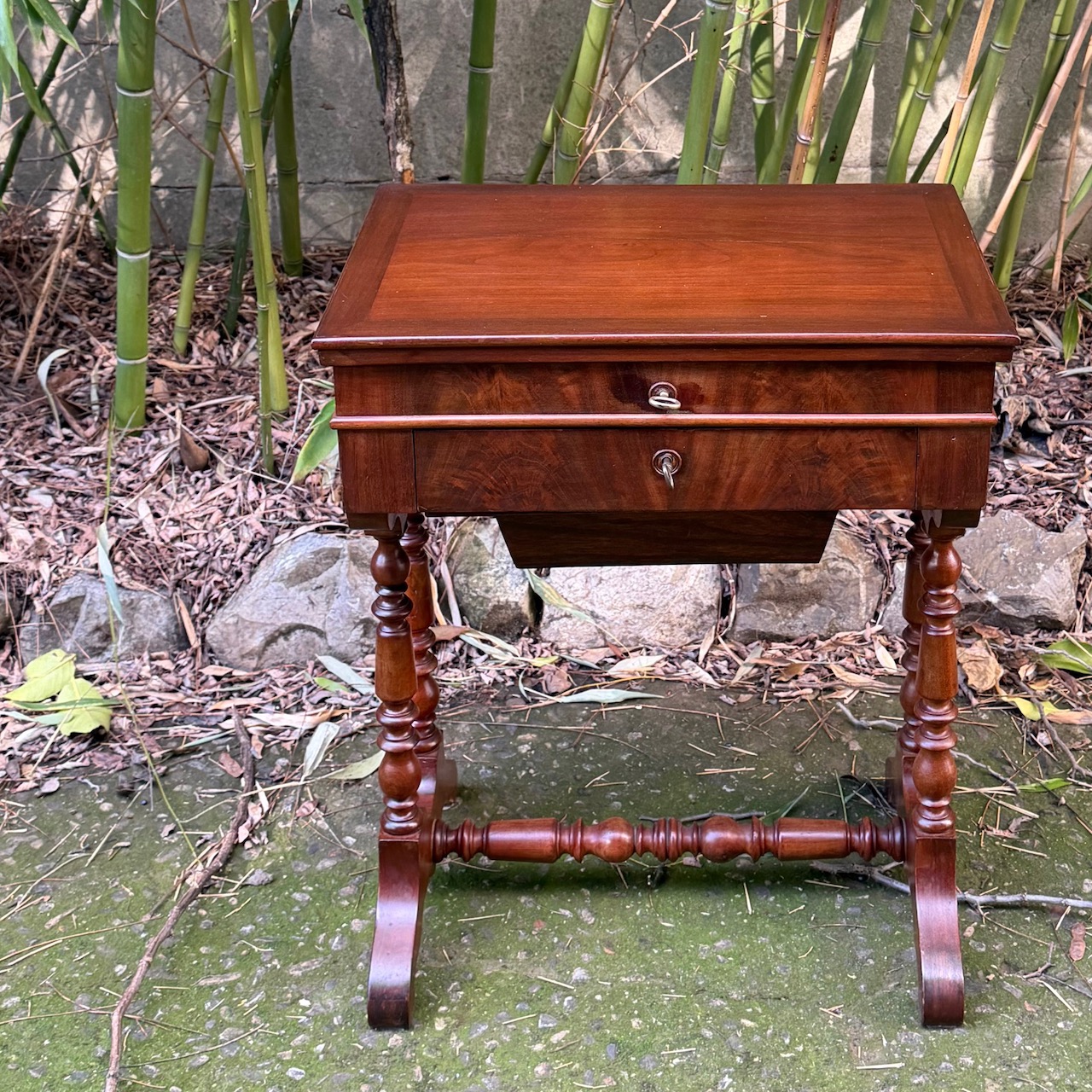 Tavolino da lavoro in mogano e piuma con interni in acero, cassetto sulla fascia e piano apribile a libro con specchio, gambe tornite raccordate da traversa centrale. Toscana, sec. XIX