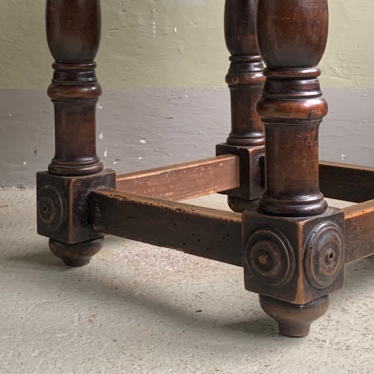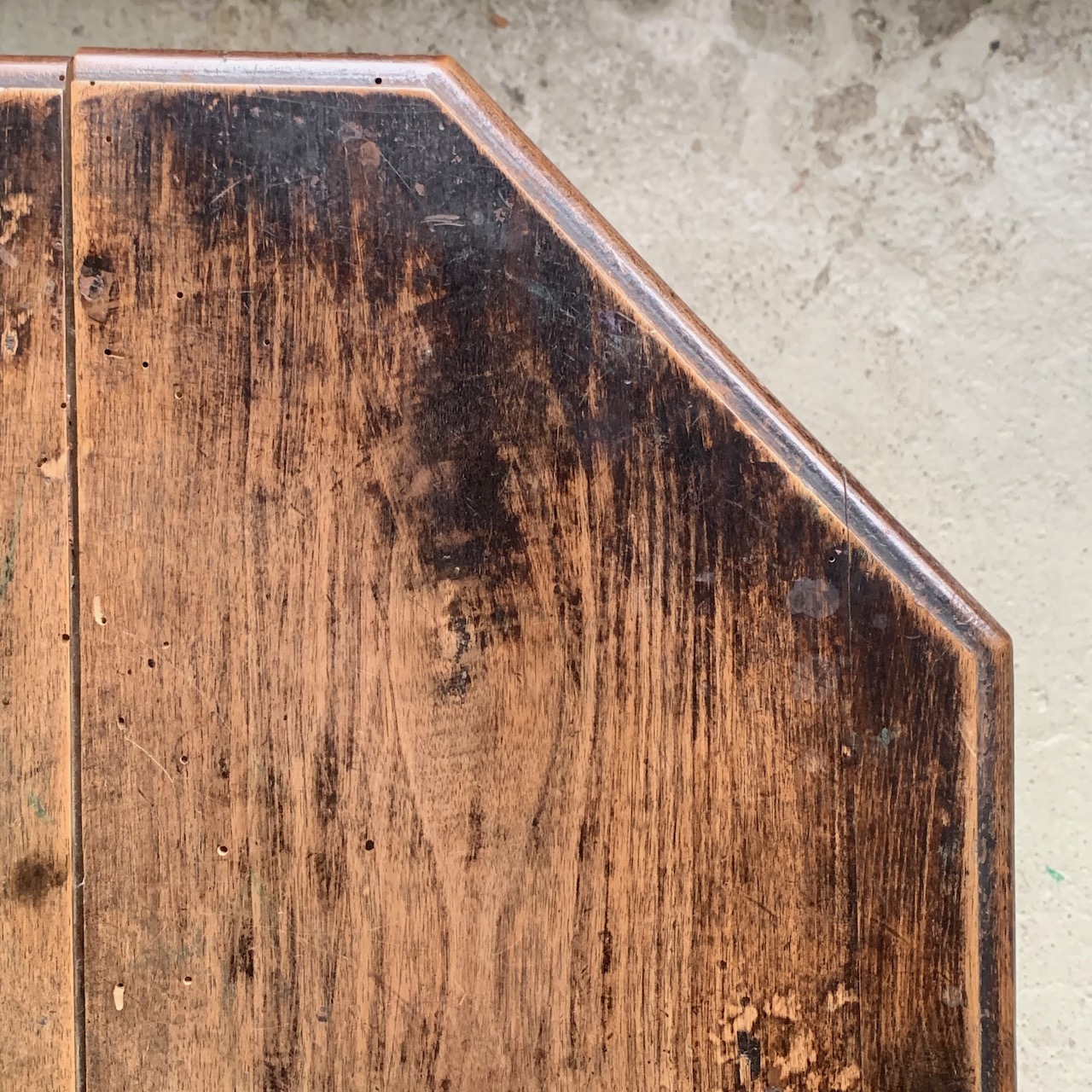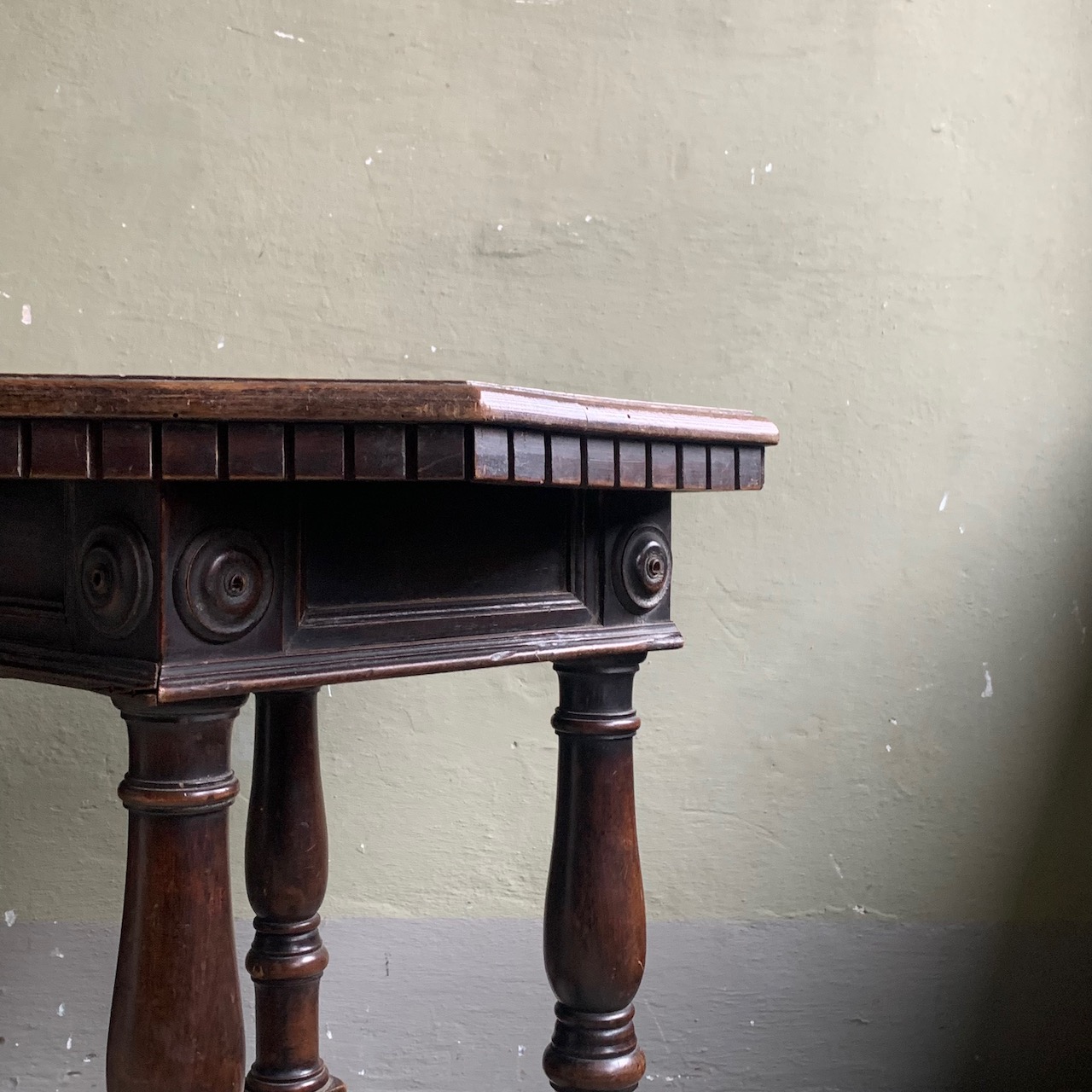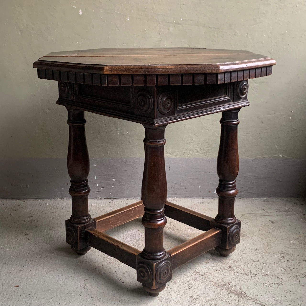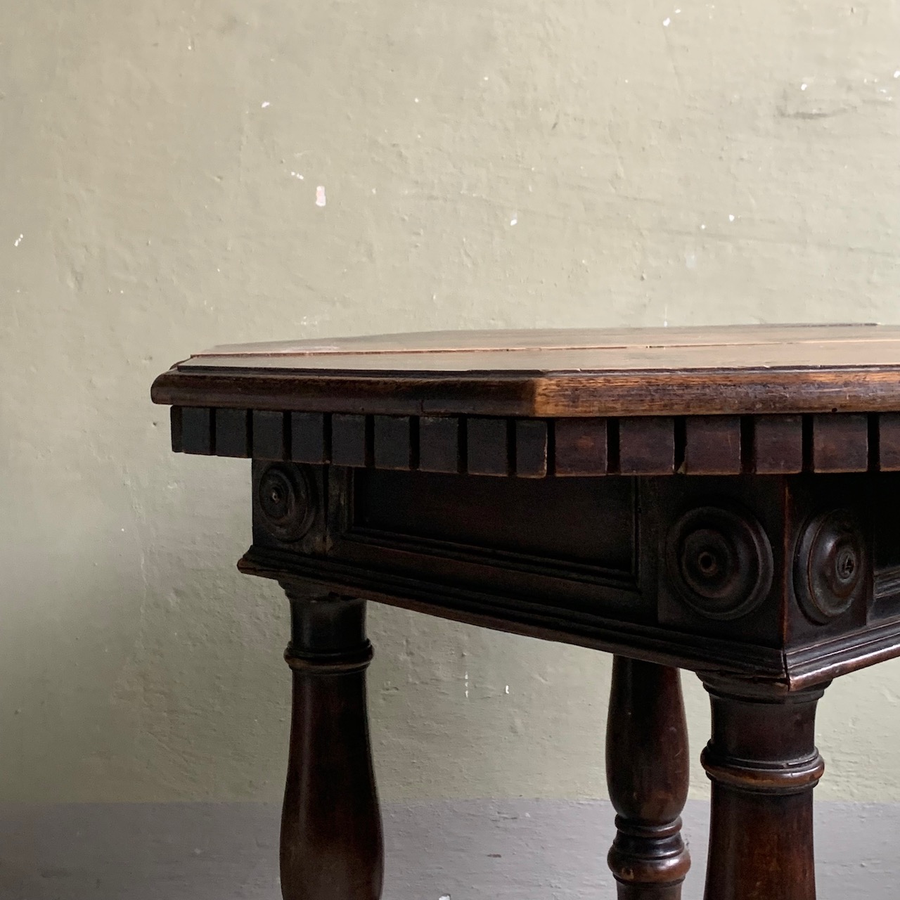 Tavolino da fumo in noce, piano ottagonale intagliato sulla fascia, gambe tornite unite da traverse. Italia, sec. XIX