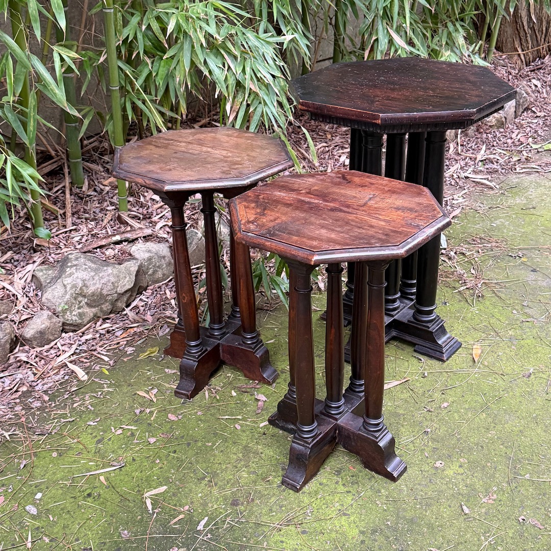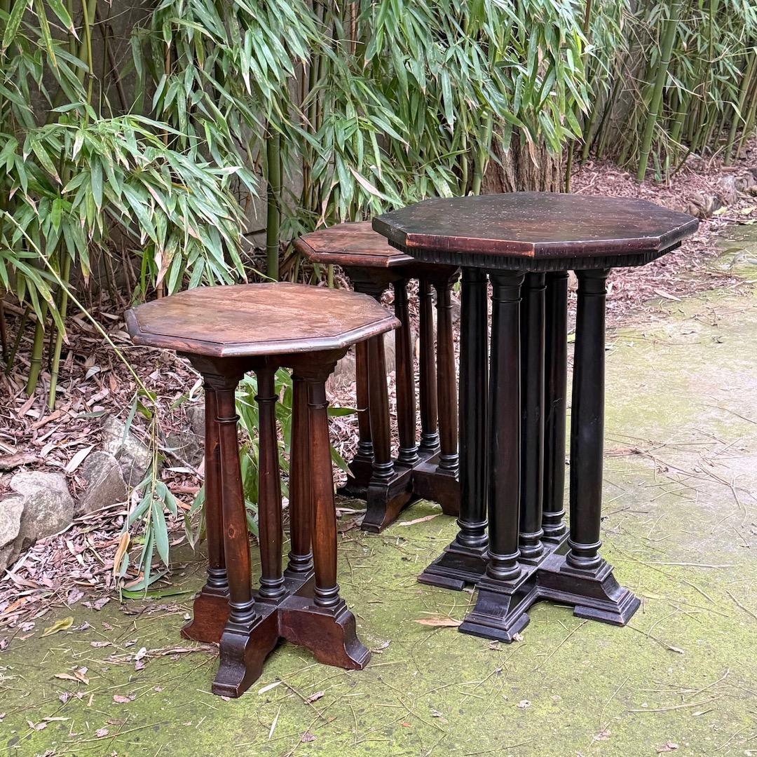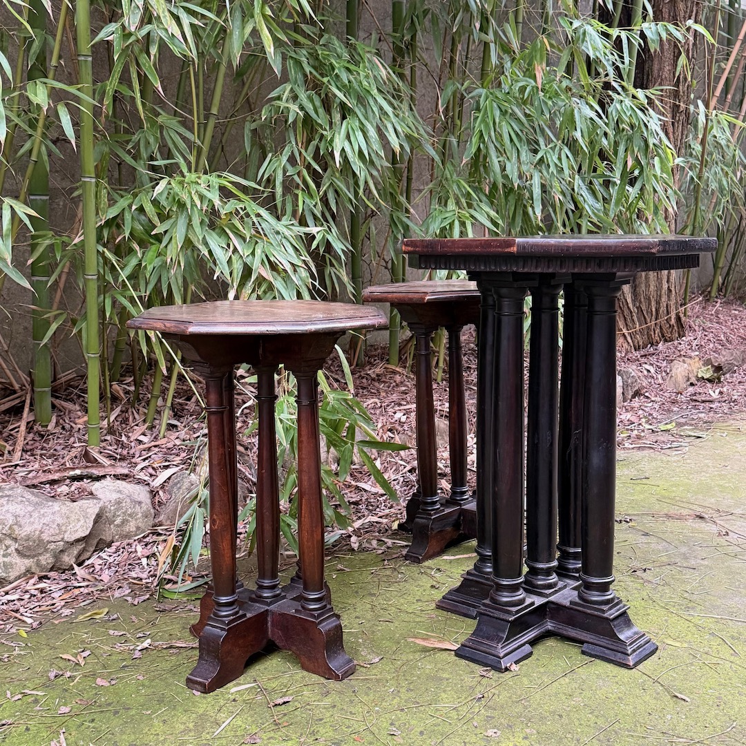 Tre Tavolini da caffè ottagonali in noce, su cinque gambe a colonna. Italia, inizio sec. XX