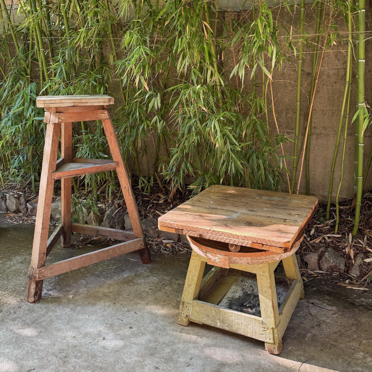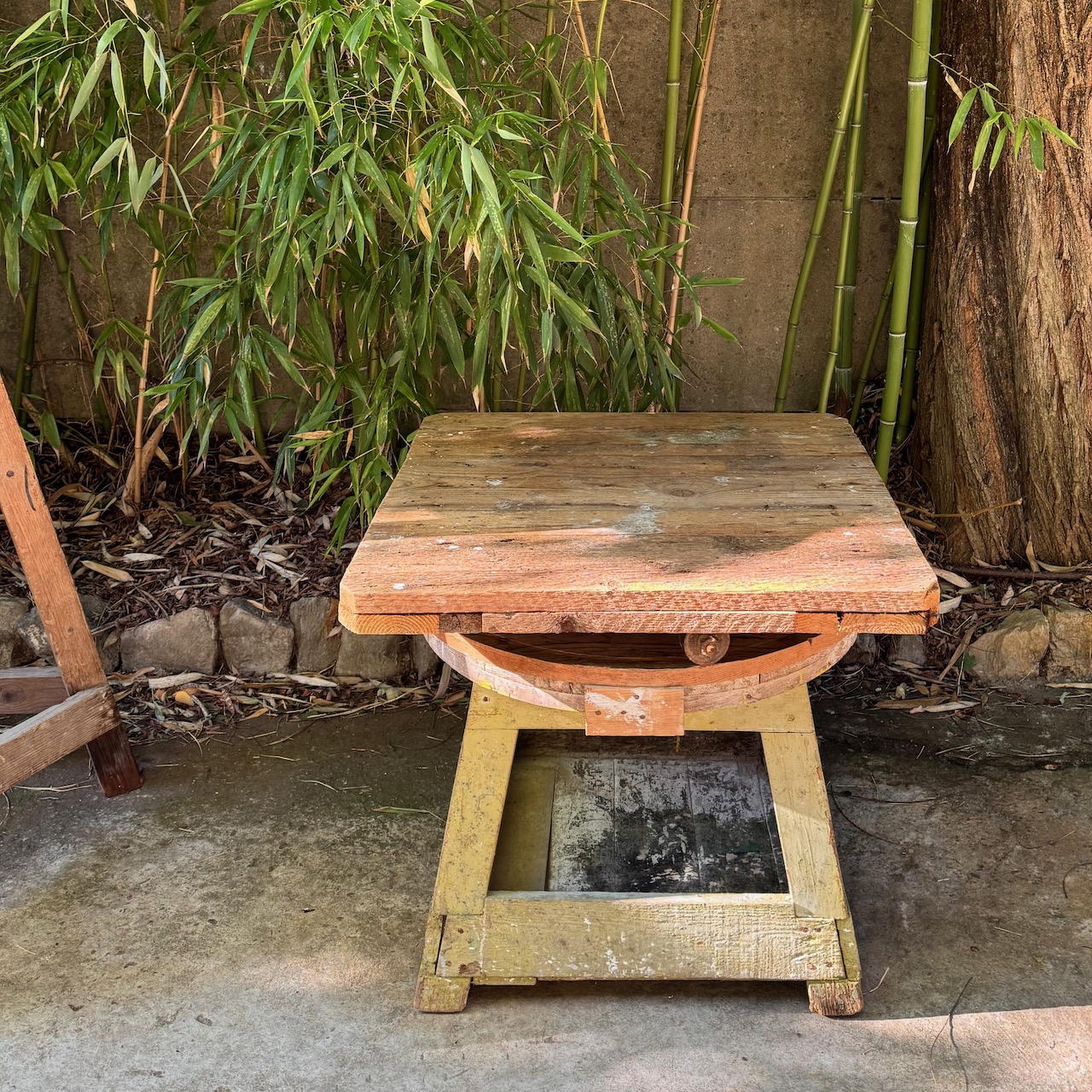 Cavalletto da scultore in legno, piano quadrato girevole. Italia, sec. XX