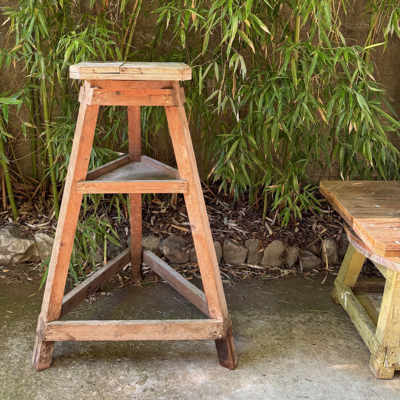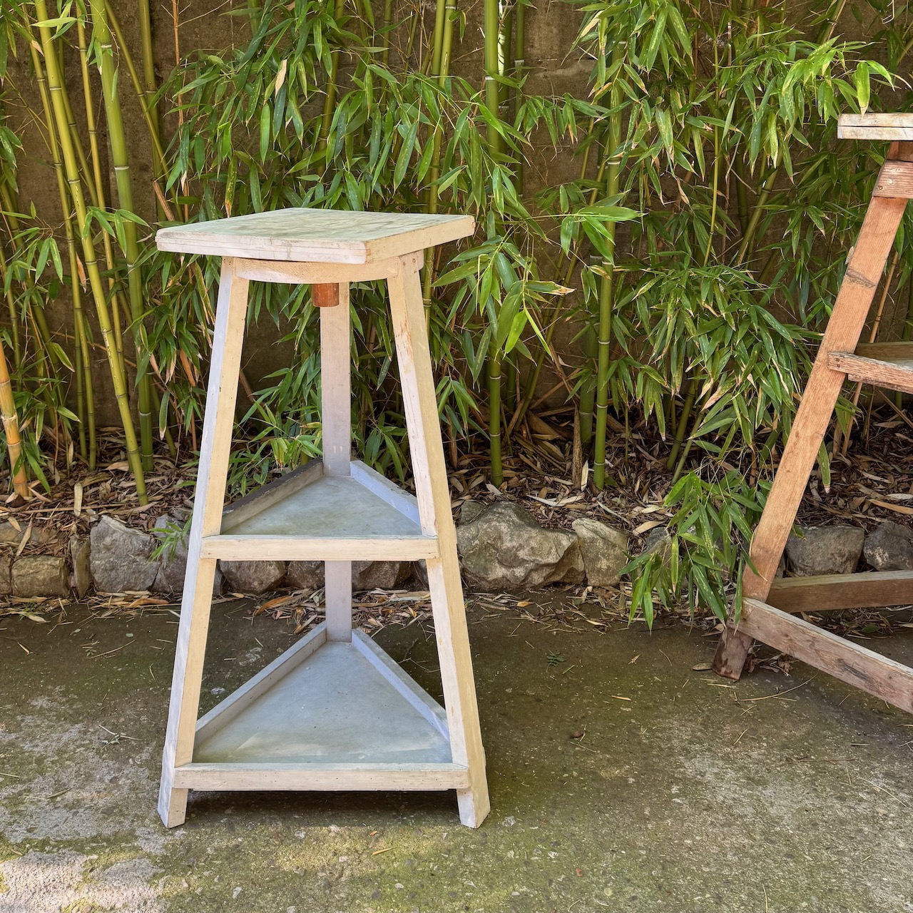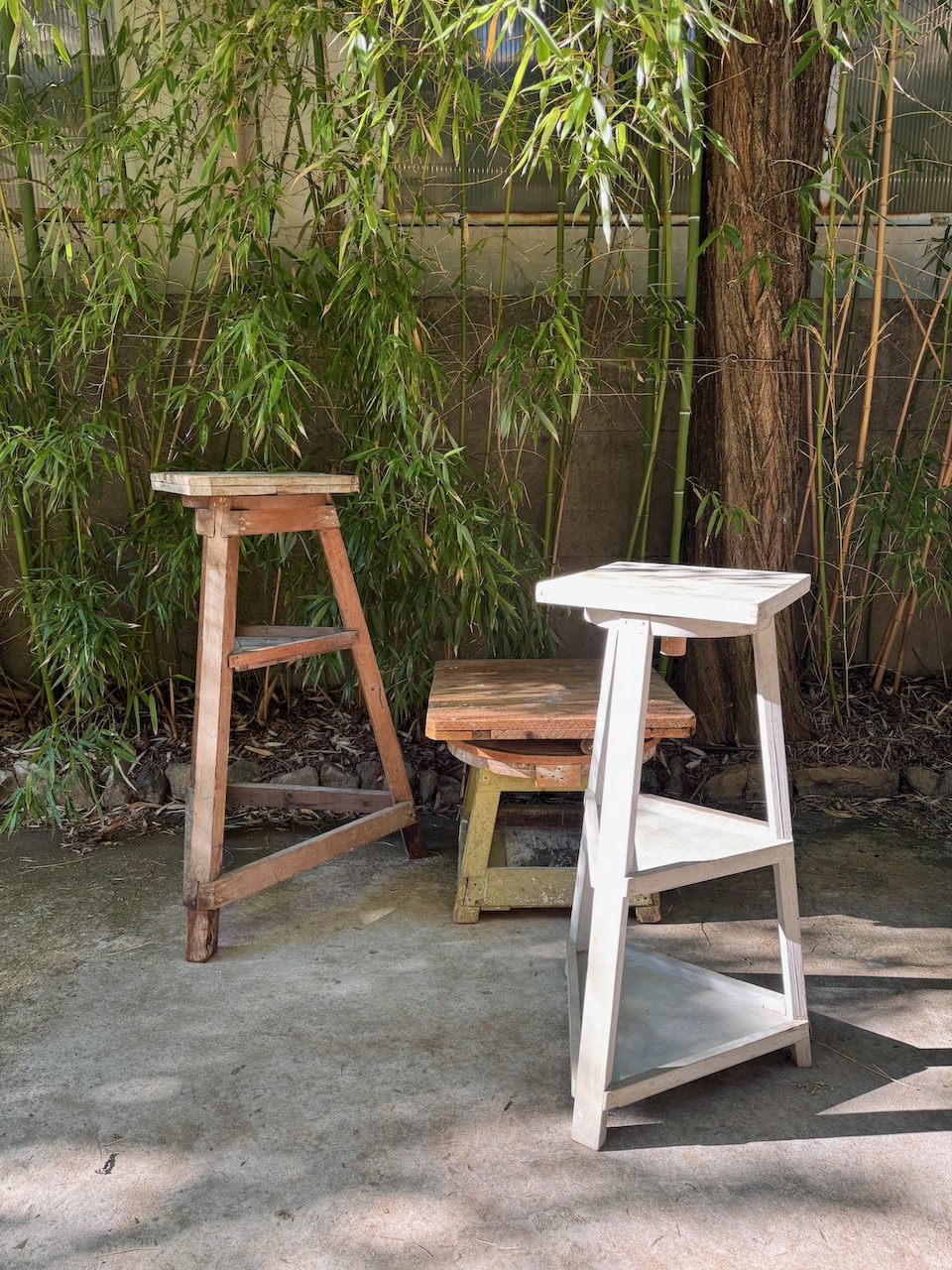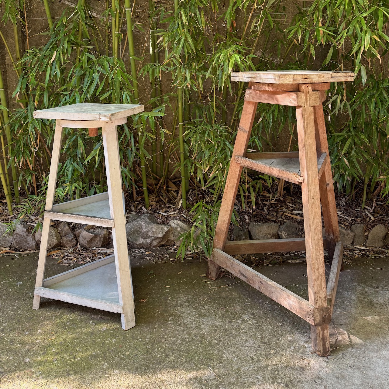 Due tornii da scultore in legno, uno a tre ripiani laccati bianchi, uno a due ripiani. Italia, sec. XX