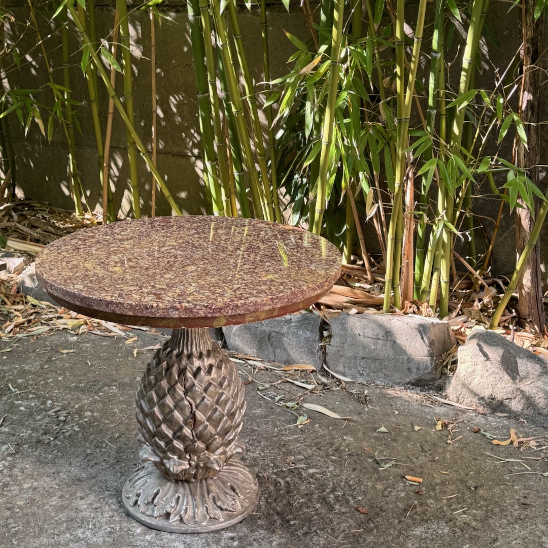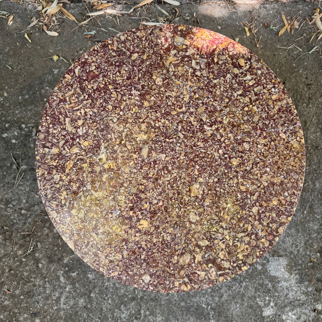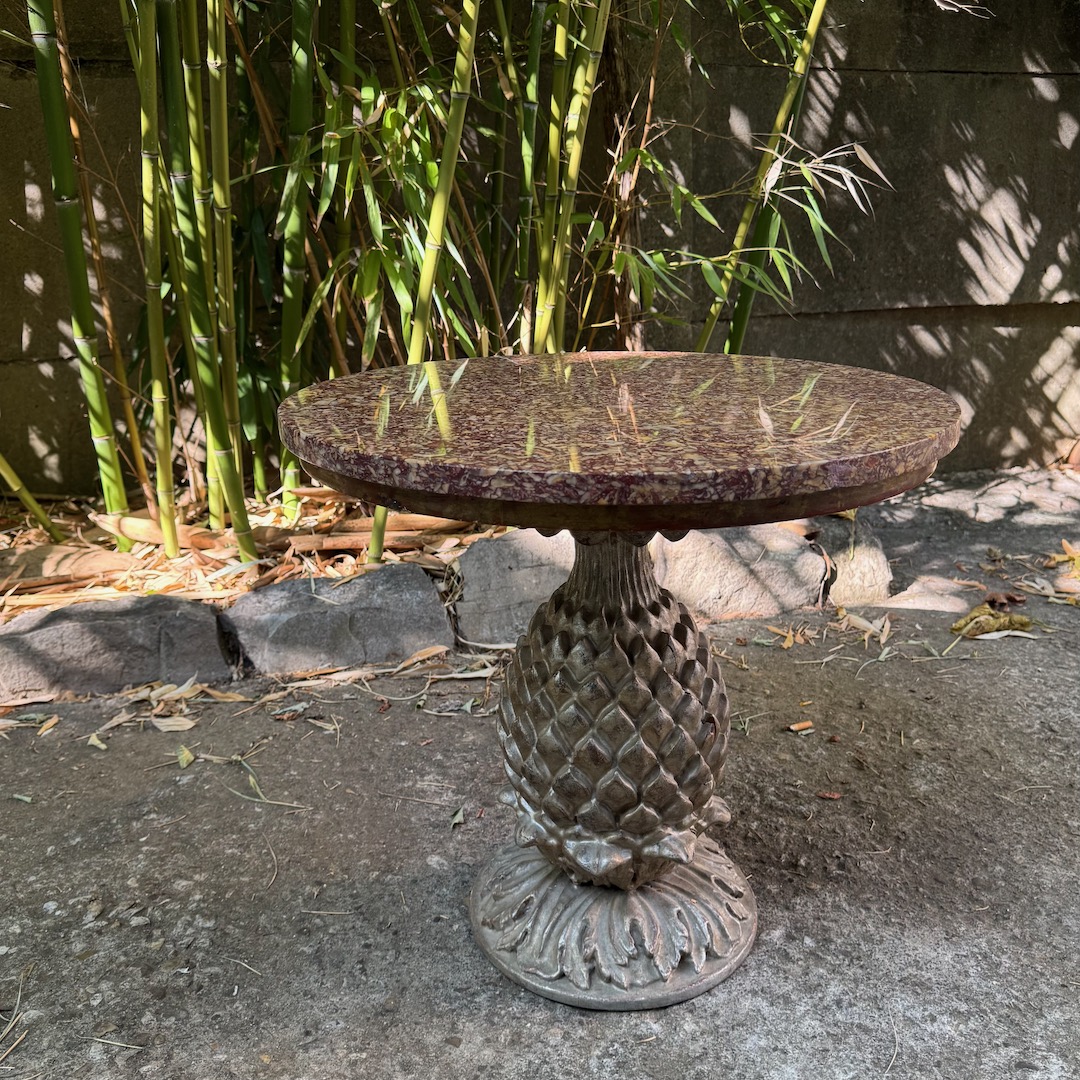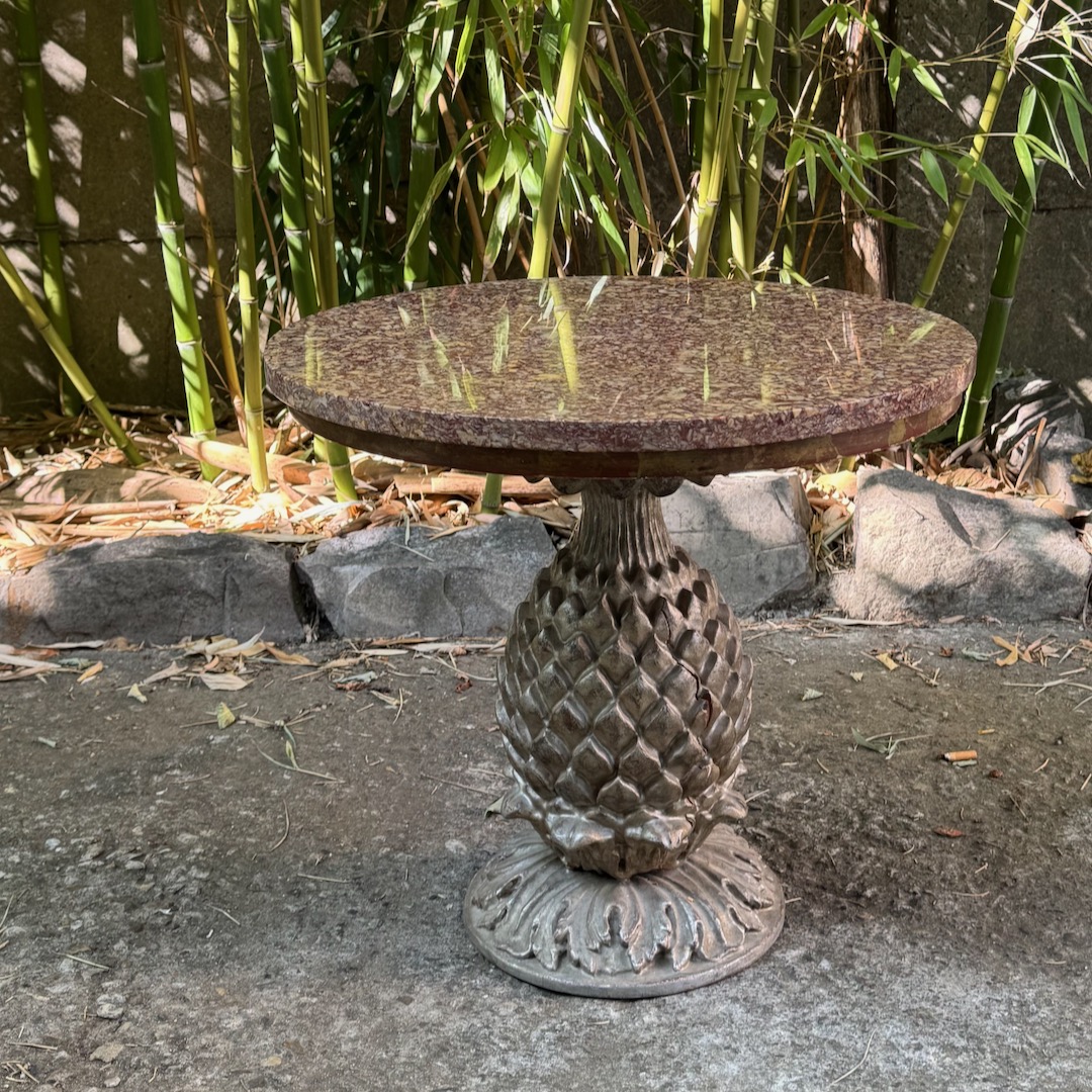 Tavolino circolare piano in porfido africano su base in legno argentato ad ananas. Italia, sec. XIX