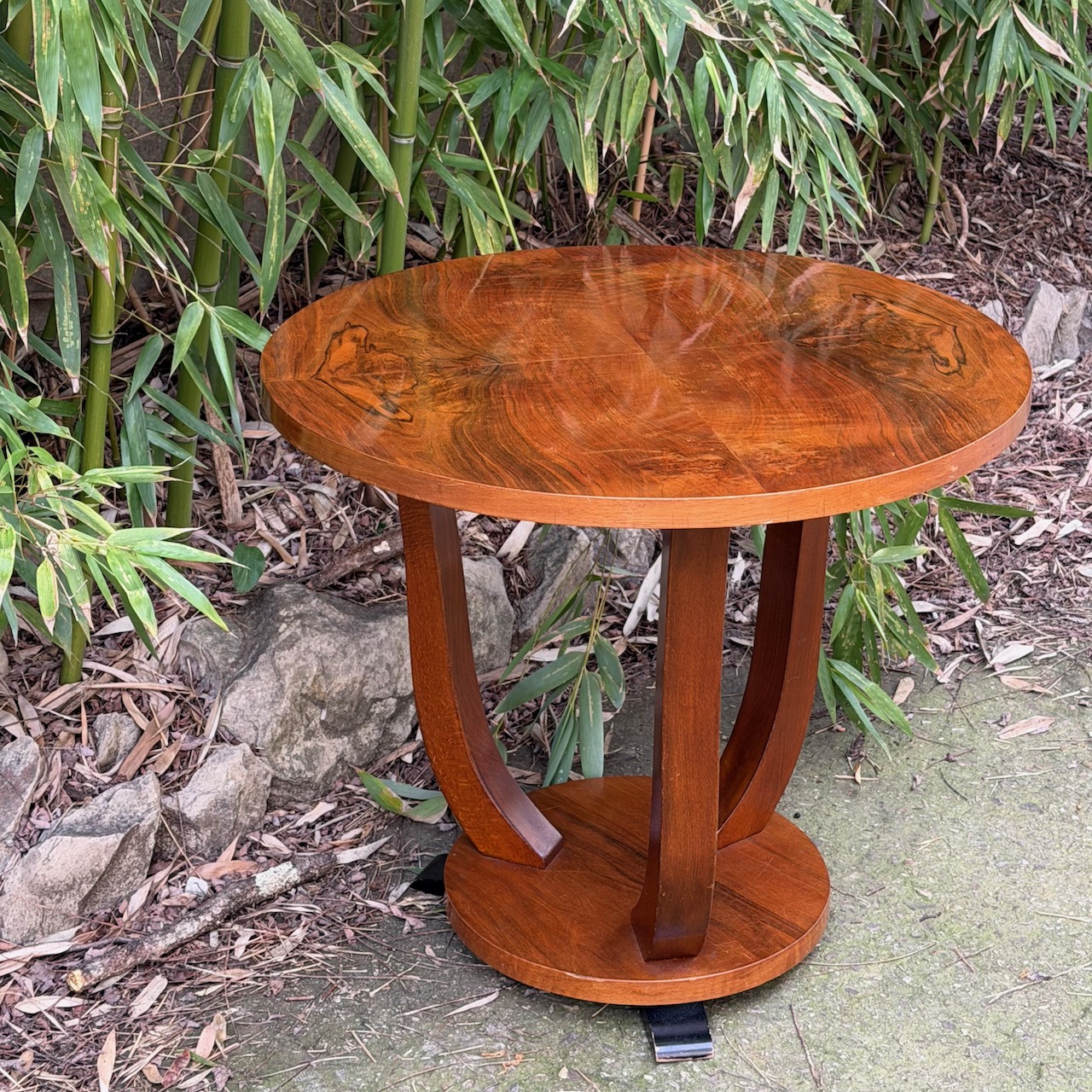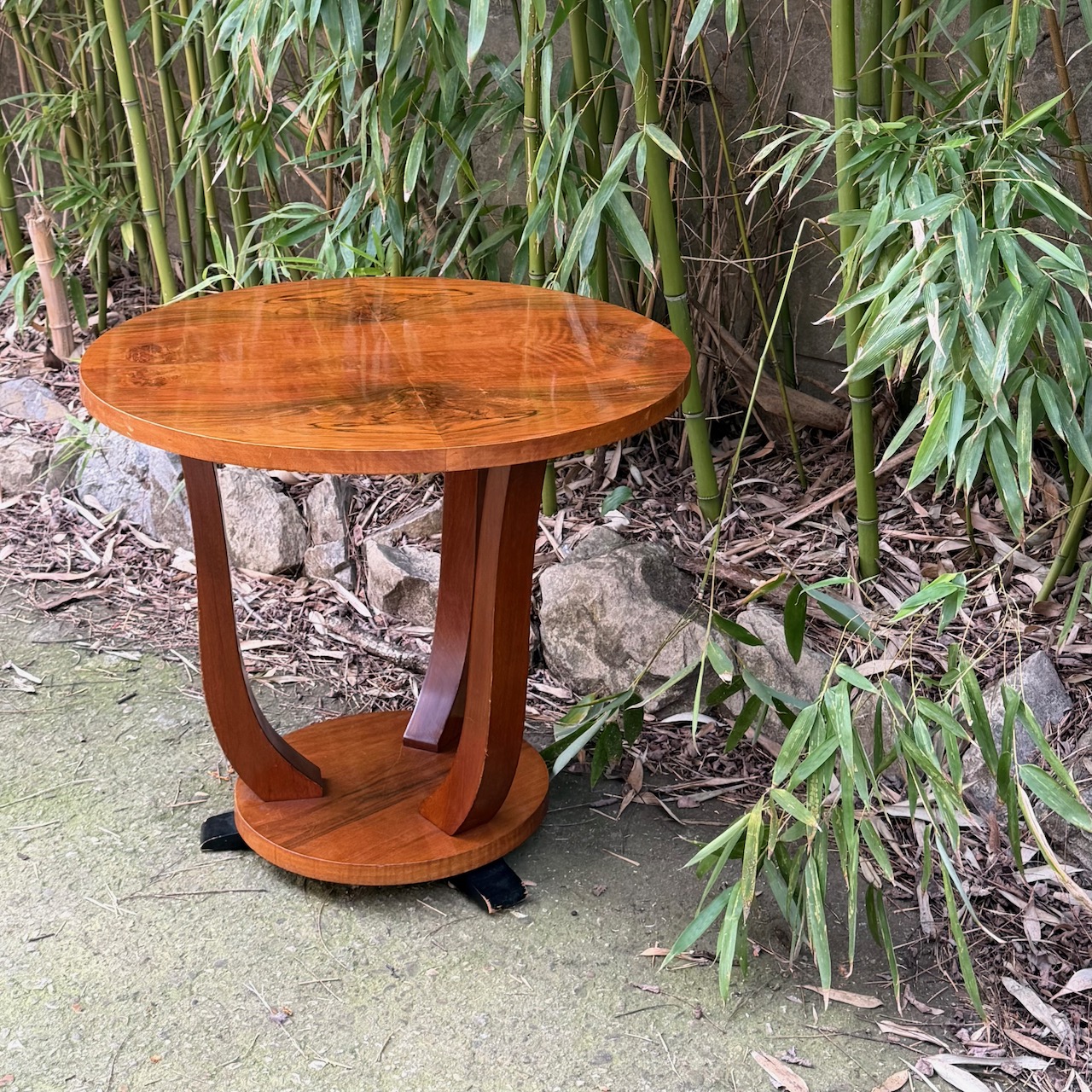 Tavolo da fumo Decò, in noce, piano circolare su tre gambe ricurve e base centrale poggiante su tre piedini ebanizzati. Francia, 1930 ca