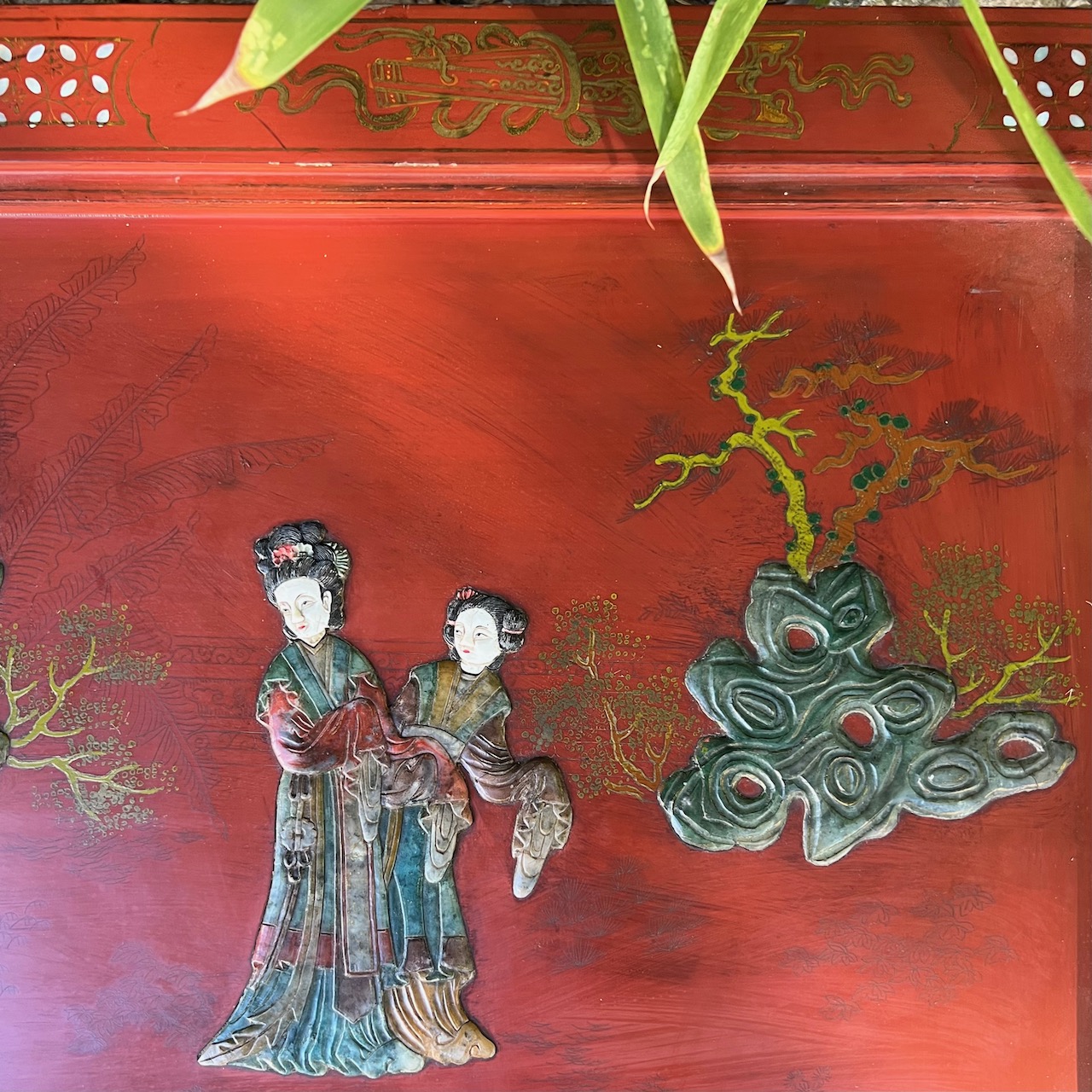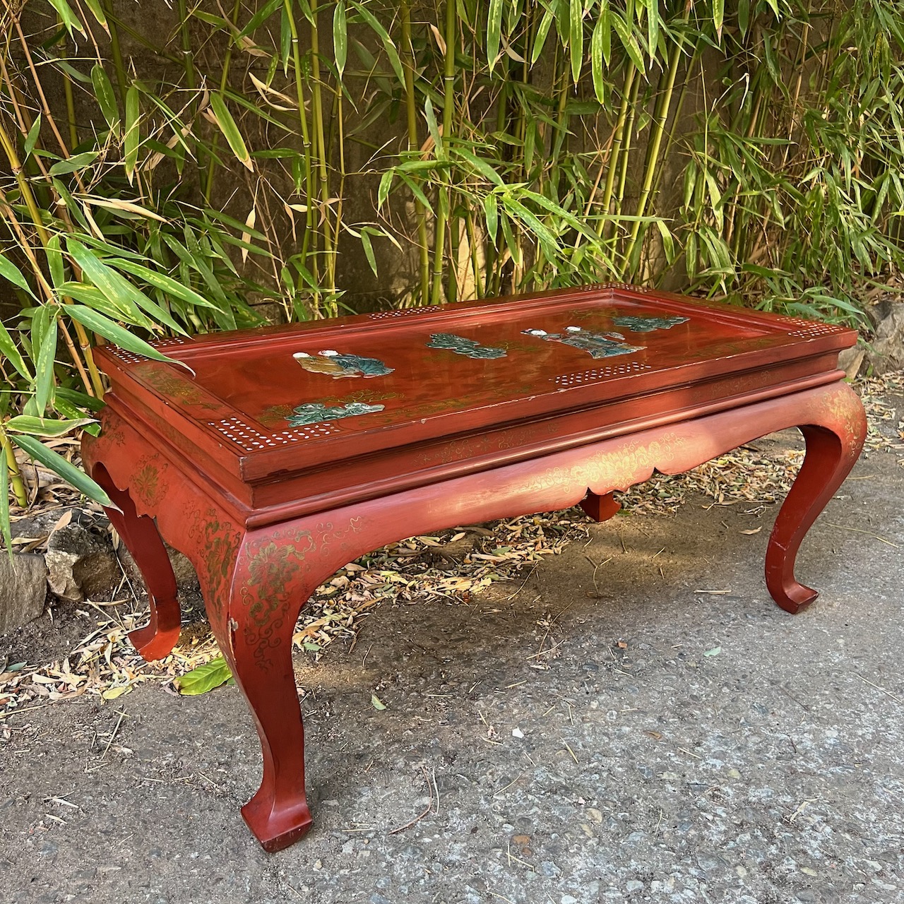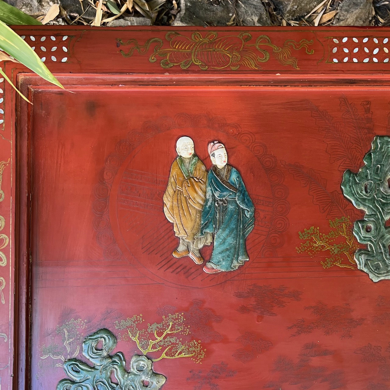 Tavolo basso in lacca rossa con decorazioni orientali in rilievo in giada e diaspro. Cina, 1930 circa