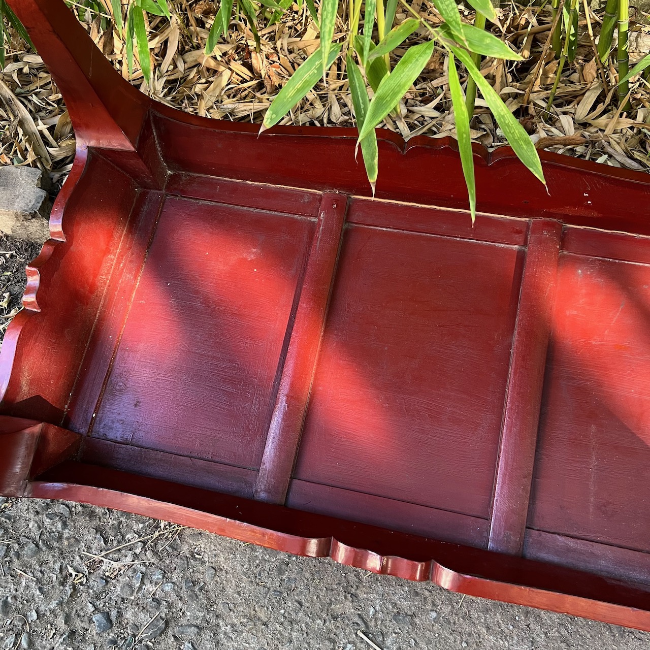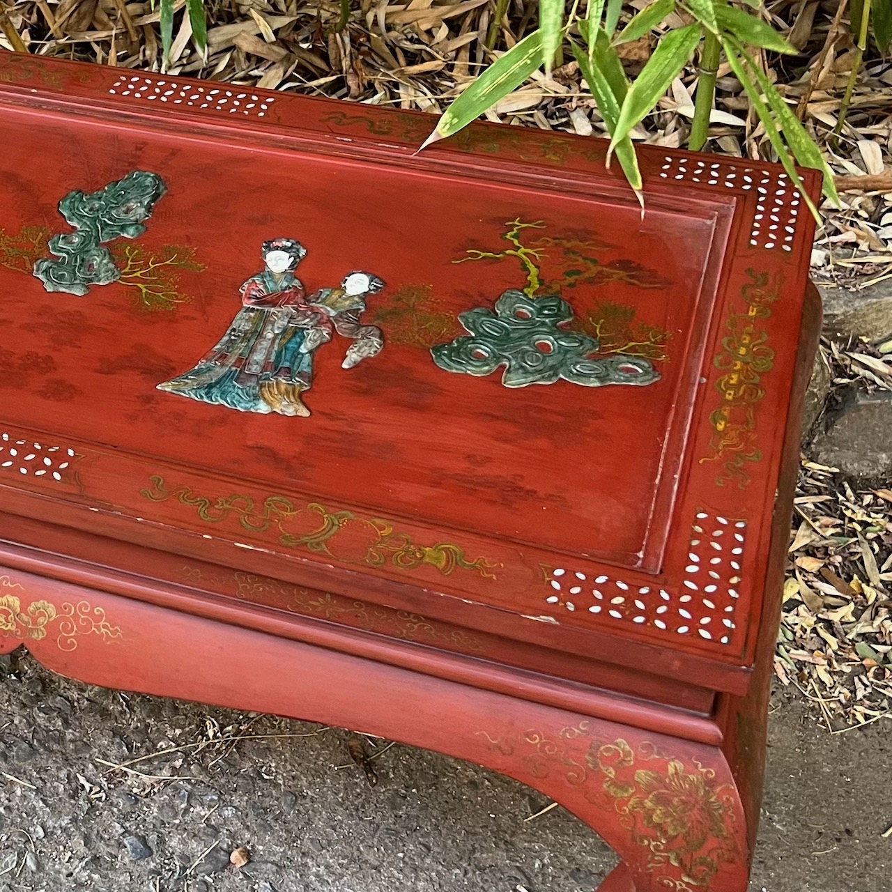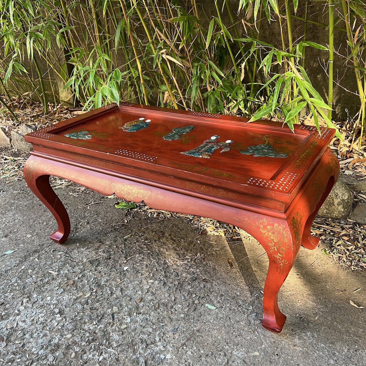 Tavolo basso in lacca rossa con decorazioni orientali in rilievo in giada e diaspro. Cina, 1930 circa
