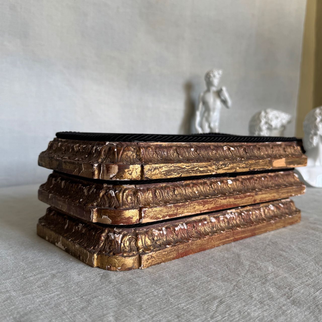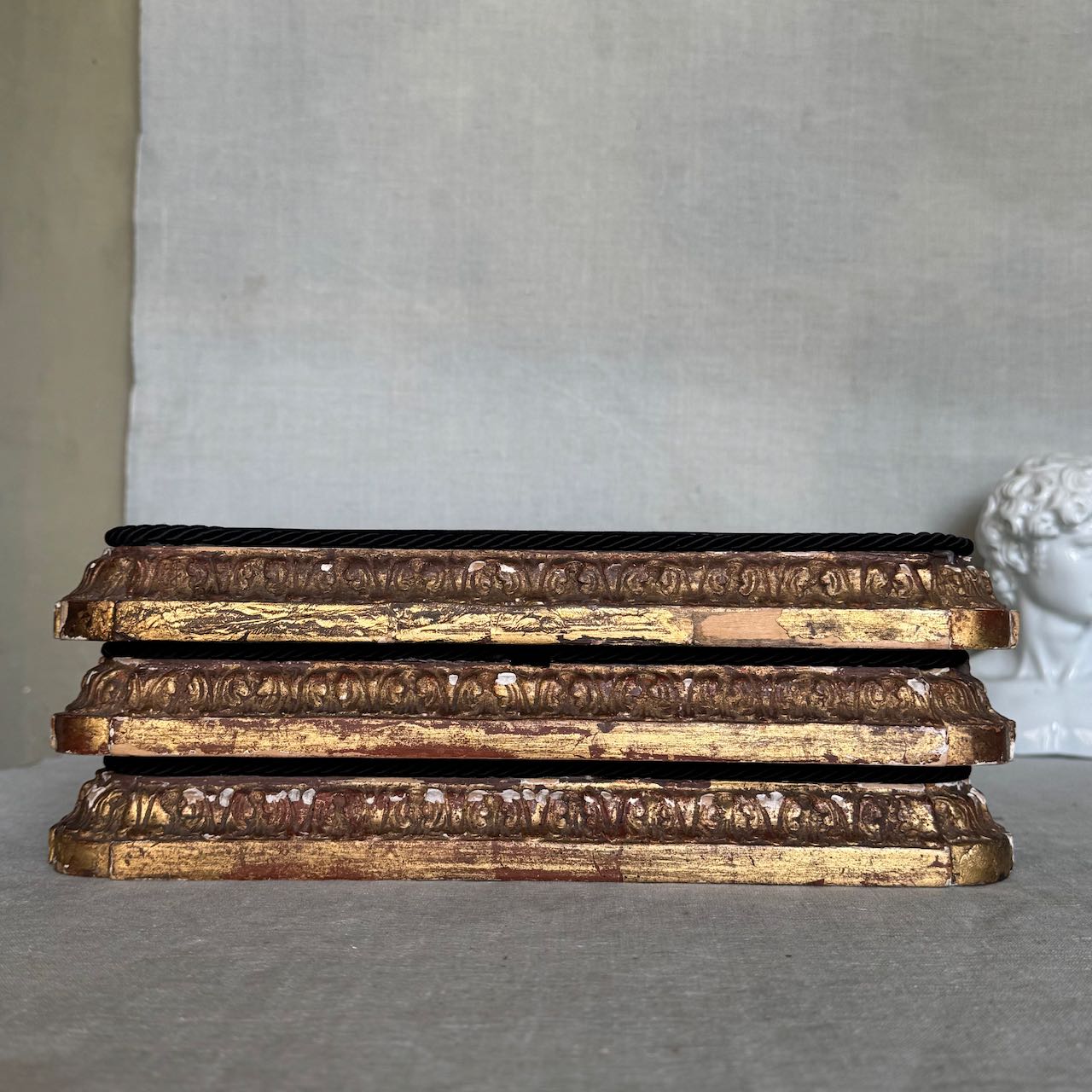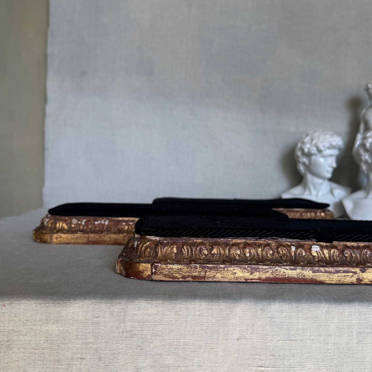 Collezione tre basi per esposizione rettangolari in legno dorato e velluto nero, cordino sul bordo. Italia, sec. XX