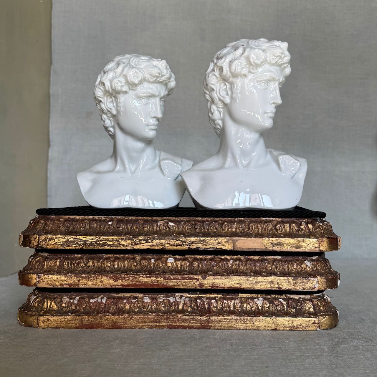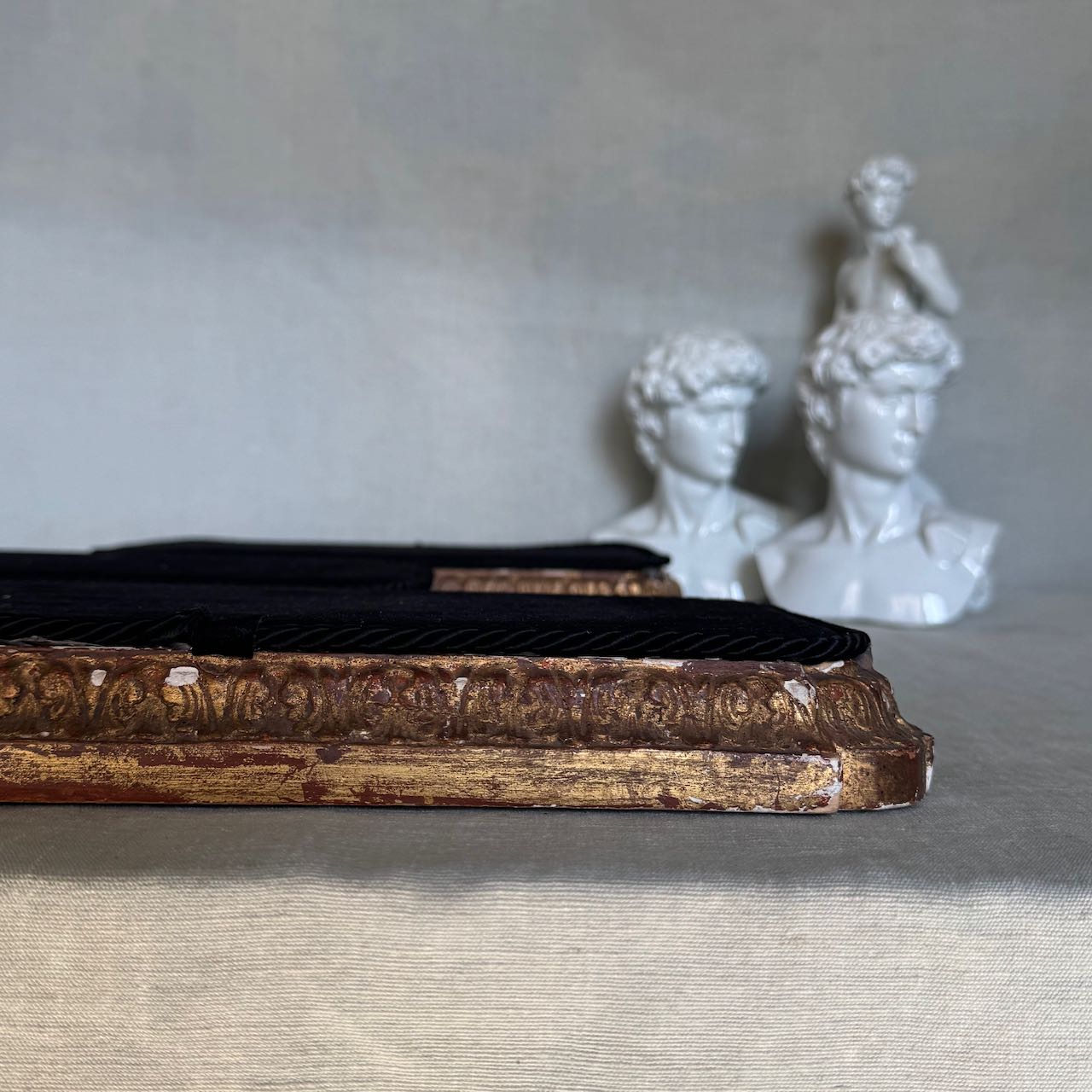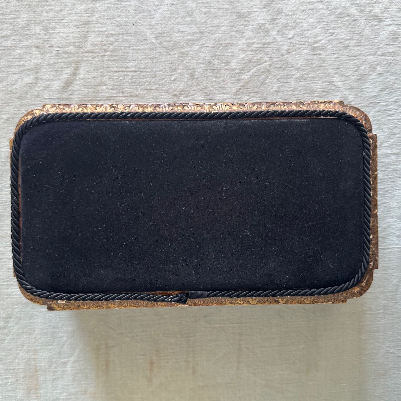 Collezione tre basi per esposizione rettangolari in legno dorato e velluto nero, cordino sul bordo. Italia, sec. XX
