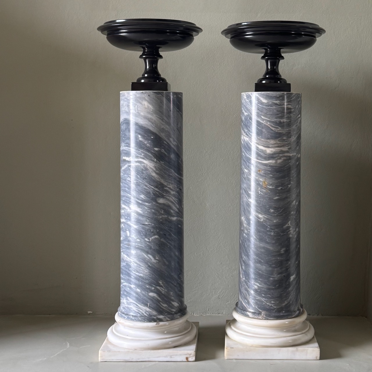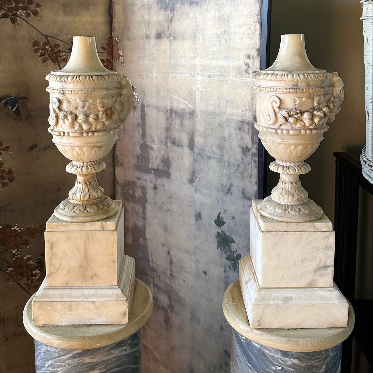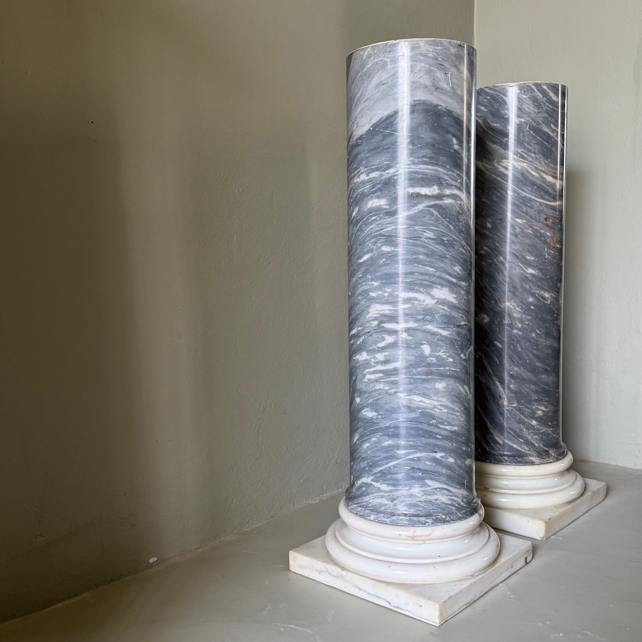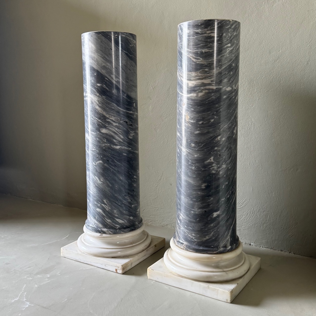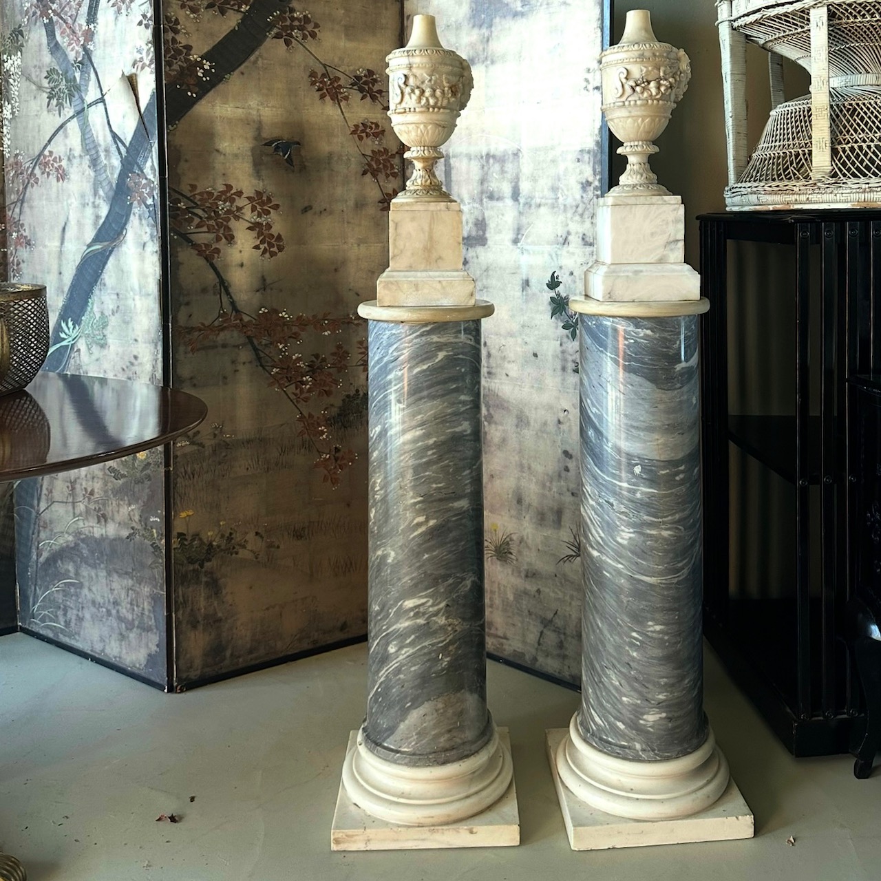 Coppia di grandi colonne in marmo bianco e marmo grigio nuvolato, lampade en pendant in alabastro scolpiti a ghirlande. Italia, fine sec. XIX