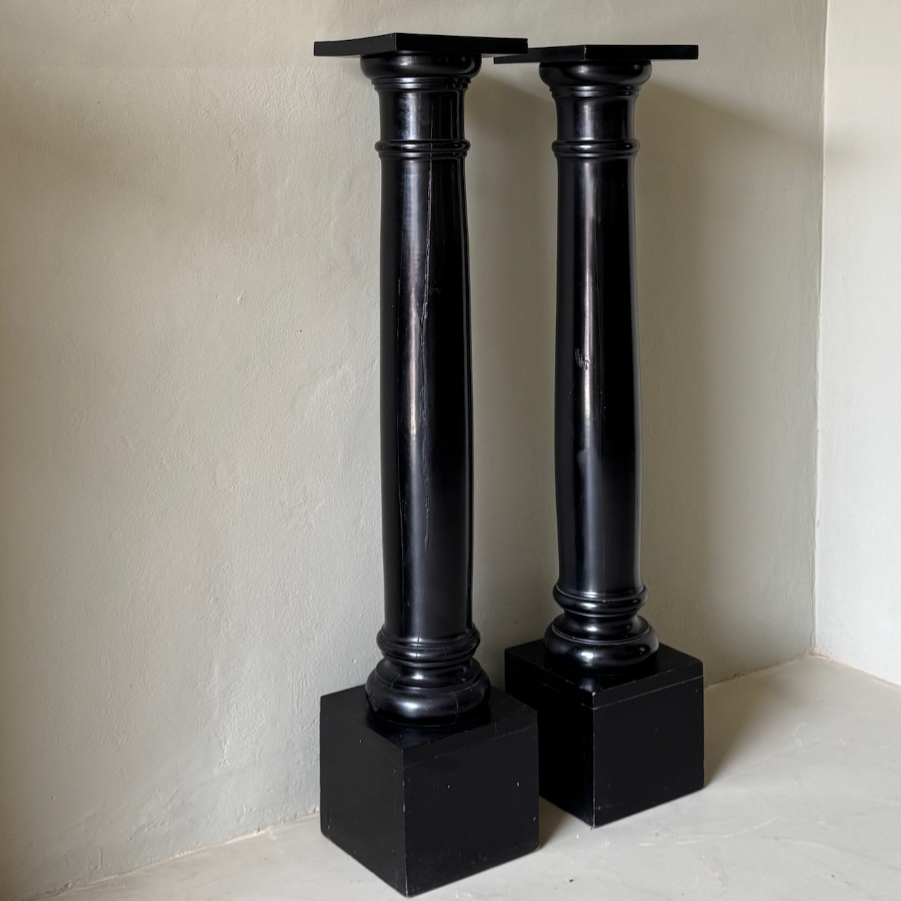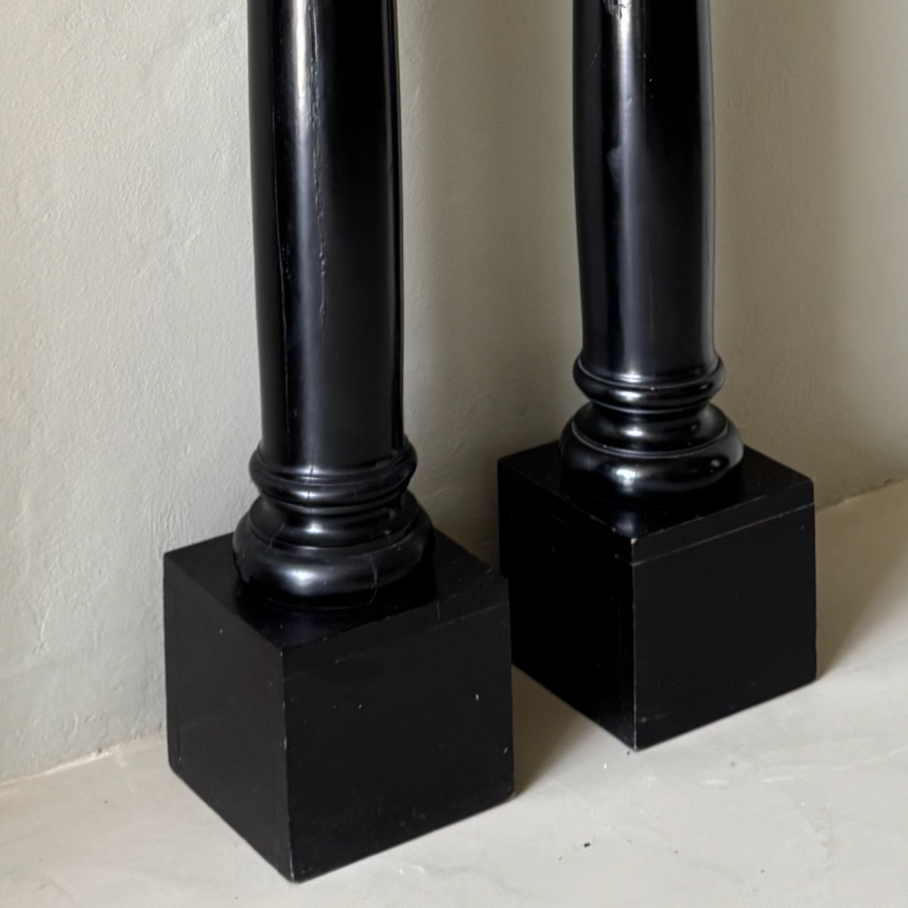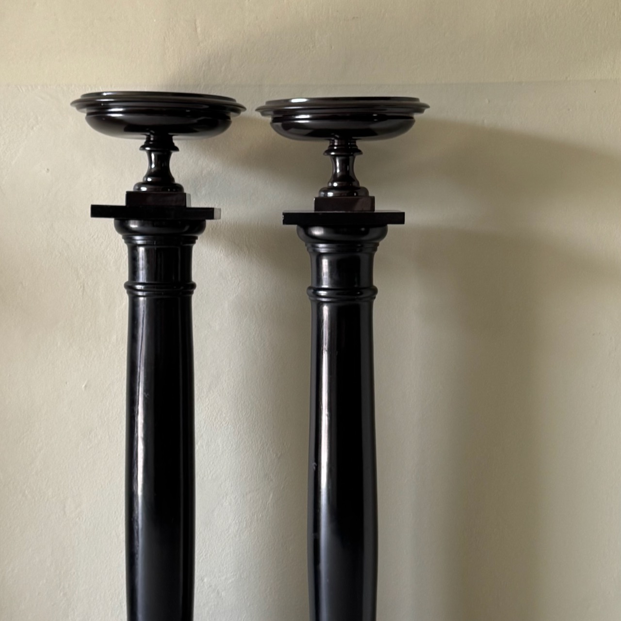 Coppia di colonne neoclassiche di ordine tuscanico in legno di noce tornito ed ebanizzato. Italia, sec. XIX