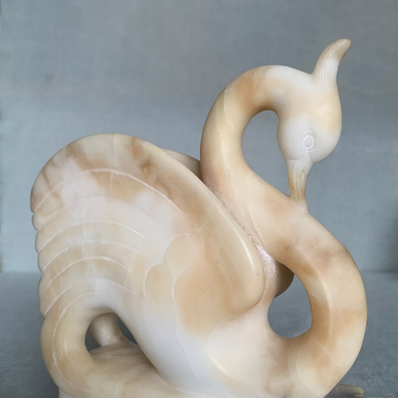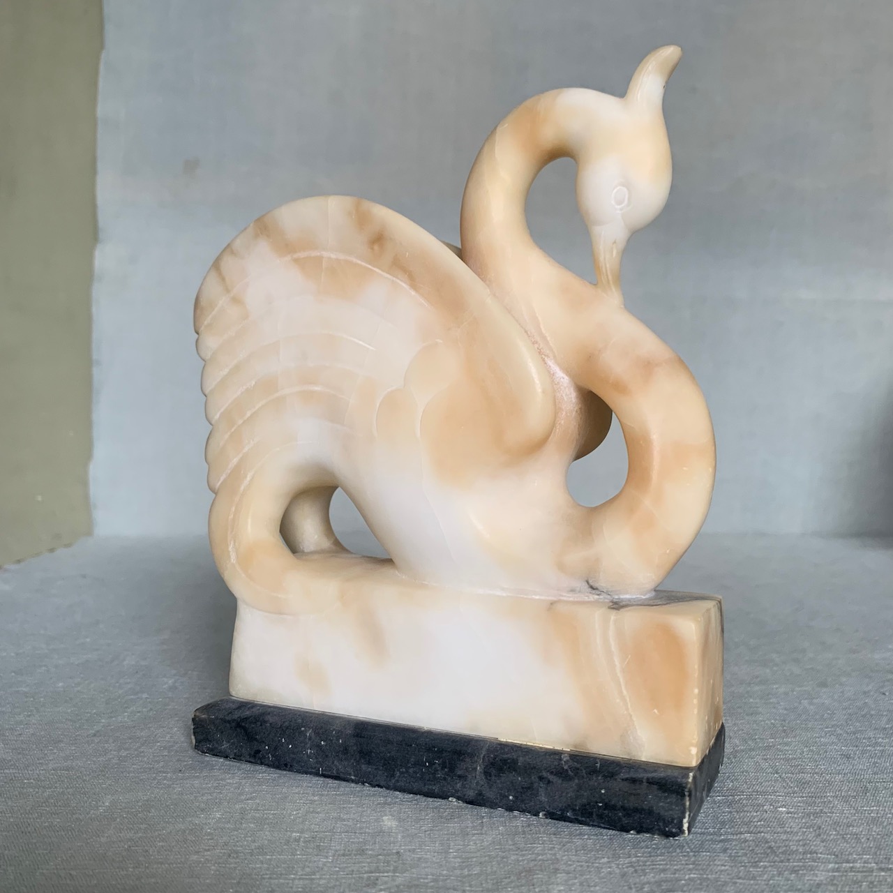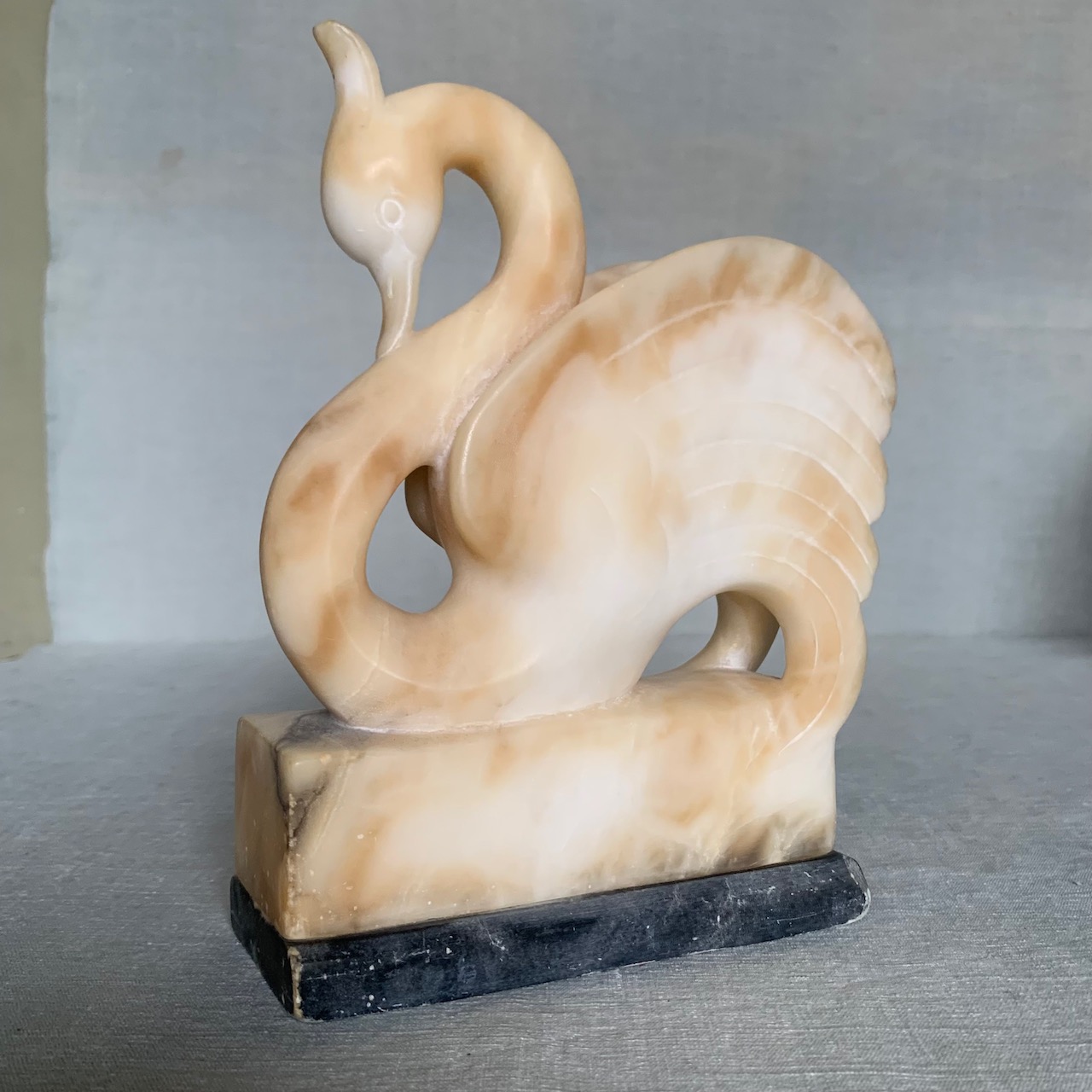 Cigno in alabastro scolpito, su base in marmo bardiglio. Volterra, 1930 circa