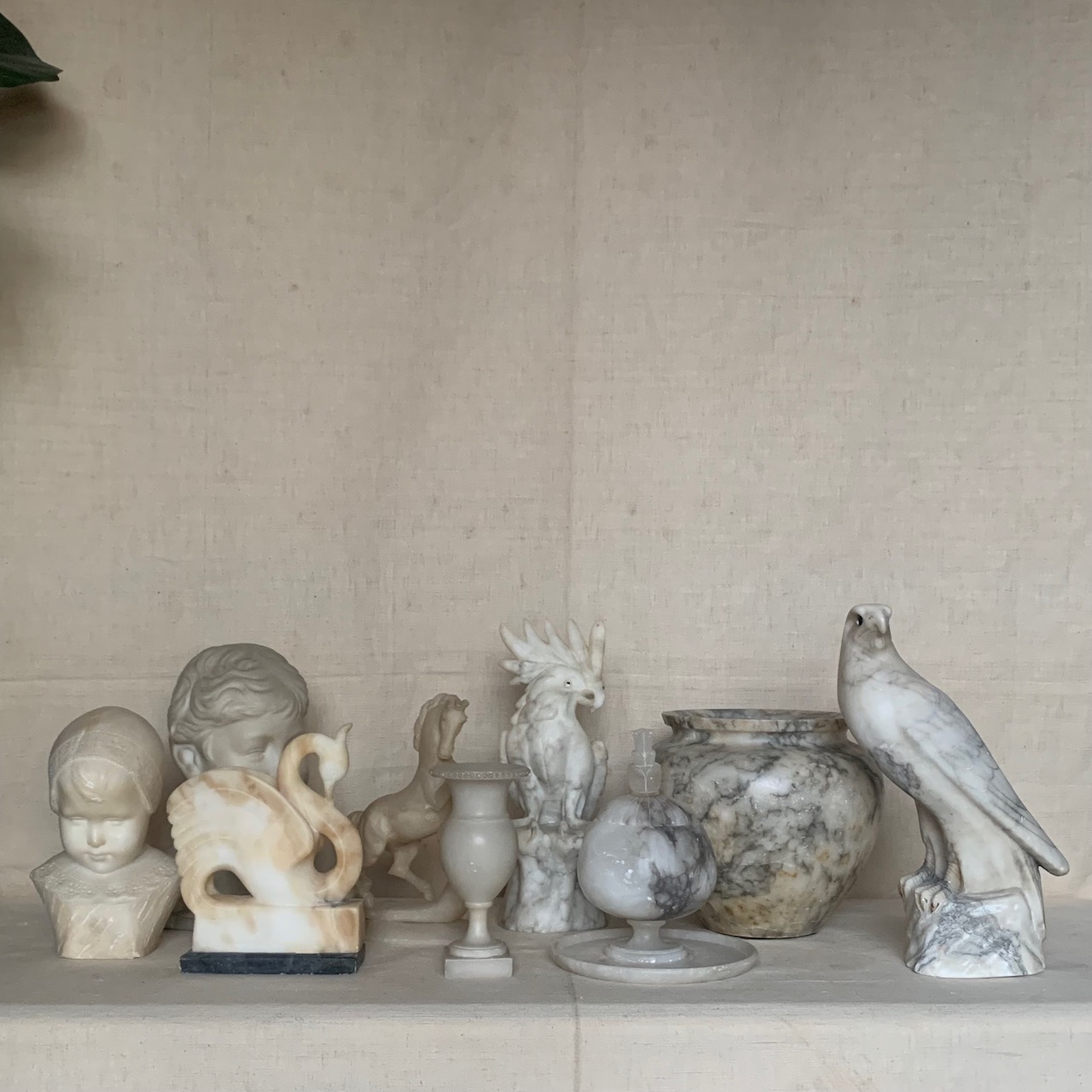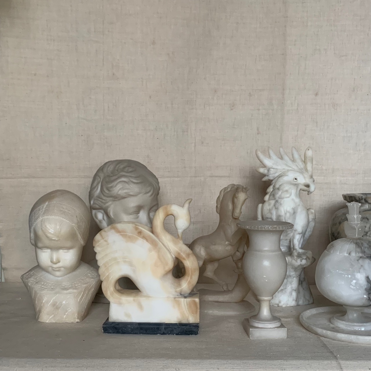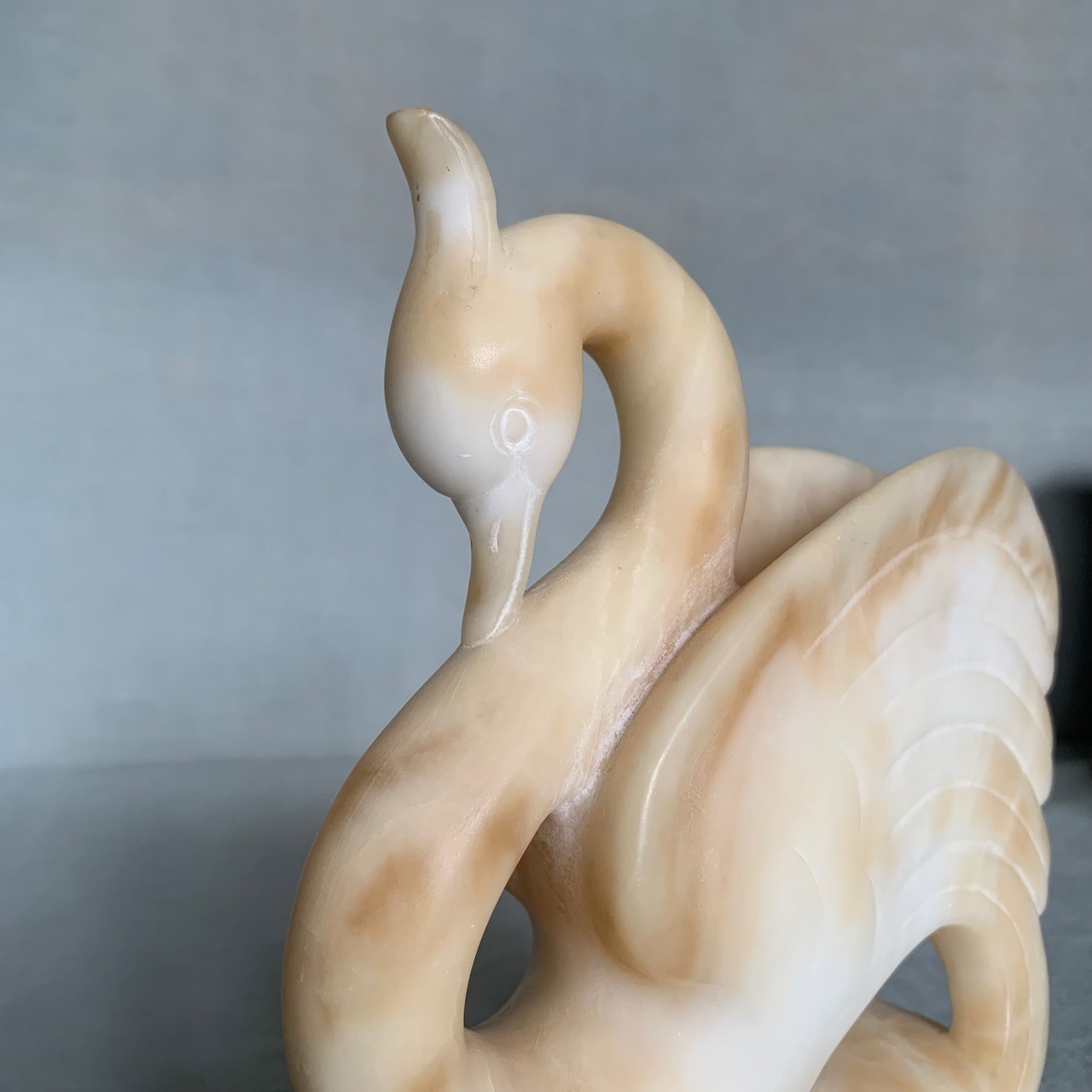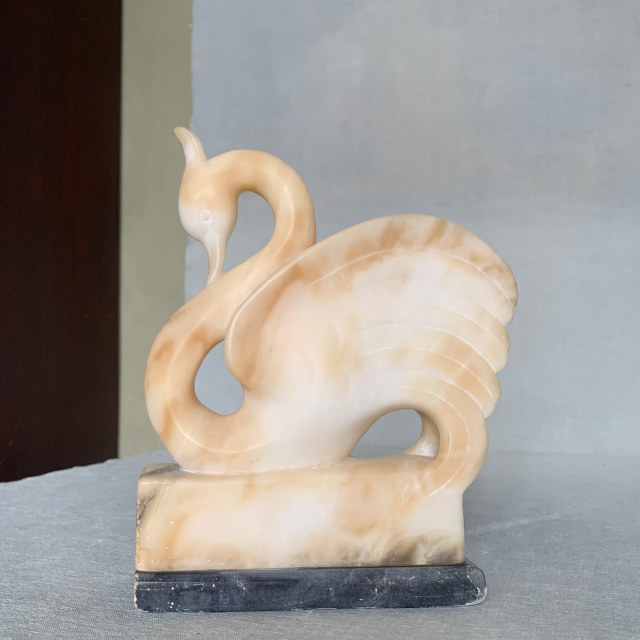 Cigno in alabastro scolpito, su base in marmo bardiglio. Volterra, 1930 circa