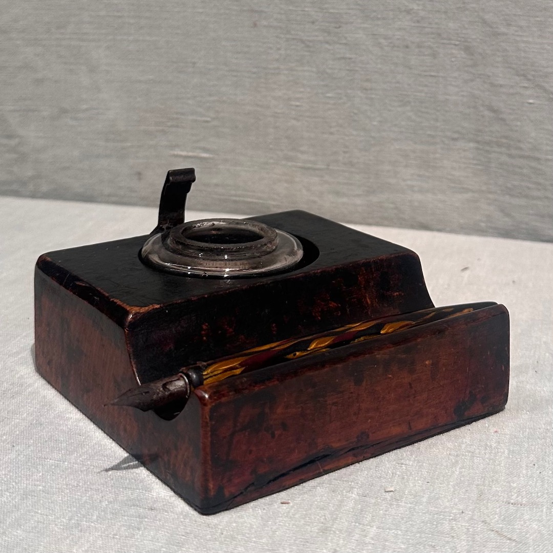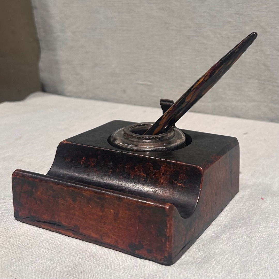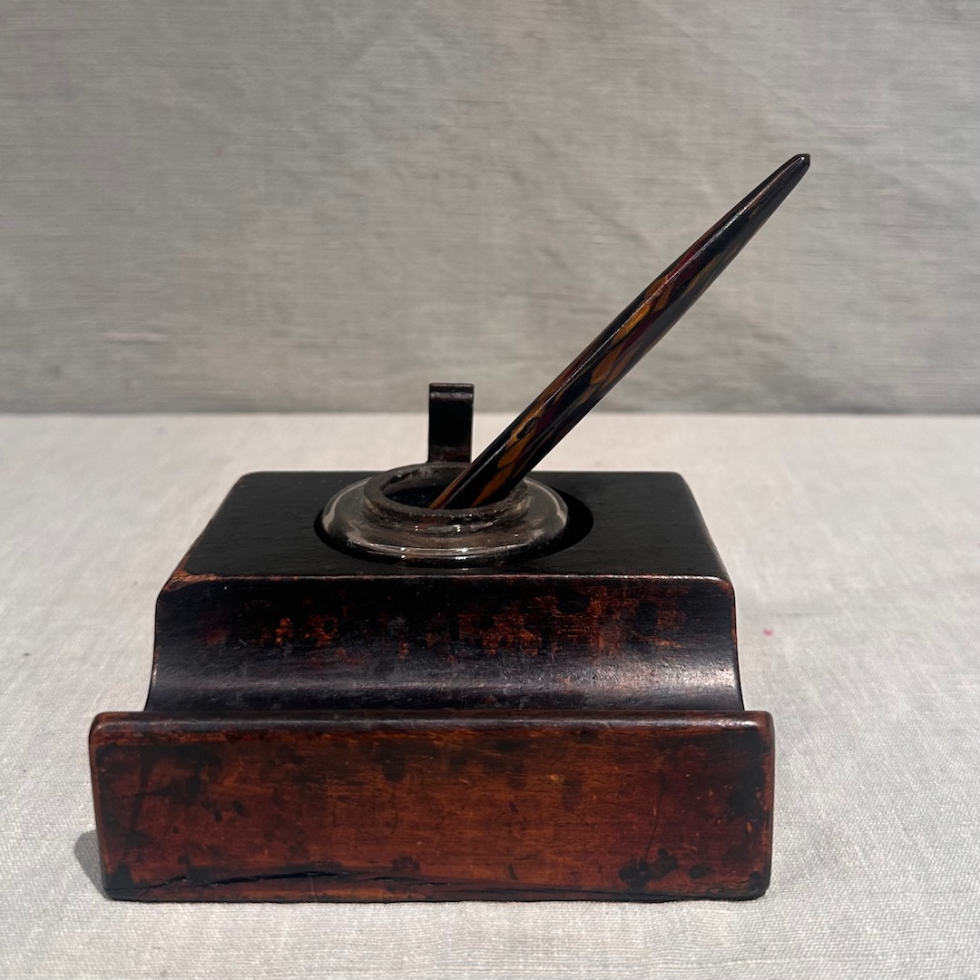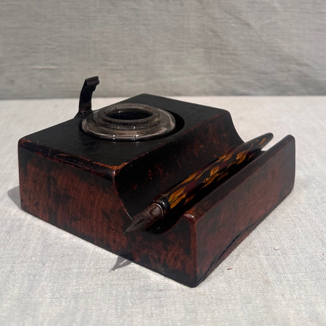 Calamaio in mogano con porta inchiostro in cristallo e piuma in guscio di tarataruga coeva. Italia, sec. XIX