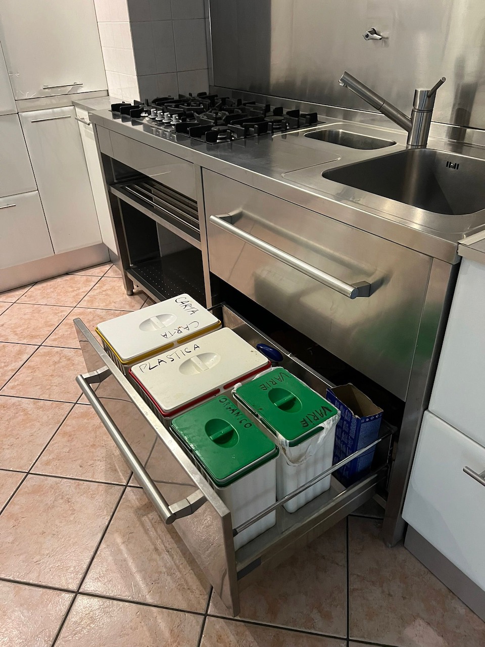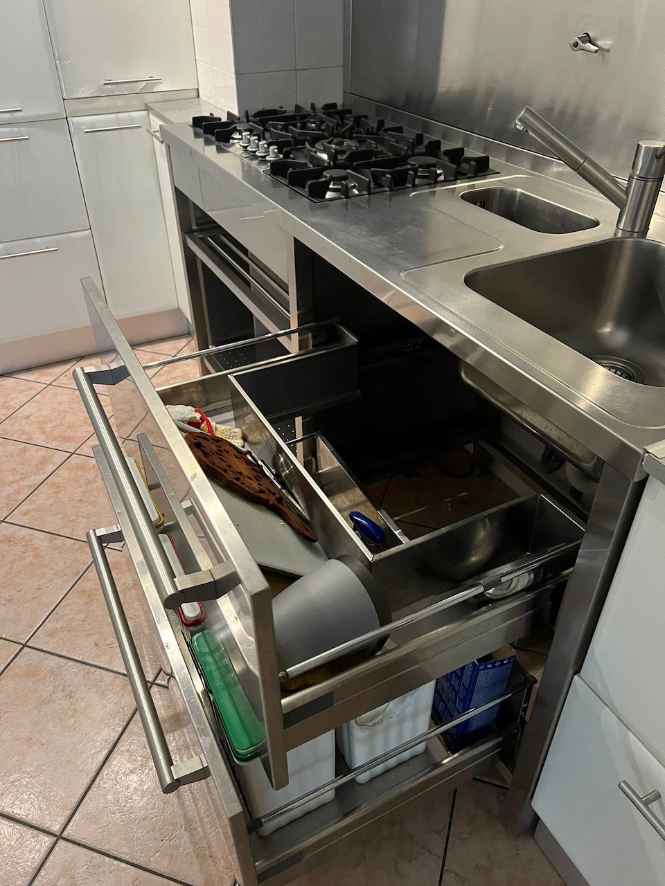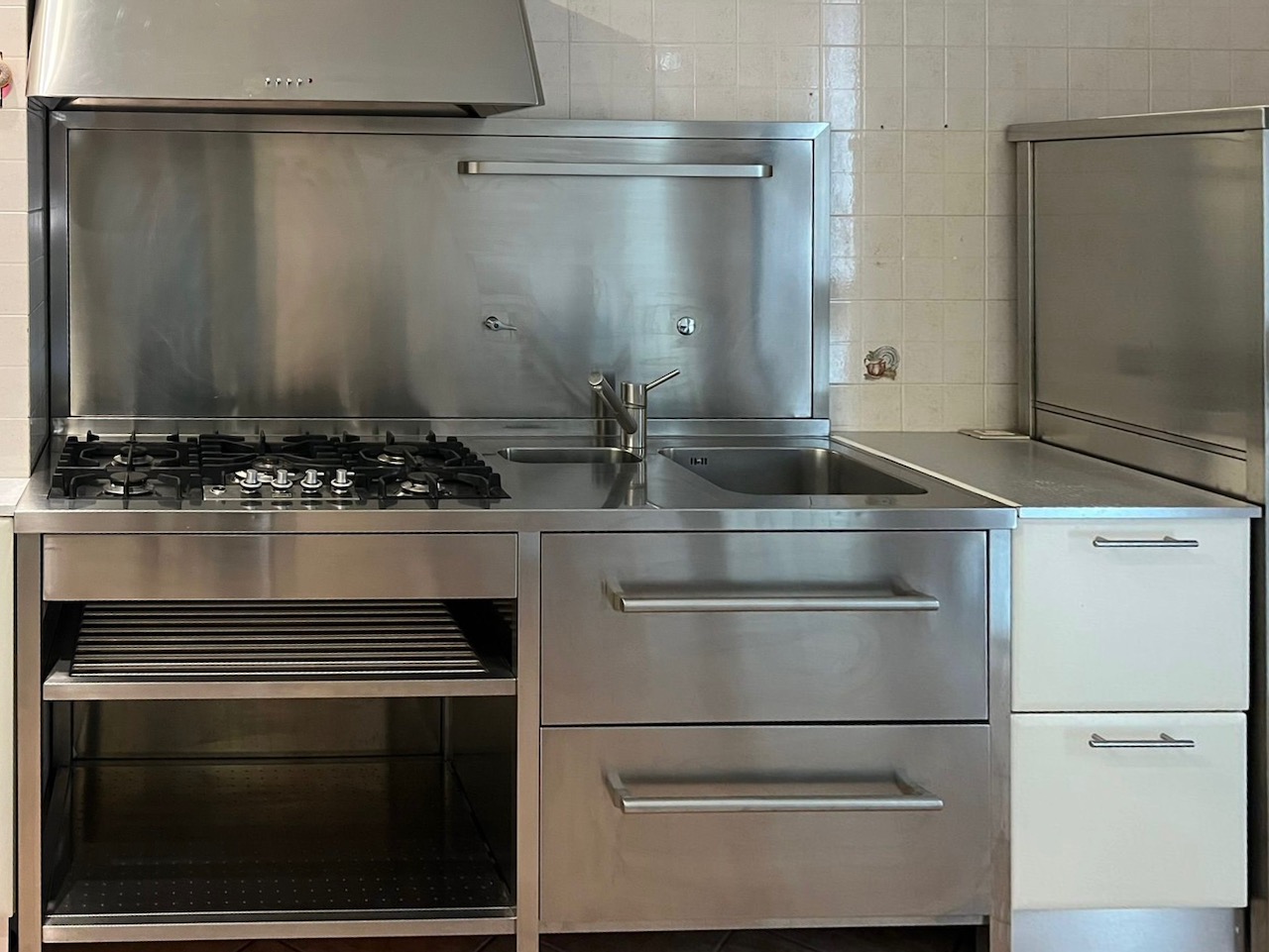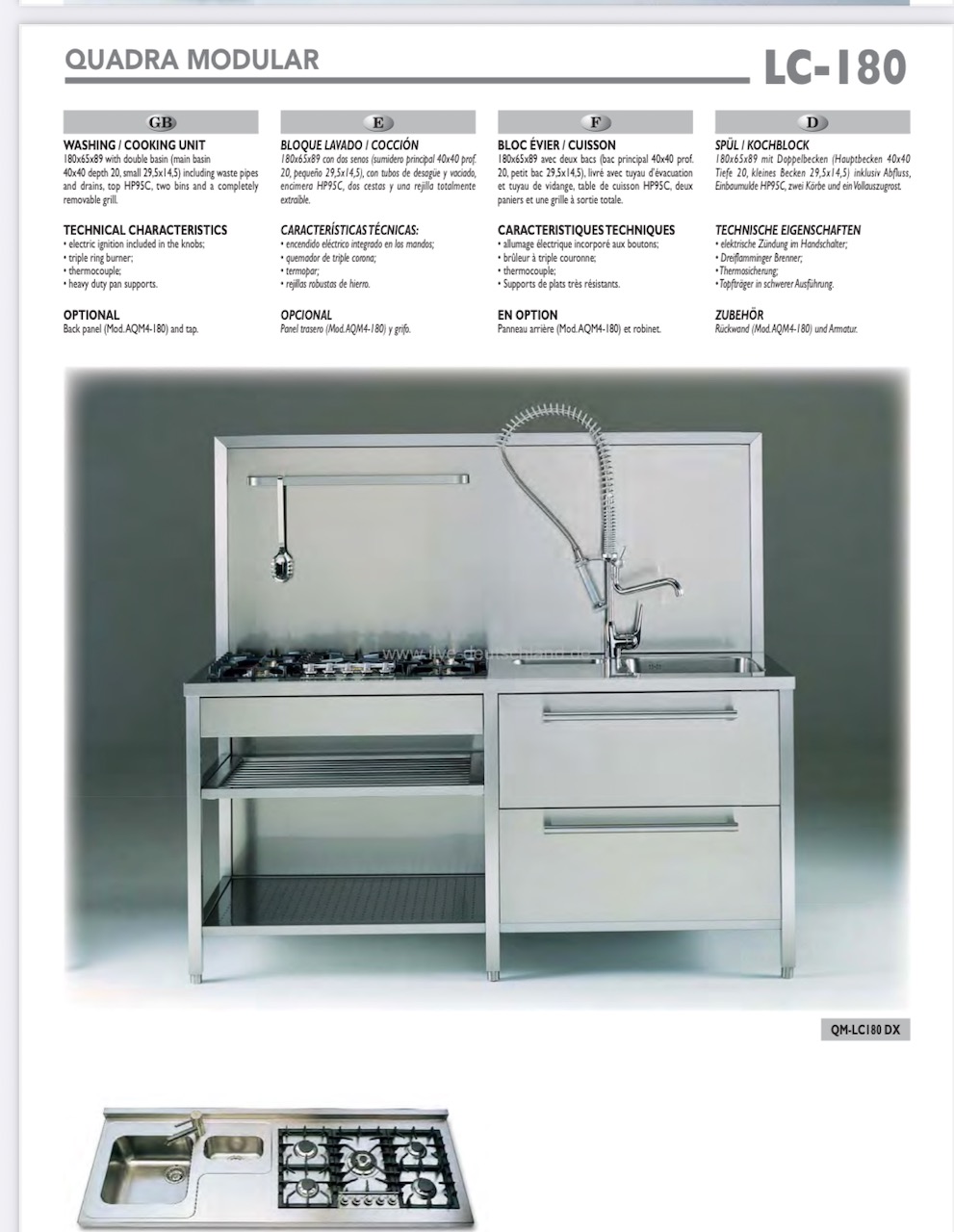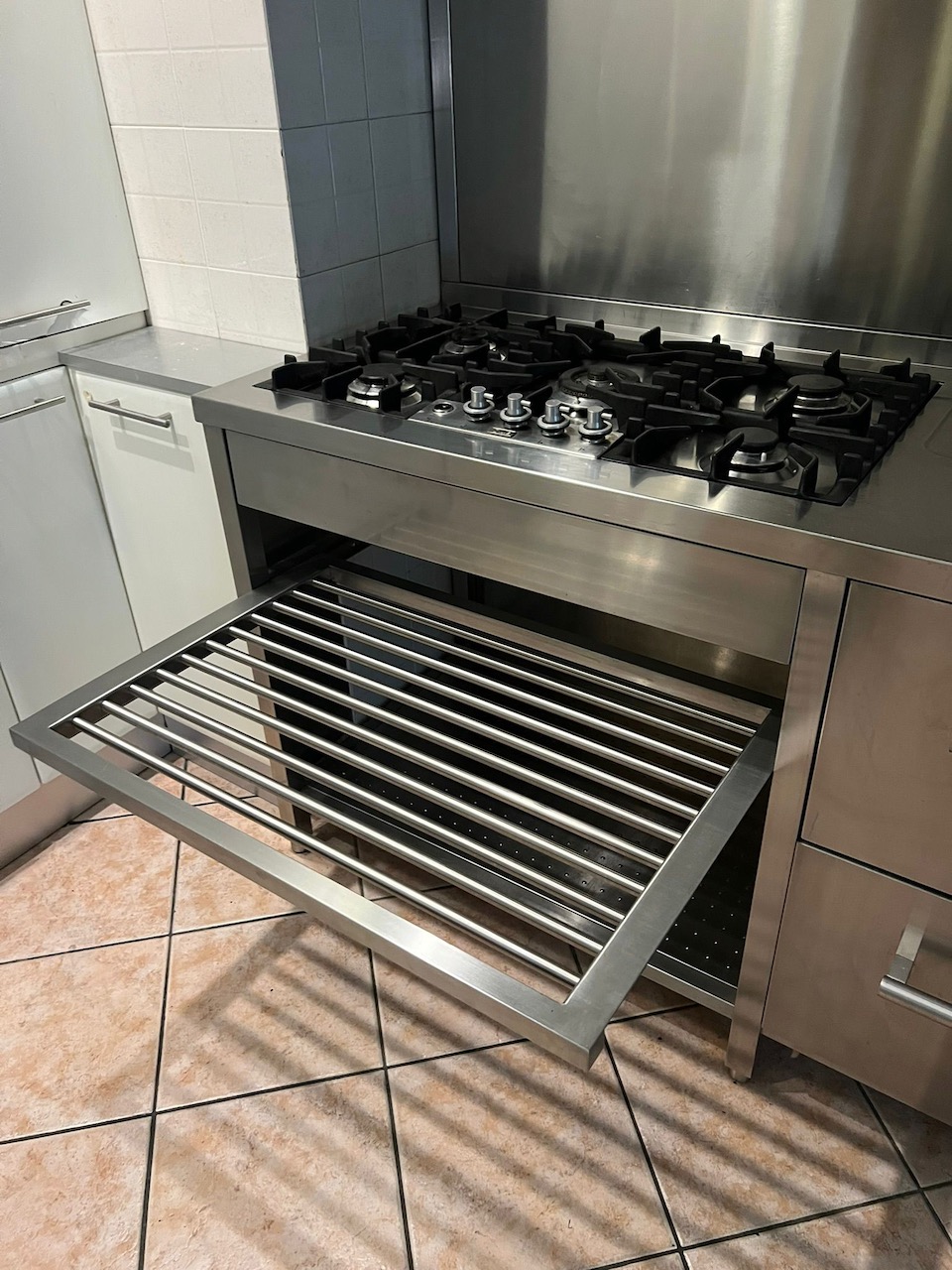 Linea acqua e fuoco, lavaggio e piano cottura. Piano cottura in acciaio inox a cinque fuochi a gas, accensione elettrica inclusa nelle manopole, bruciatore tripla corona, termocoppia, supporti per pentole resistenti, doppio lavello e due cassetti sottostanti, Ilve. Italia, sec. XX