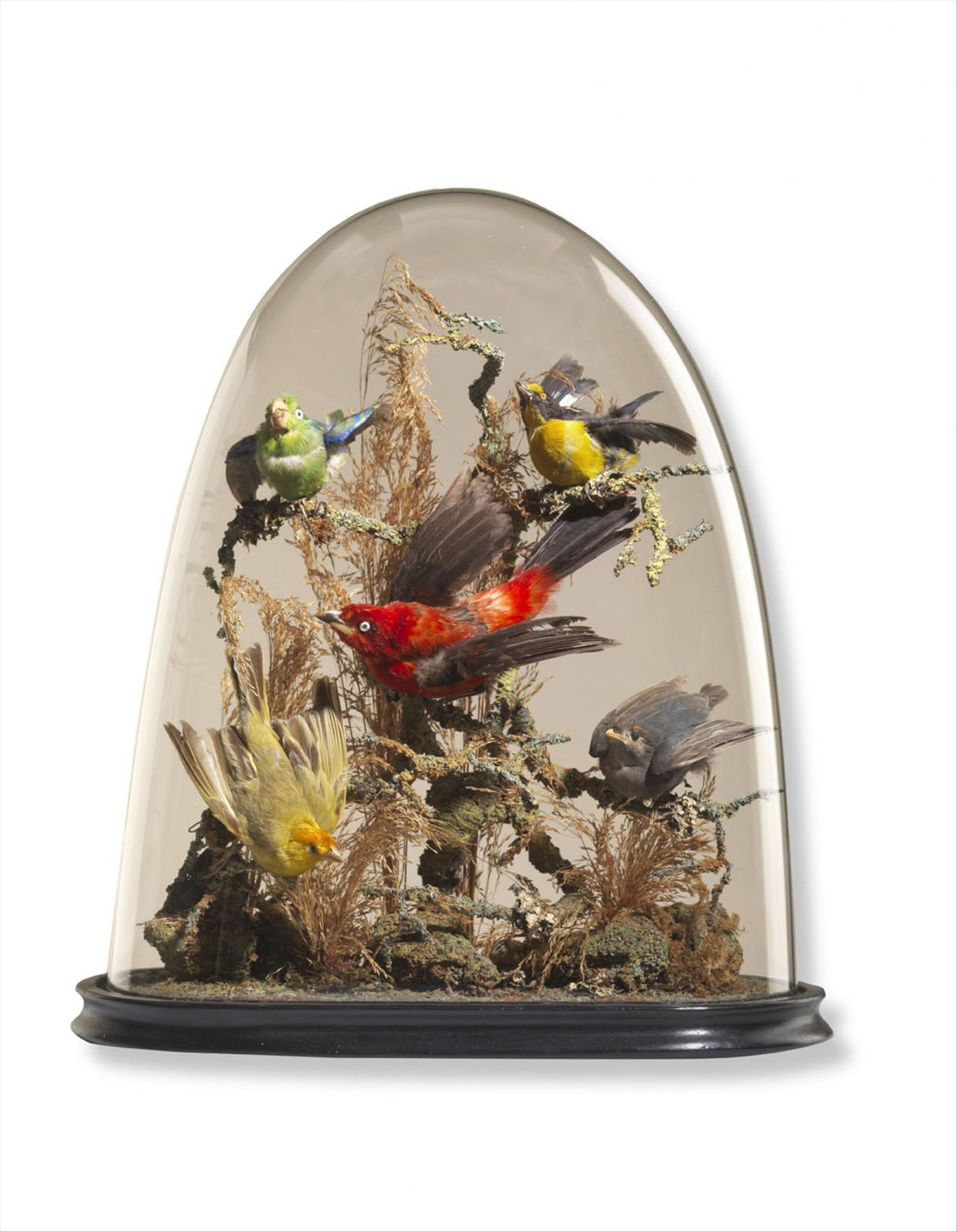 Campana in vetro, su base in legno ebanizzato, con trionfo di cinque uccellini esotici. Inghilterra fine sec. XIX