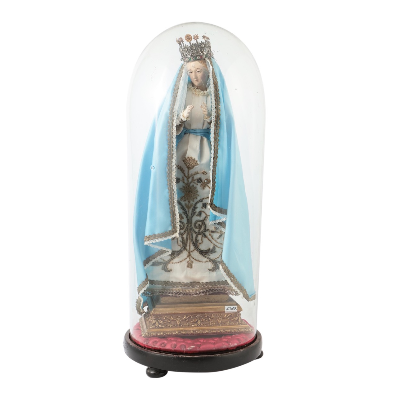 Campana in vetro con cuscino rosso, base in legno. Italia, fine sec. XIX