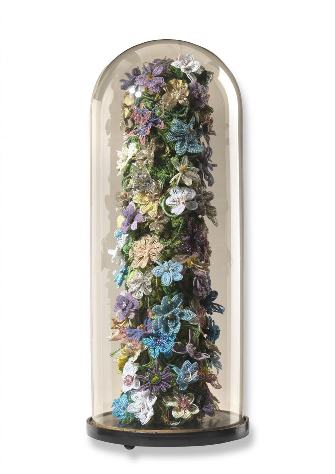 Grande composizione di "Fiori di Venezia" sotto campana in vetro soffiato cilindrica, su base in legno ebanizzato. Italia seconda metà sec. XIX