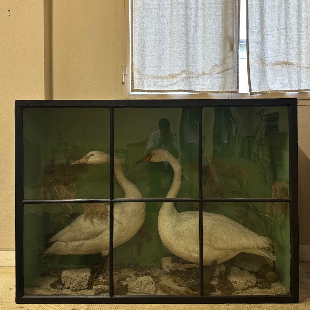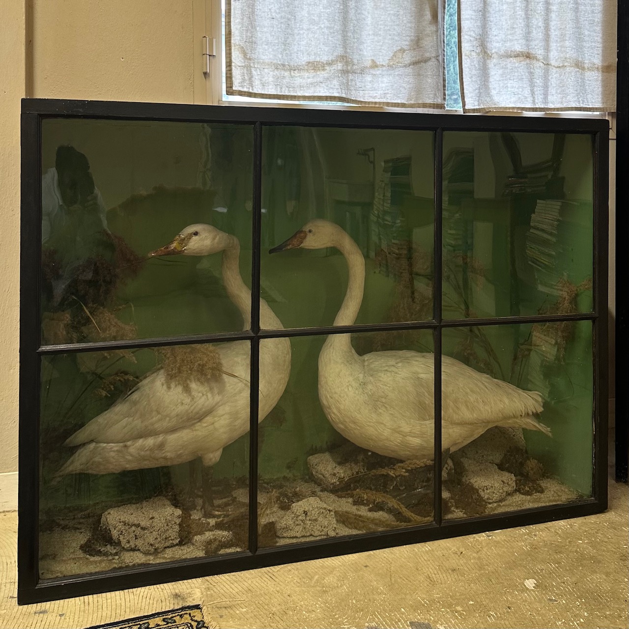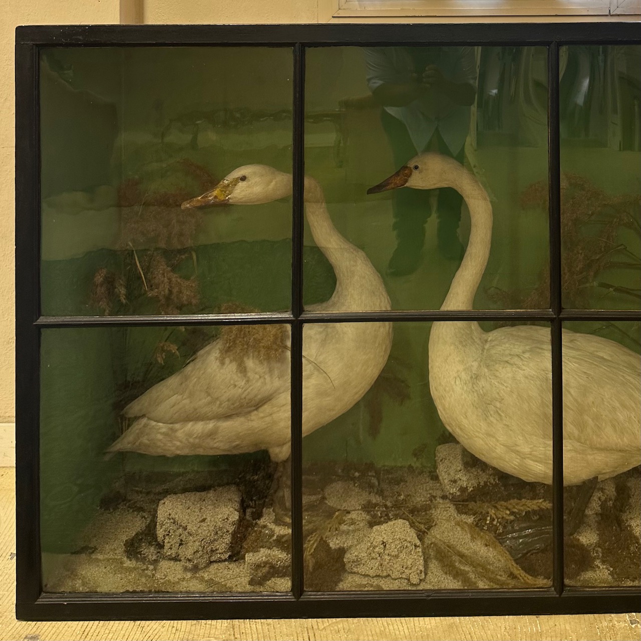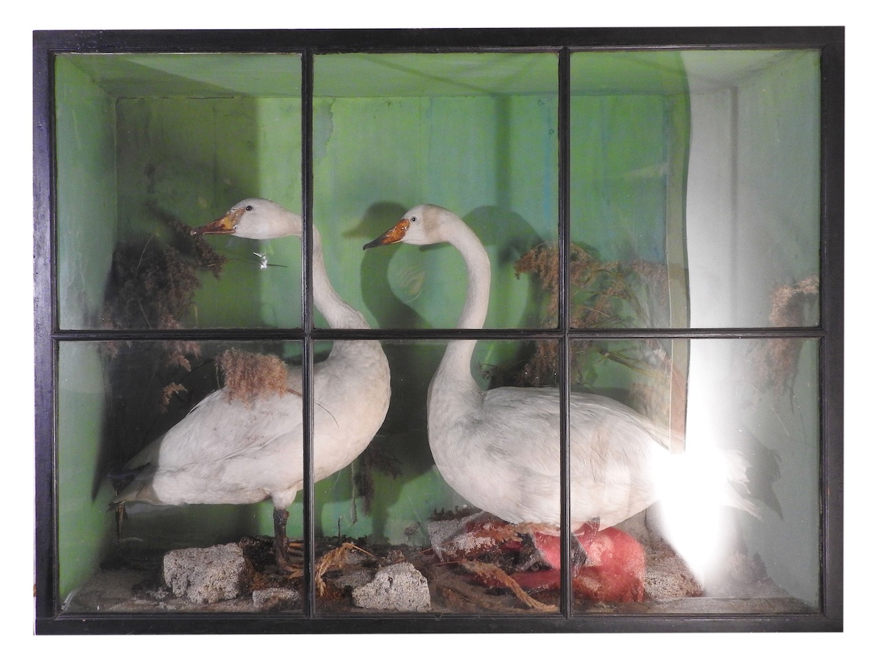 Grande teca in legno ebanizzato, due oche impagliate entro paesaggio. Inghilterra, sec. XX