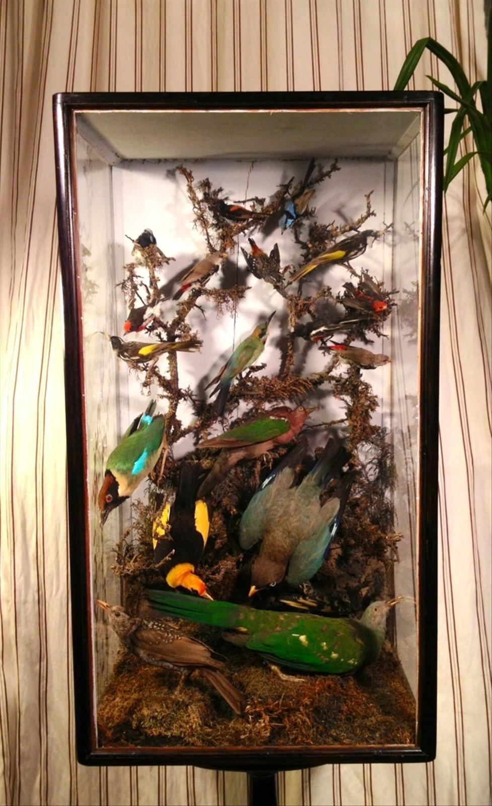Teca in vetro e legno di rovere ebanizzato, con trionfo di diciannove uccellini esotici. Inghilterra fine sec. XIX