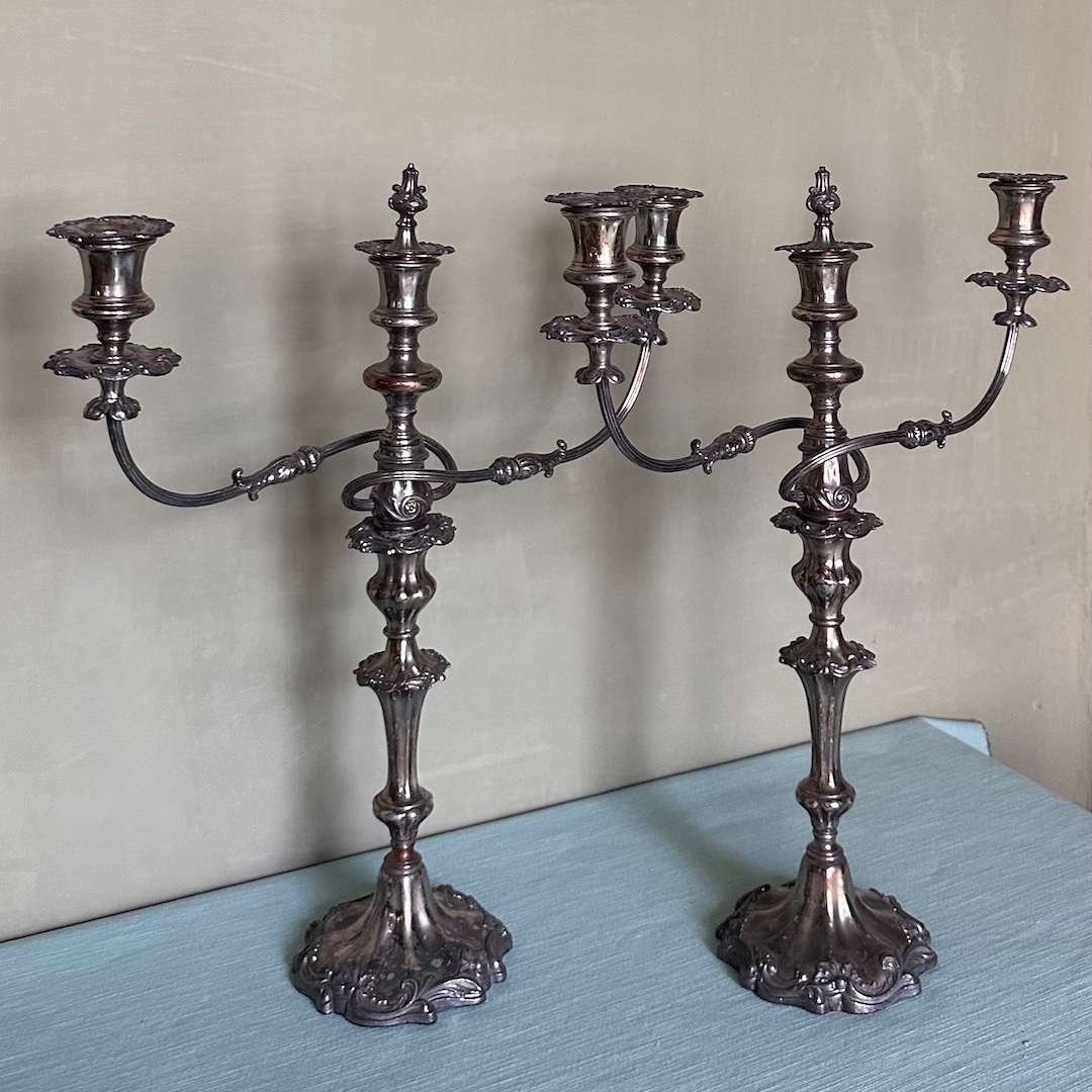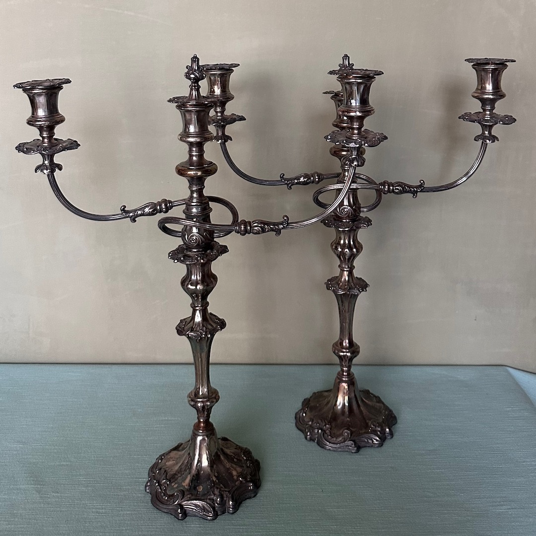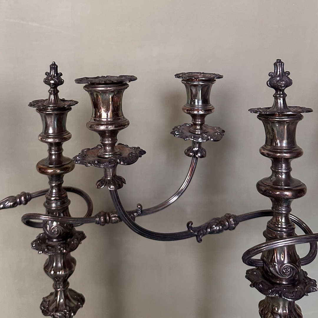 Coppia grandi candelabri argento su rame a tre luci, bracci portacandele mossi a intreccio. Inghilterra, fine sec. XIX